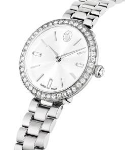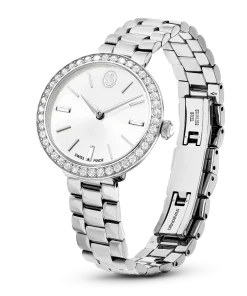 Blending Swarovski radiance with contemporary design,this Certa watch is the perfect fusion of artistry and functionality. The 30mm stainless steel case features a bezel set with a shimmering pavé of 42 crystals,while on the radiant sunray dial,there is an elegant swan logo at 12 o’clock and three index markers crafted from individual baguette-cut crystals. A single crystal is set within the crown,and the three-link metal bracelet provides a comfortable fit around the wrist. This Swiss made watch is water resistant to 50 meters and is a timeless choice to complement your everyday style.