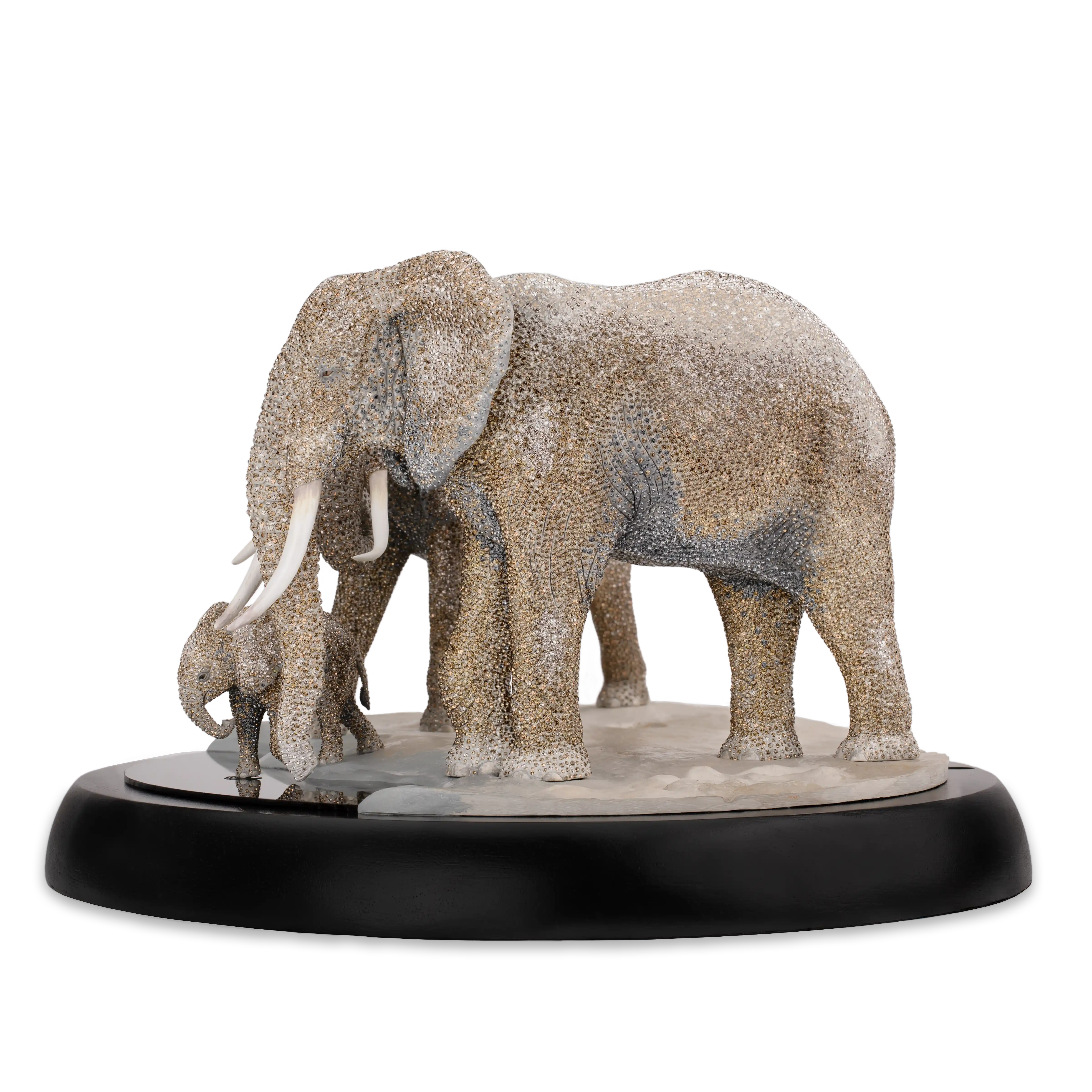 Inspired by African nature,this spectacular Limited Edition shows an elephant family cooling down at a watering hole. Shimmering in a gorgeous array of gray and metallic tones,the mother,grandmother,and baby elephant are embellished by hand with more than 71,000 crystals using our signature Pointiage® technique. The name Kujali means ‘caring’ – a reference to the strong family bonds formed by these beautiful creatures – and the base is crafted from rubber wood. Limited to 250 editions worldwide,this exceptional technical masterpiece comes with a certificate of authenticity and a premium blue suitcase. Decoration object. Not a toy. Not suitable for children under 15.