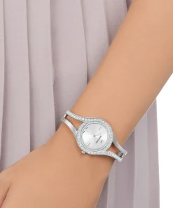 Elevate your summer style with this fluid and modern watch. Featuring two pavé lines on the bezel and asymmetric cutouts,it’s a fresh take on classic sparkle. The stainless steel case and bracelet perfectly complement the 112 clear crystals,and the white silver-tone sunray dial. Whatever the occasion,it will add contemporary edge to timeless styling. The bracelet length can be easily adjusted. Specifications: Case – 30 mm; Water resistant up to 50 m; Swiss made.