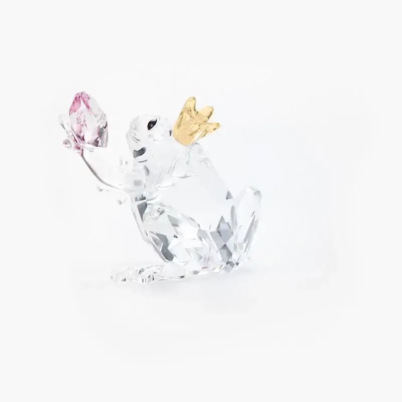 Made with love for lovers,the sparkling Frog Prince by Swarovski is a charming collectable with a smiling face and friendly jet black eyes. It is made from sparkling crystals with 245 facets that reflect incoming light beautifully. The figurine holds a rose-colored crystal heart in its hand,while the crown shines with a golden shadow effect. A lovely gift for romantic occasions. Decoration object. Not a toy. Not suitable for children under 15.