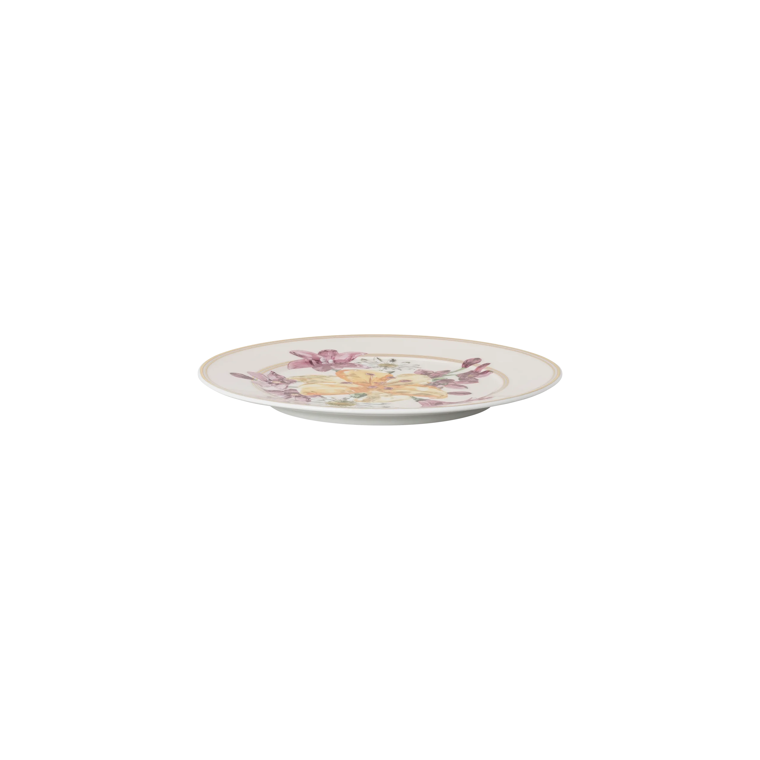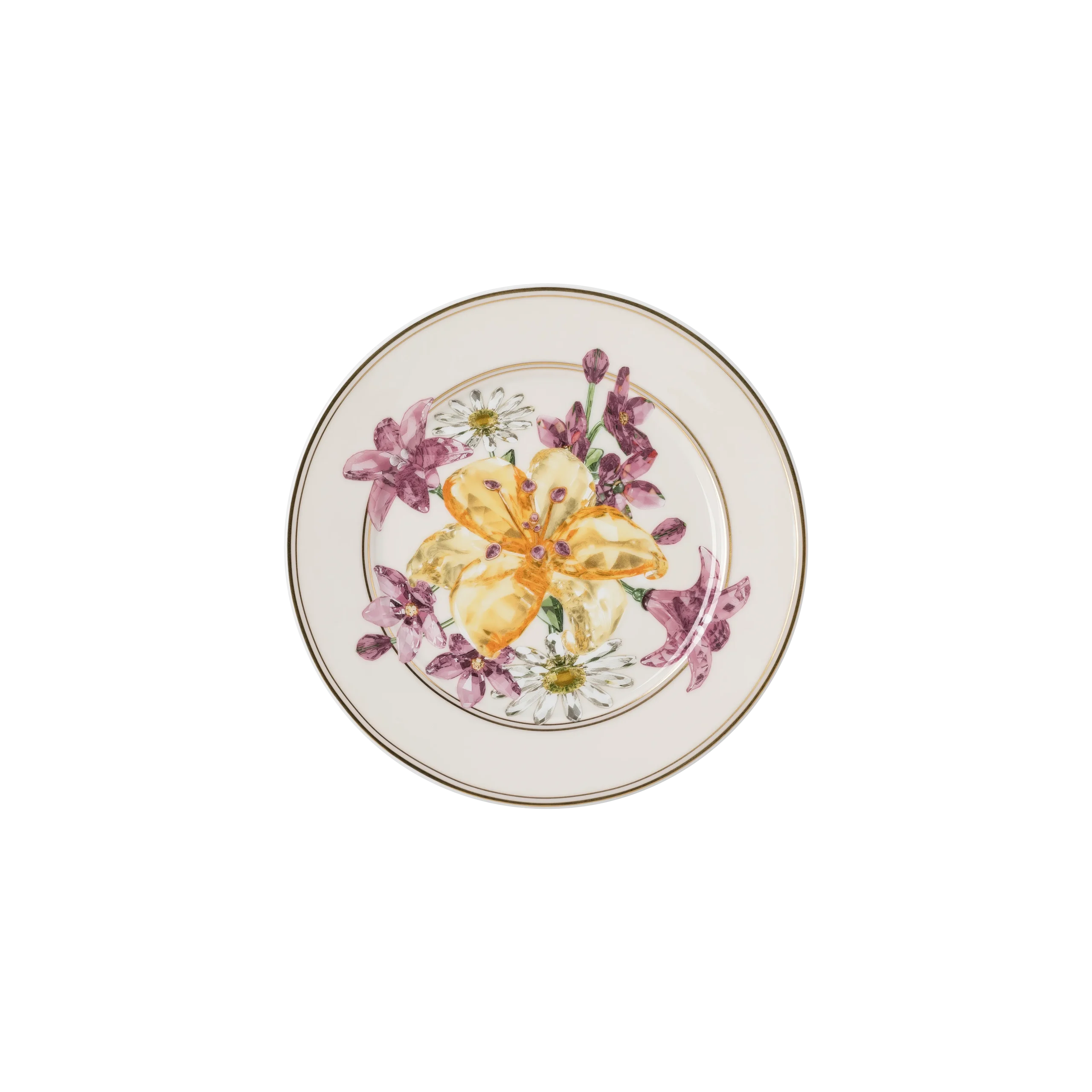 Crafted with elegance and natural inspiration,this marshmallow Idyllia bread plate is designed with a bright bouquet of flowers at the center. Created in partnership with porcelain brand Rosenthal,the floral motif has been printed using an exclusive technique that captures the essence and radiance of crystals. It is further decorated with fine gold-tone lines for a beautiful finish. This bread plate is dishwasher safe,but not suitable for use in a microwave.