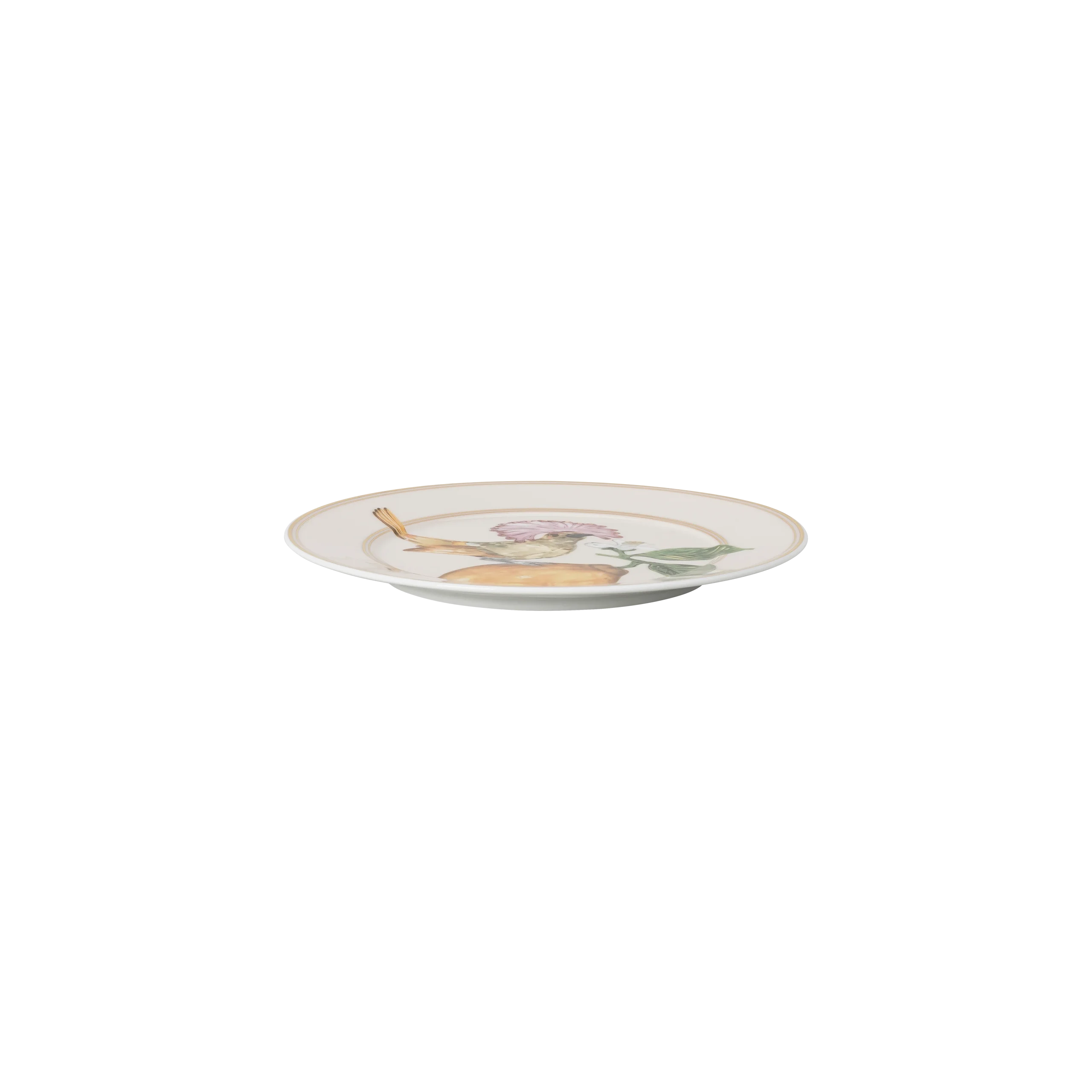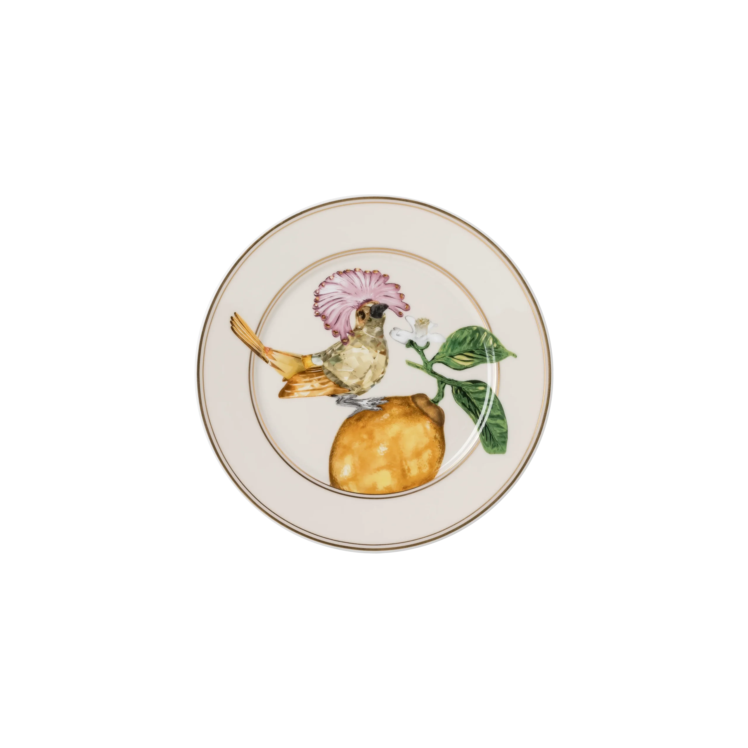 Crafted with elegance and natural inspiration,this marshmallow Idyllia bread plate is designed with a majestic royal flycatcher perching on a lemon. Created in partnership with porcelain brand Rosenthal,the motif has been printed using an exclusive technique that captures the essence and radiance of crystals. It is further decorated with fine gold-tone lines for a beautiful finish. This bread plate is dishwasher safe,but not suitable for use in a microwave.
