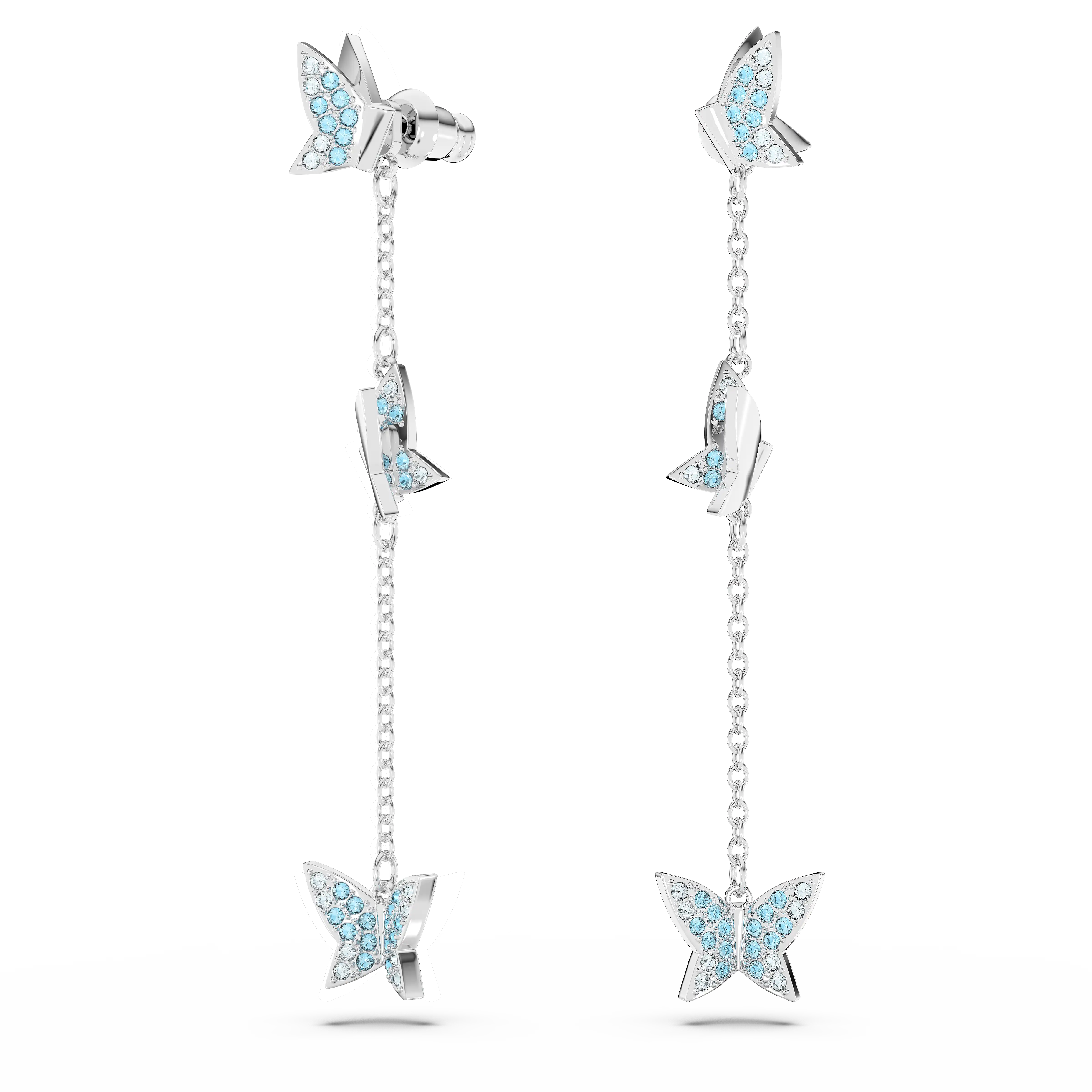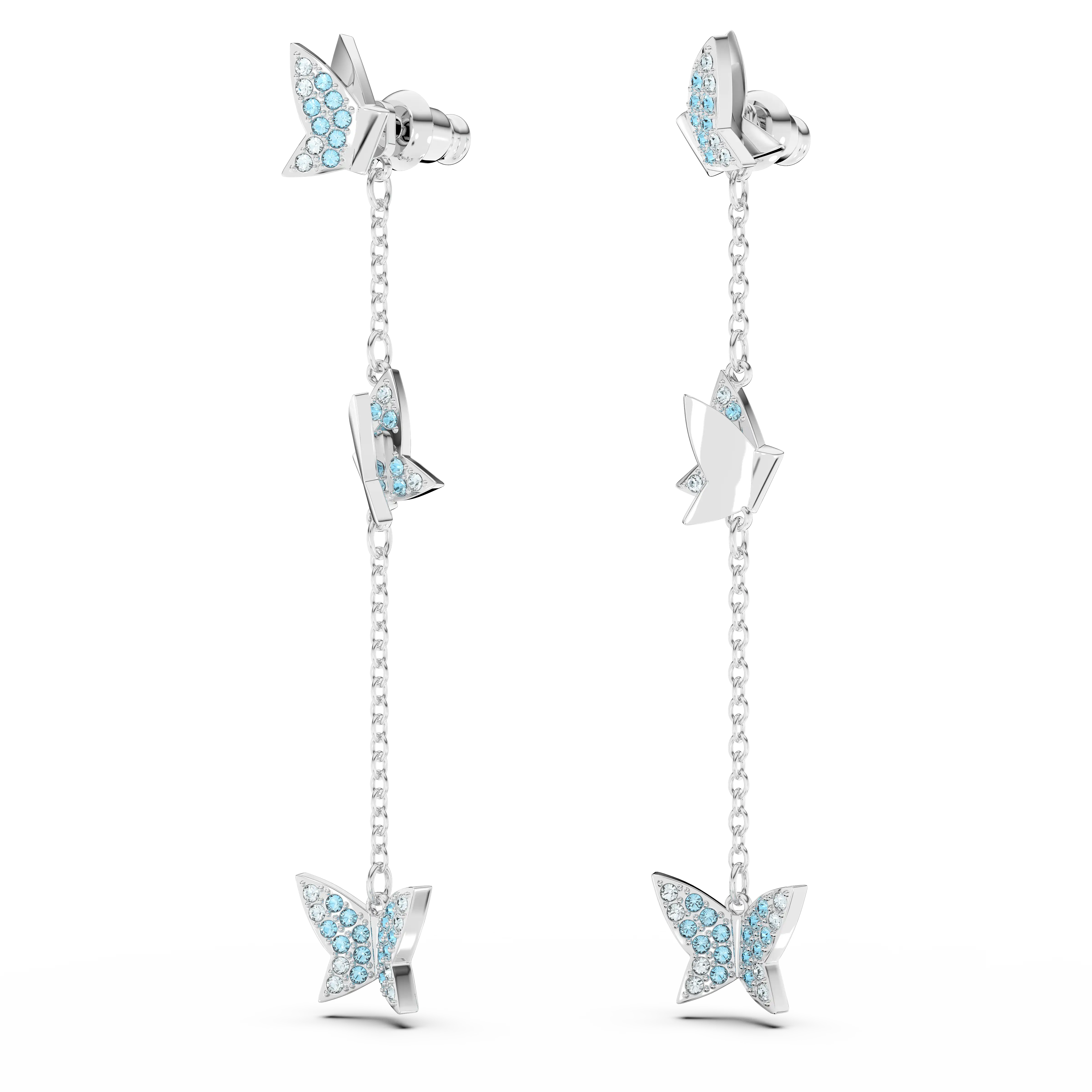 These nature-inspired earrings put our playful butterfly in motion. Suspended on a rhodium plated drop design the butterflies catch the light from all angles in shimmering blue pavé. This versatile style can also be worn as studs but detaching the drop chain – the choice is yours.
