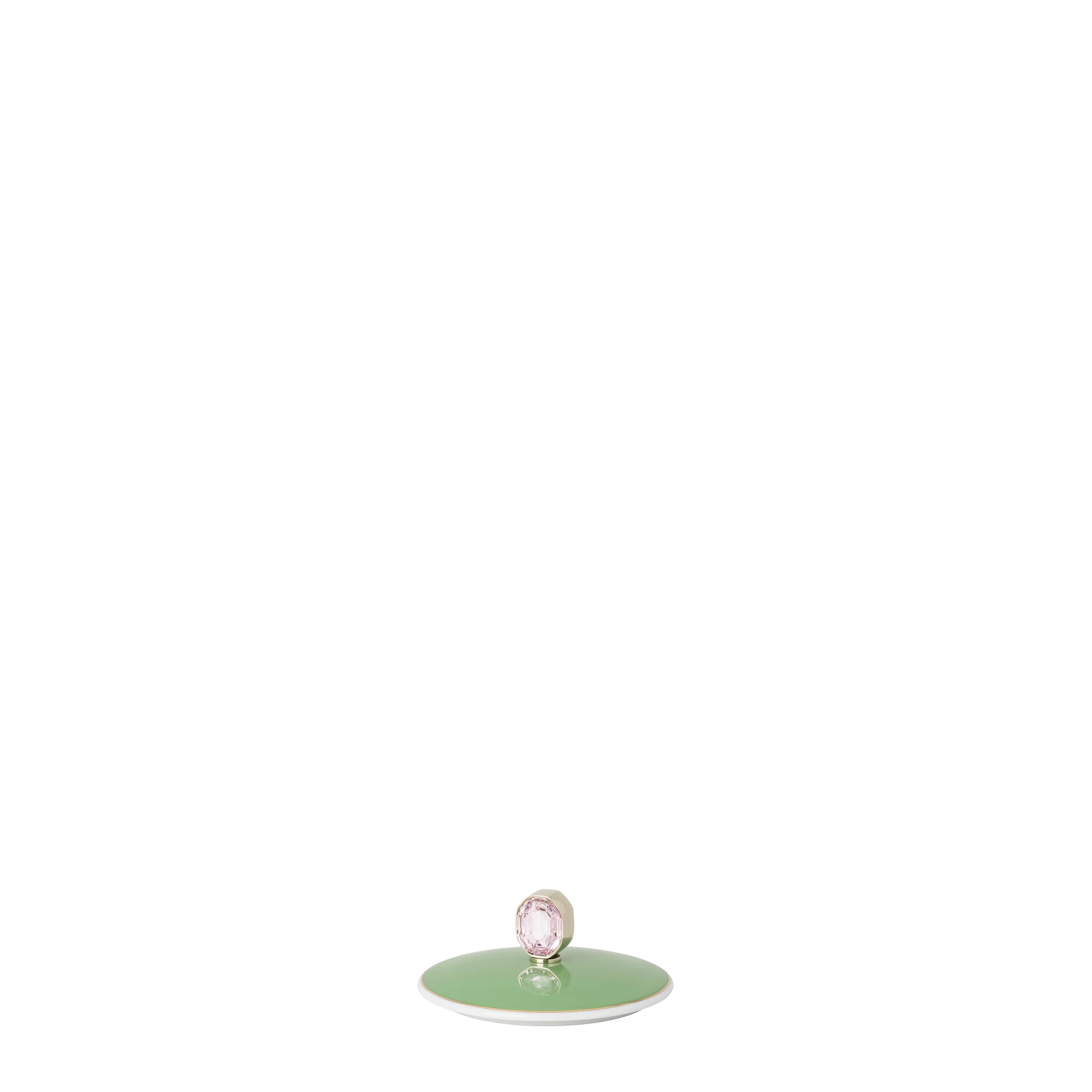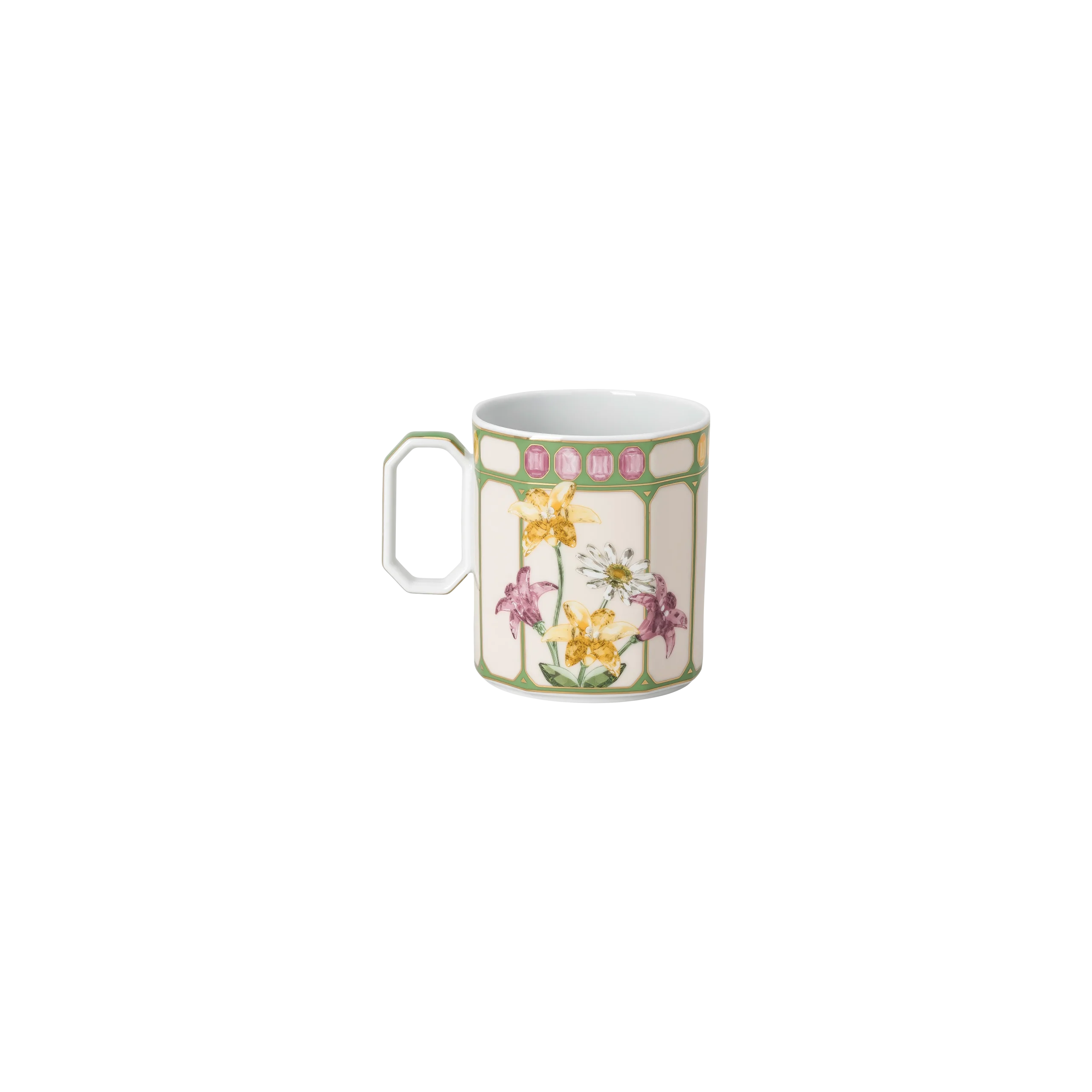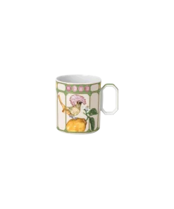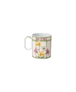 Inject your dinnerware with exuberance thanks to this faceted Idyllia mug. One side displays a bright bouquet of flowers,while on the other side there is a royal flycatcher perching on a lemon. These joyful motifs are printed on the green and marshmallow porcelain using an exclusive technique that captures the essence and radiance of crystals. Created in partnership with porcelain brand Rosenthal,the mug is further decorated with fine gold-tone lines and an octagonal pink crystal on the lid. This product is dishwasher safe,except for the lid,and should not be used in a microwave.