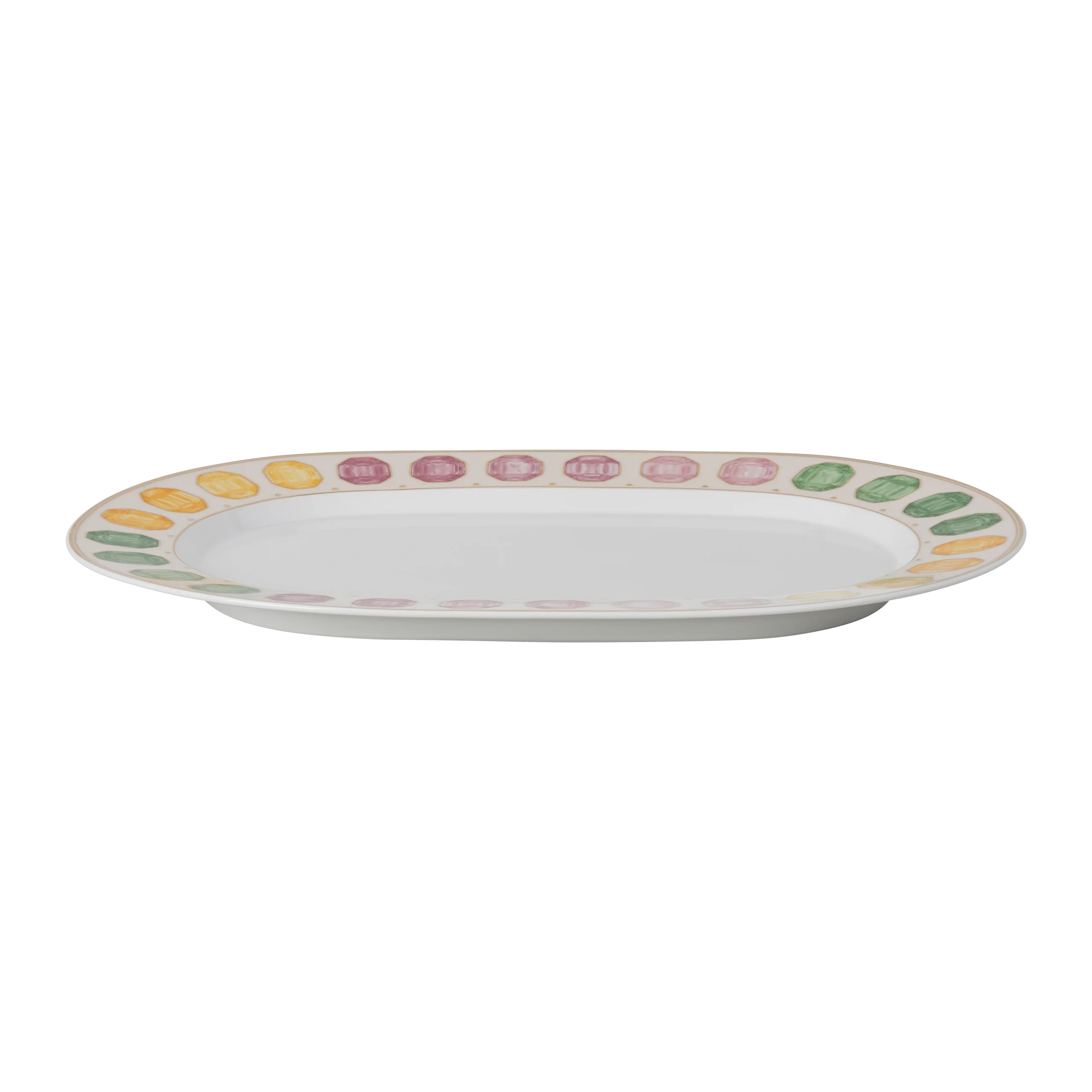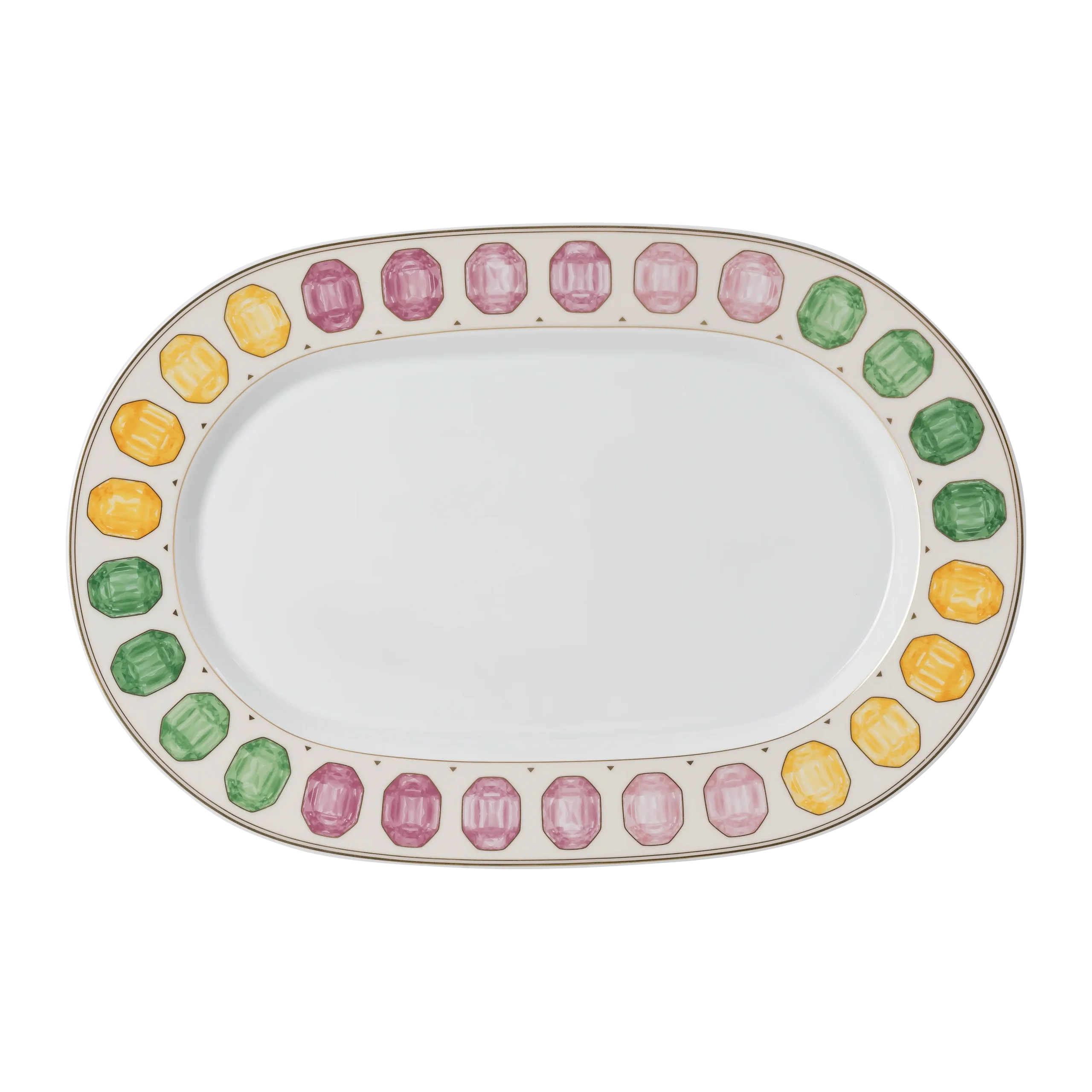 Create a full serving of joy with this Idyllia large platter. Using an exclusive technique,the marshmallow porcelain is printed with a special gemstone motif that captures the essence and radiance of crystals. Created in partnership with porcelain brand Rosenthal,it is further decorated with fine gold-tone lines,giving you a vibrant way to style your table. This large platter is dishwasher safe,but not suitable for use in a microwave.