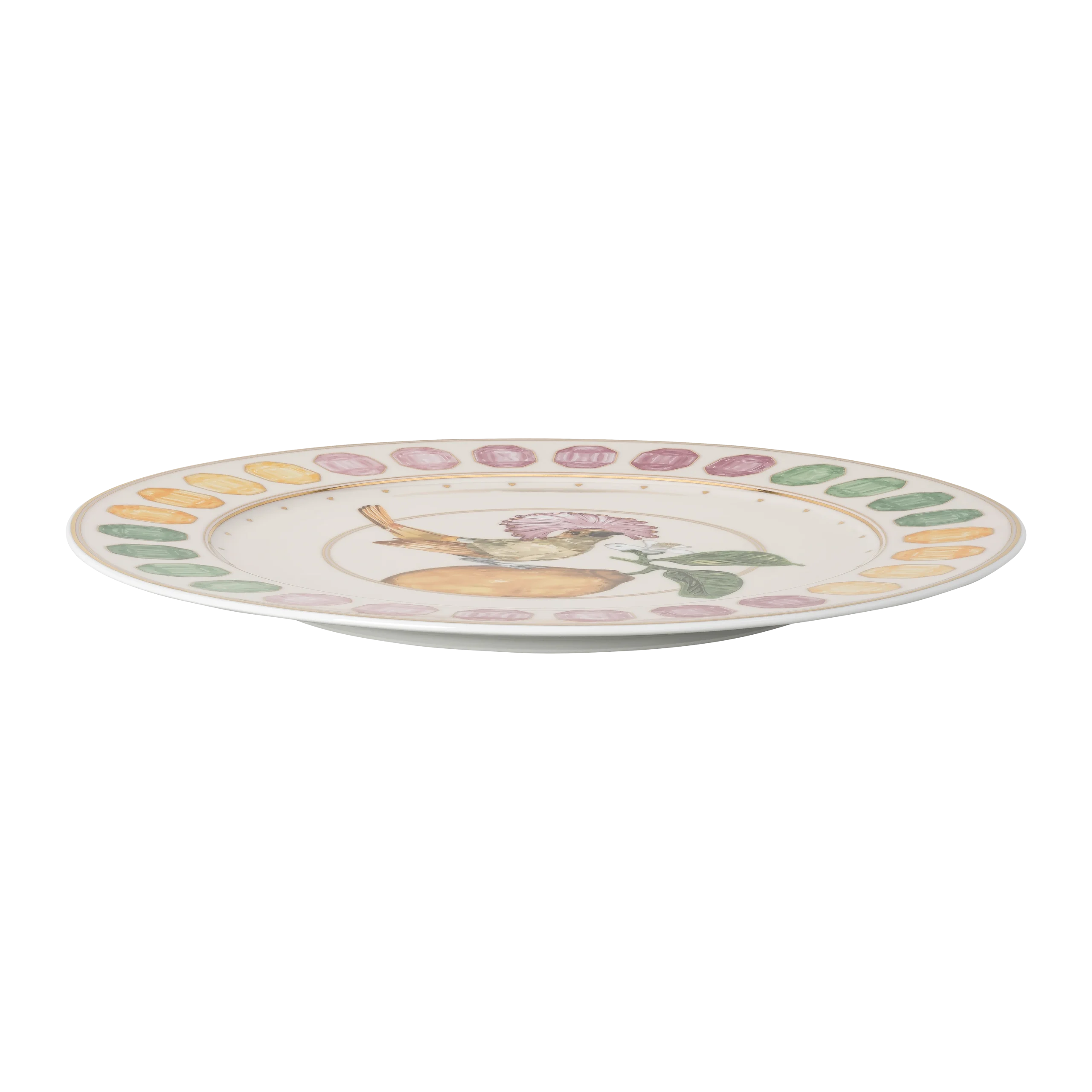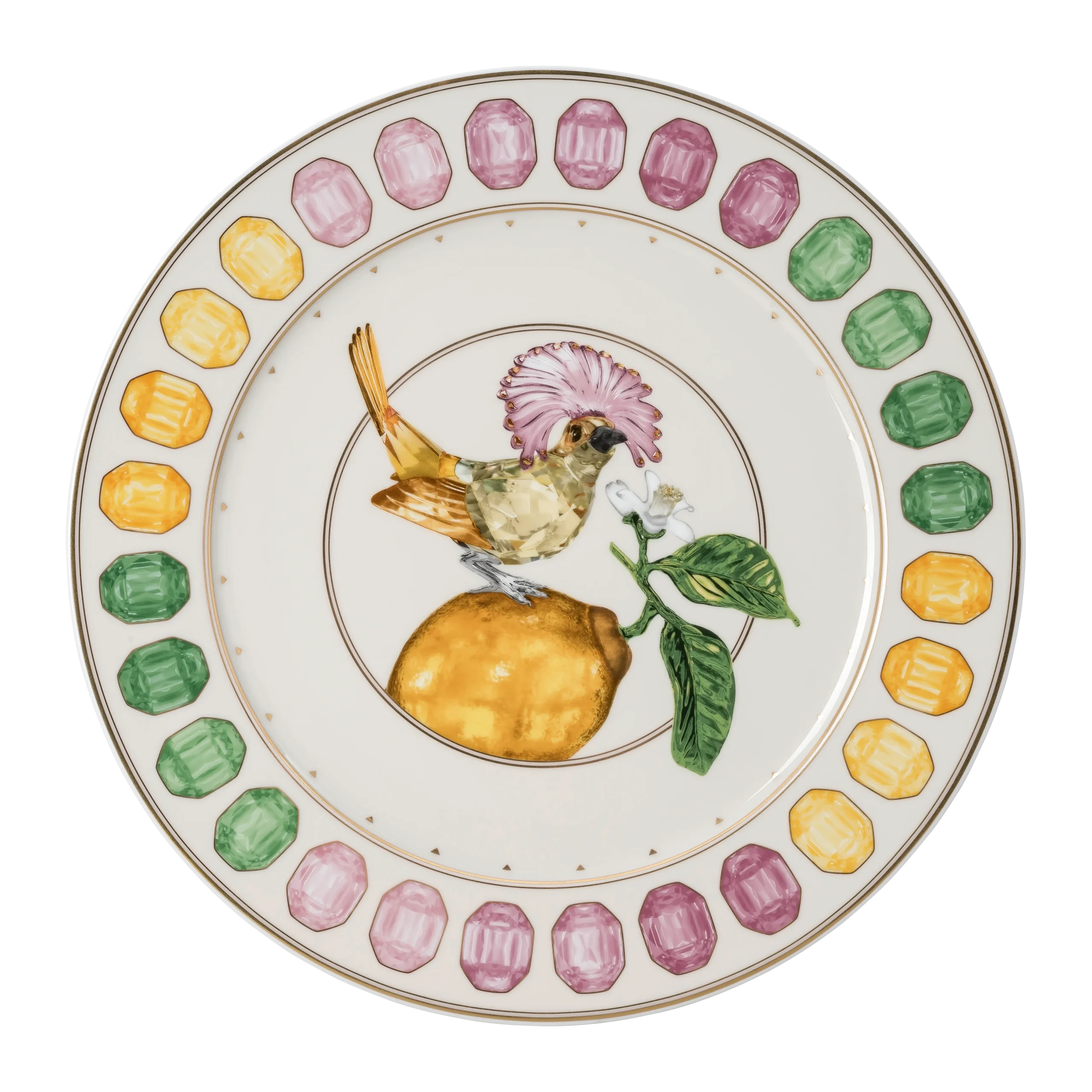 This stunning Idyllia service plate is crafted to add color and joy to any table. Using an exclusive technique,the marshmallow porcelain is printed with a beautiful motif that captures the essence and radiance of crystals. This includes a vibrant gemstone print around the outside,and a royal flycatcher perching on a lemon at the center. Created in partnership with porcelain brand Rosenthal,it is further decorated with fine gold-tone lines for a beautiful finish. This service plate is dishwasher safe,but not suitable for use in a microwave.