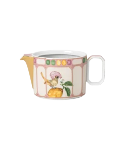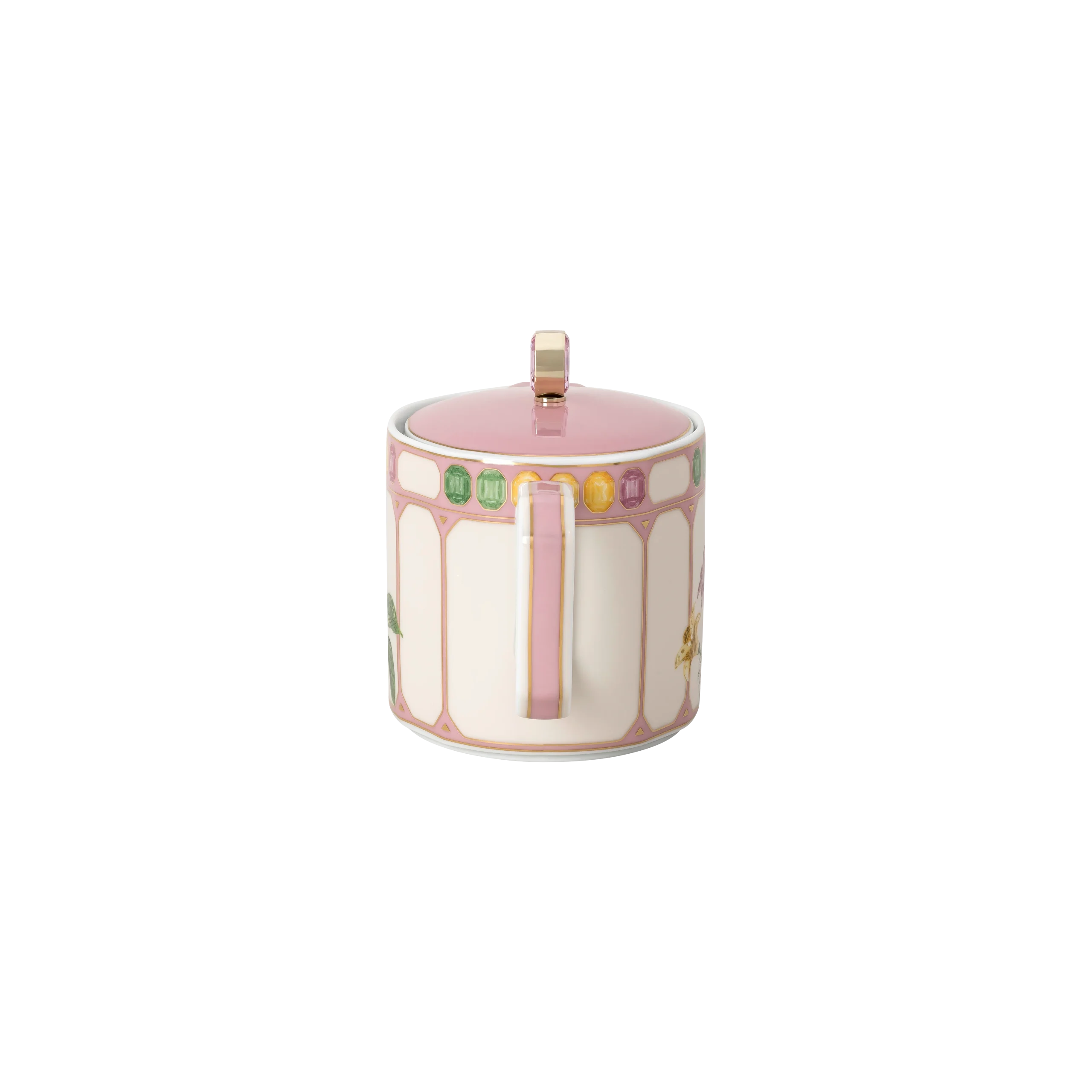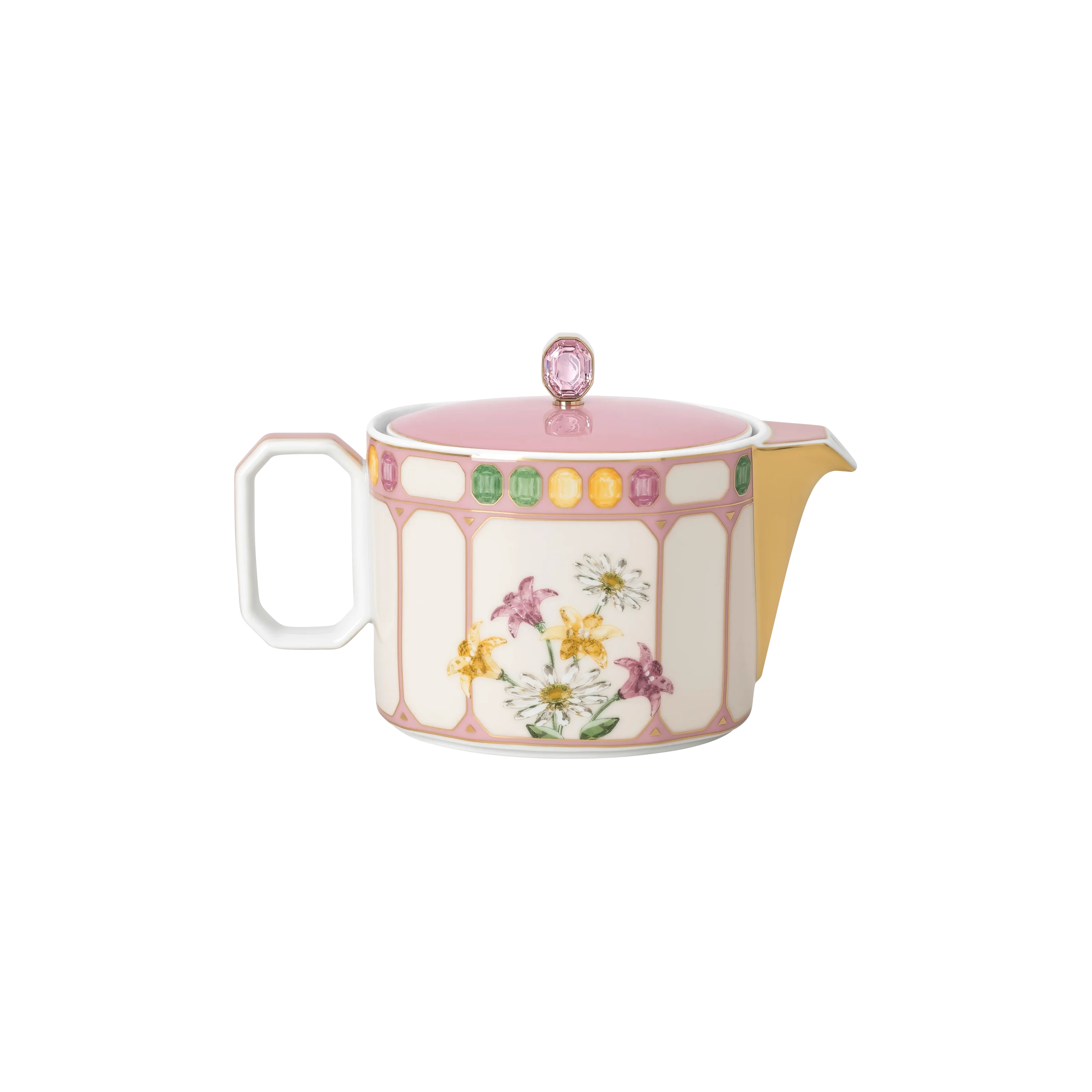This faceted teapot is inspired by the wonders of the Swarovski Mathemagical Garden. One side displays a bright bouquet of flowers,while on the other side,there is a majestic royal flycatcher perching on a lemon. These joyful motifs are printed on the pink and marshmallow porcelain using an exclusive technique that captures the essence and radiance of crystals. Created in partnership with porcelain brand Rosenthal,it is further decorated with fine gold-tone lines,a hand-painted gold-tone spout,and an octagonal pink crystal on the lid. This teapot is dishwasher safe,except for the lid,and should not be used in a microwave.