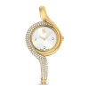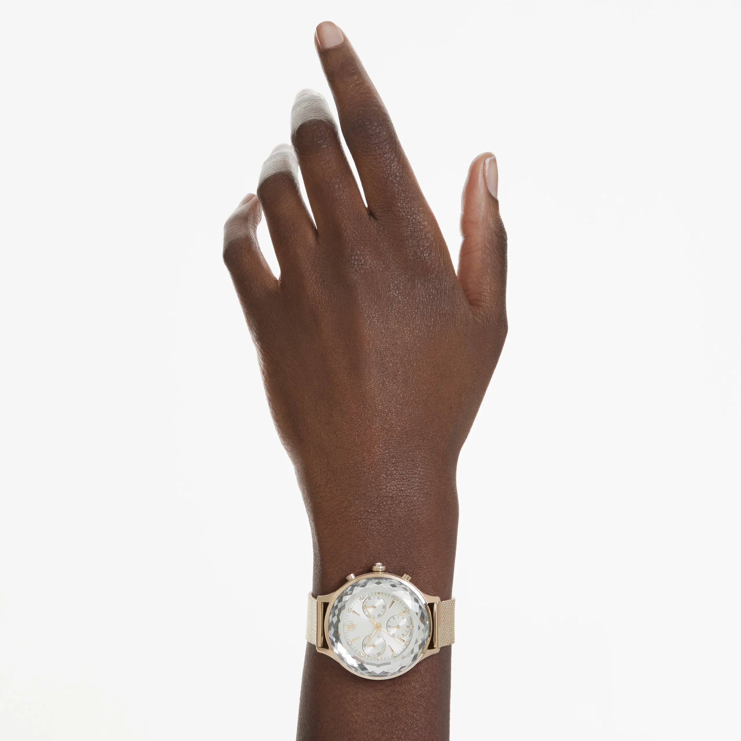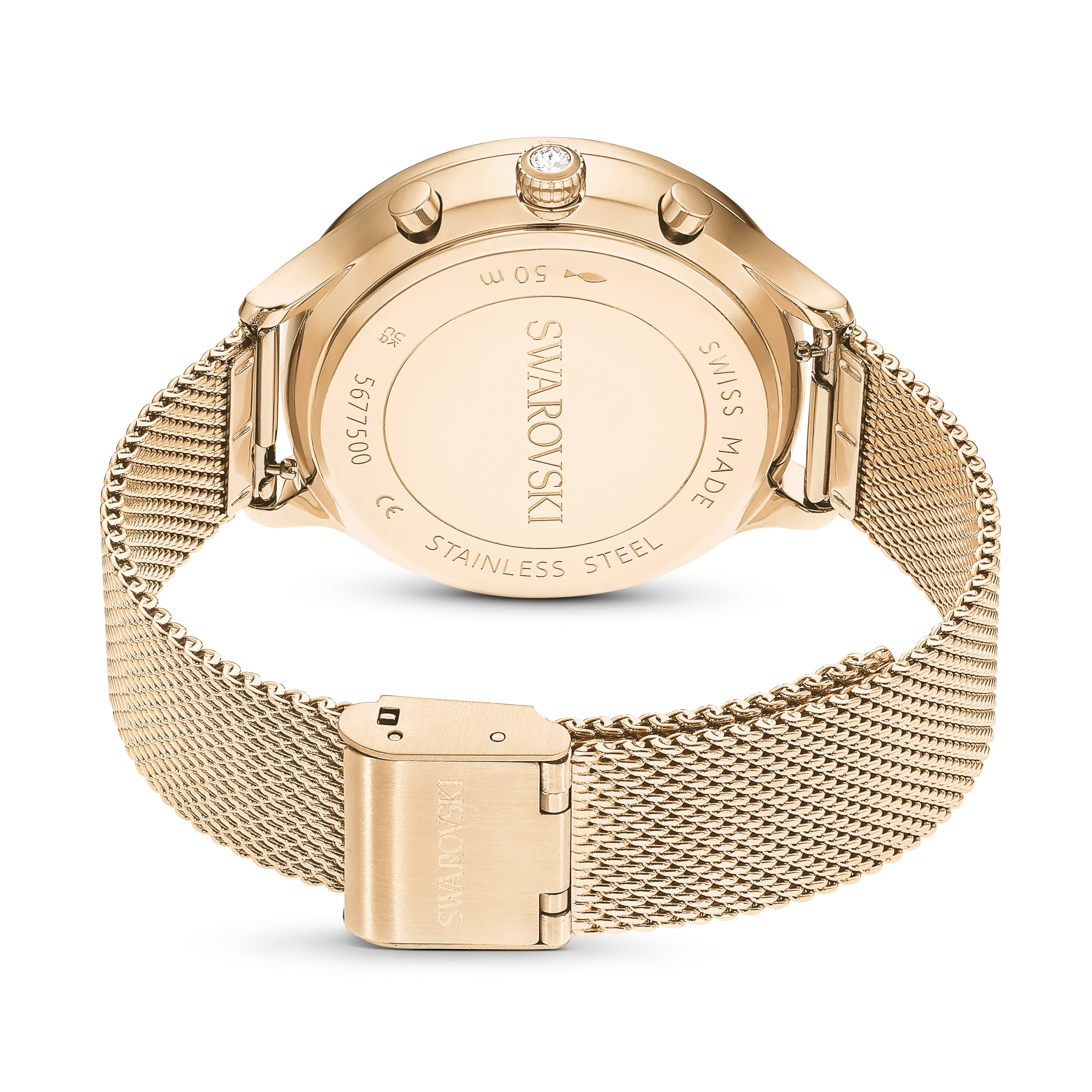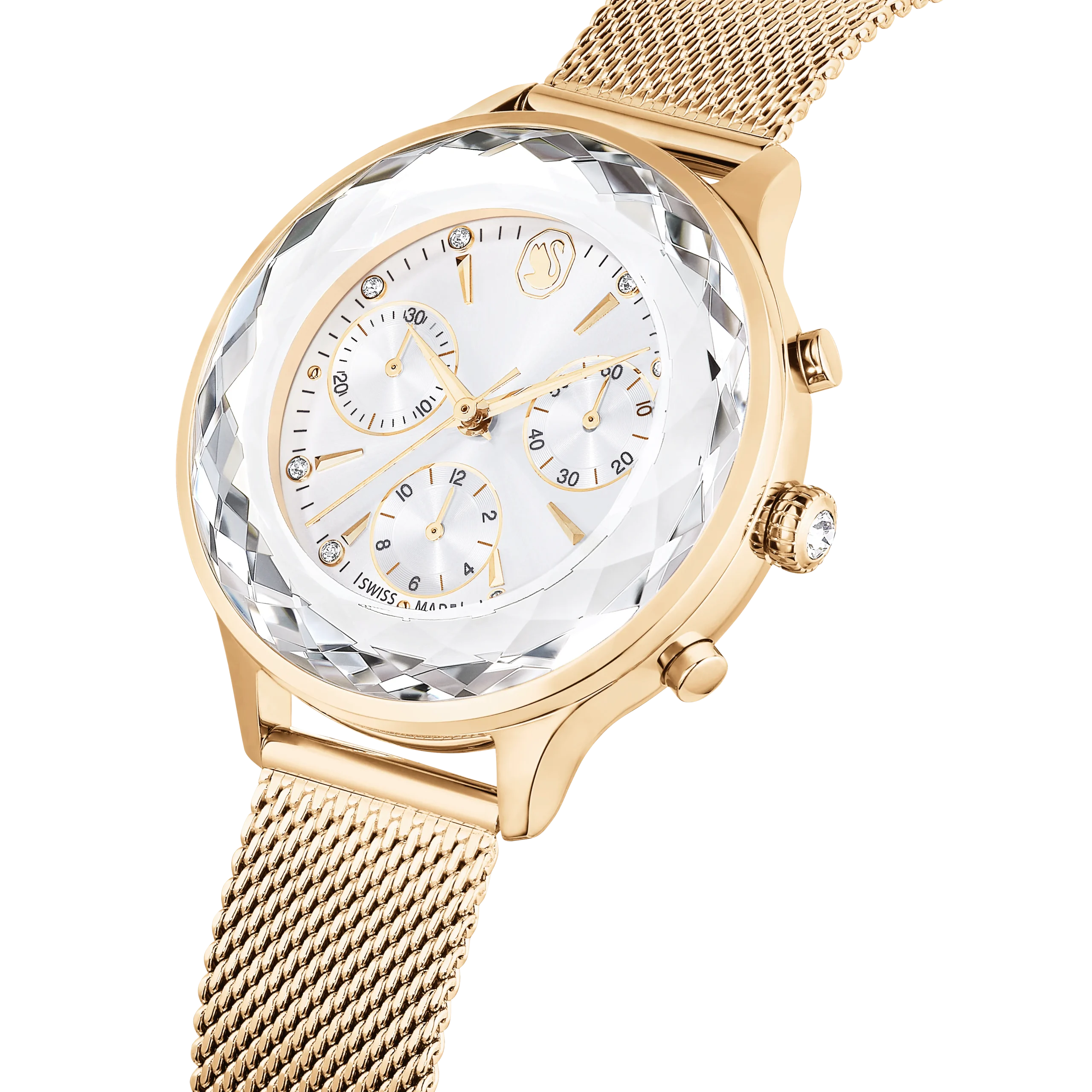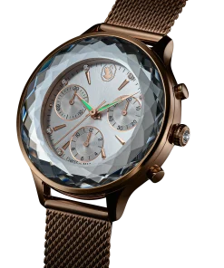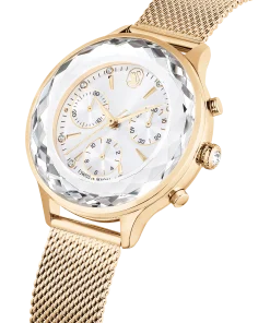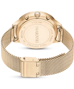 Epitomizing sports luxe style,this Nova Chrono watch is meticulously crafted to highlight Swarovski’s mastery of design. The 37mm stainless steel case has a champagne gold-tone finish and is seamlessly integrated with a beautifully faceted crystal bezel,as well as the watch’s sapphire glass. This frames the radiant sunray dial,which is adorned with a swan logo,crystal index markers,and three subdials including a minutes counter,seconds counter,and hours counter. Around the wrist,this modern timepiece is worn on a quick-release Milanese bracelet. The champagne gold-tone hands are coated in Luminova for added brilliance. This Swiss made watch is water resistant to 50 meters,with a single crystal set in the crown,and is a versatile choice for both work and play.