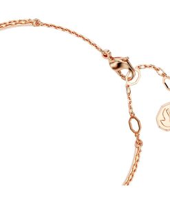 Adorn your wrist with the beauty of Swarovski’s signature emblem. This rose gold-tone plated jewelry features a rigid band with an elegant swan motif,expertly decorated with a pavé of jet black Swarovski ReCreated™ crystals. A secondary chain is also attached with a clear Swarovski Zirconia at the center. Intense yet radiant,this bangle is a perfect way to inject your style with intrigue.