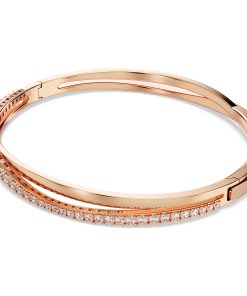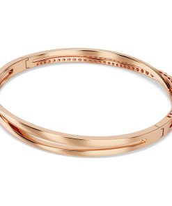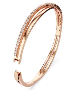 Stylish and refined,this rose-gold tone plated bangle complements everyday looks with its brilliant touch of timeless elegance. Featuring one sinuous line of polished metal curving around another embellished with radiant,white stones,it’s a modern interpretation of classic luxury. A lovely gift idea.