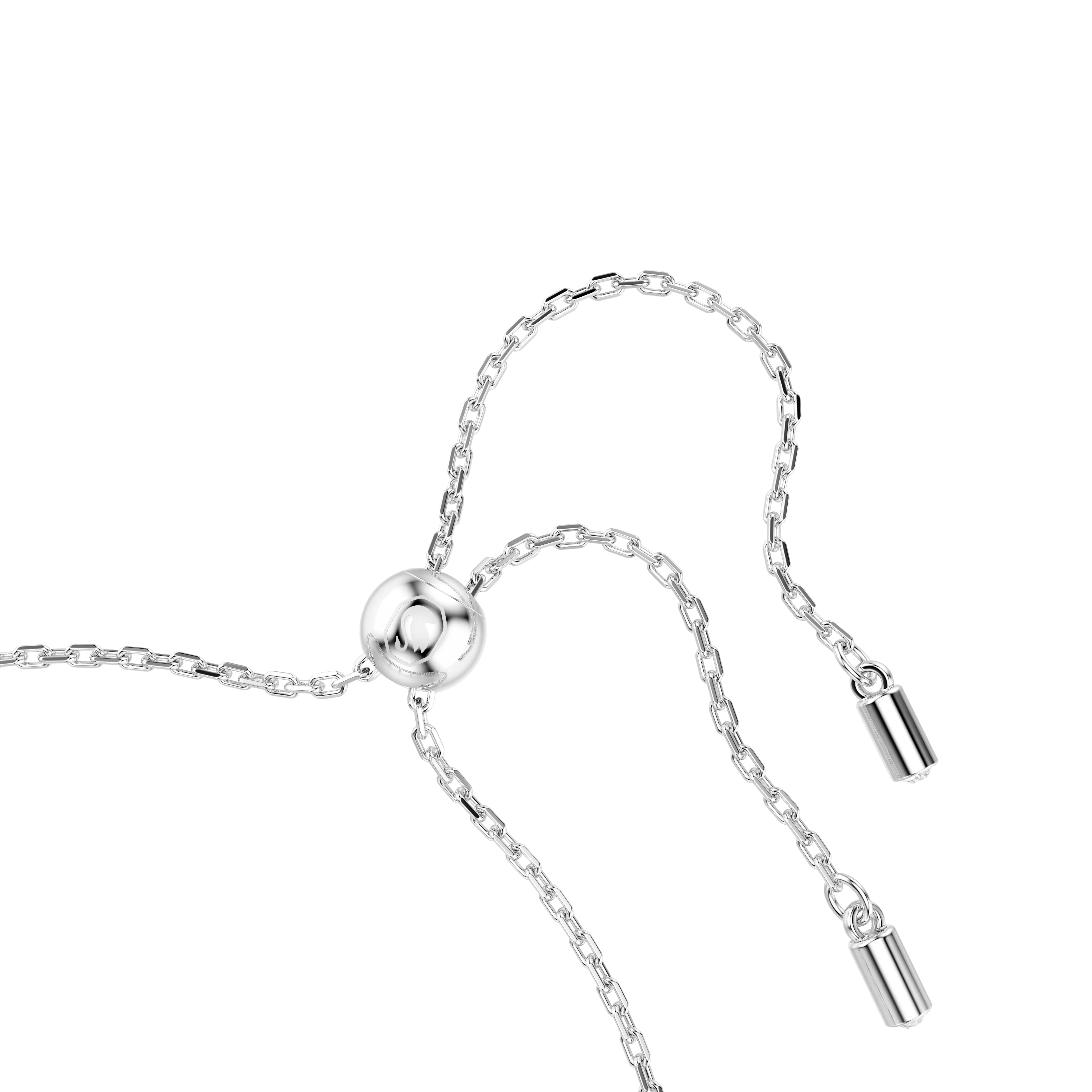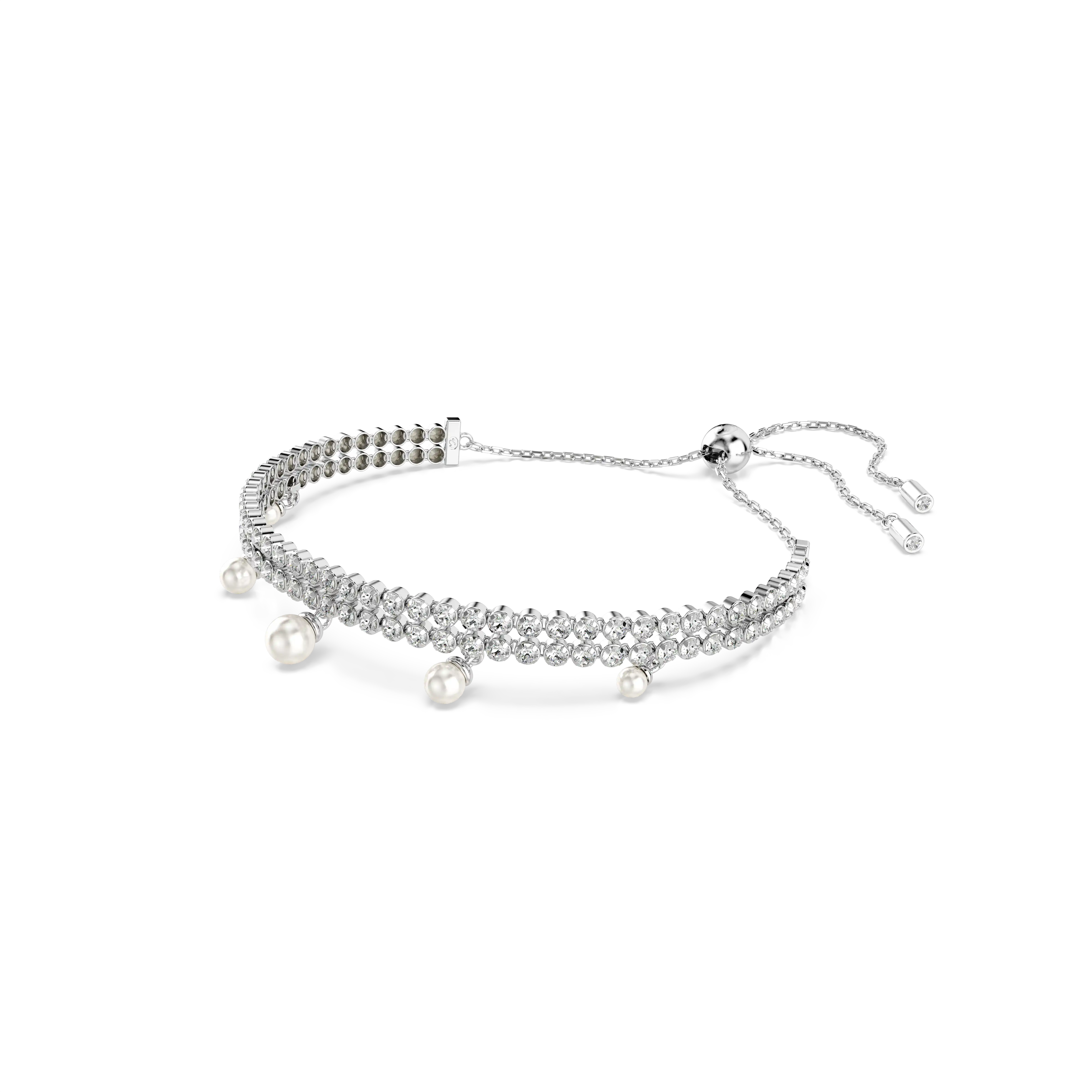 Discover a pure expression of elegance in this refined bracelet. Easily adjustable with a sliding ball closure,the rhodium plated design features two rows of cupchain,set with clear Swarovski Zirconia in round cuts. An adornment of Swarovski Crystal Pearls is then added below for a sensational look of luxury. Pair this bracelet with the matching choker to create your own expressive combination.