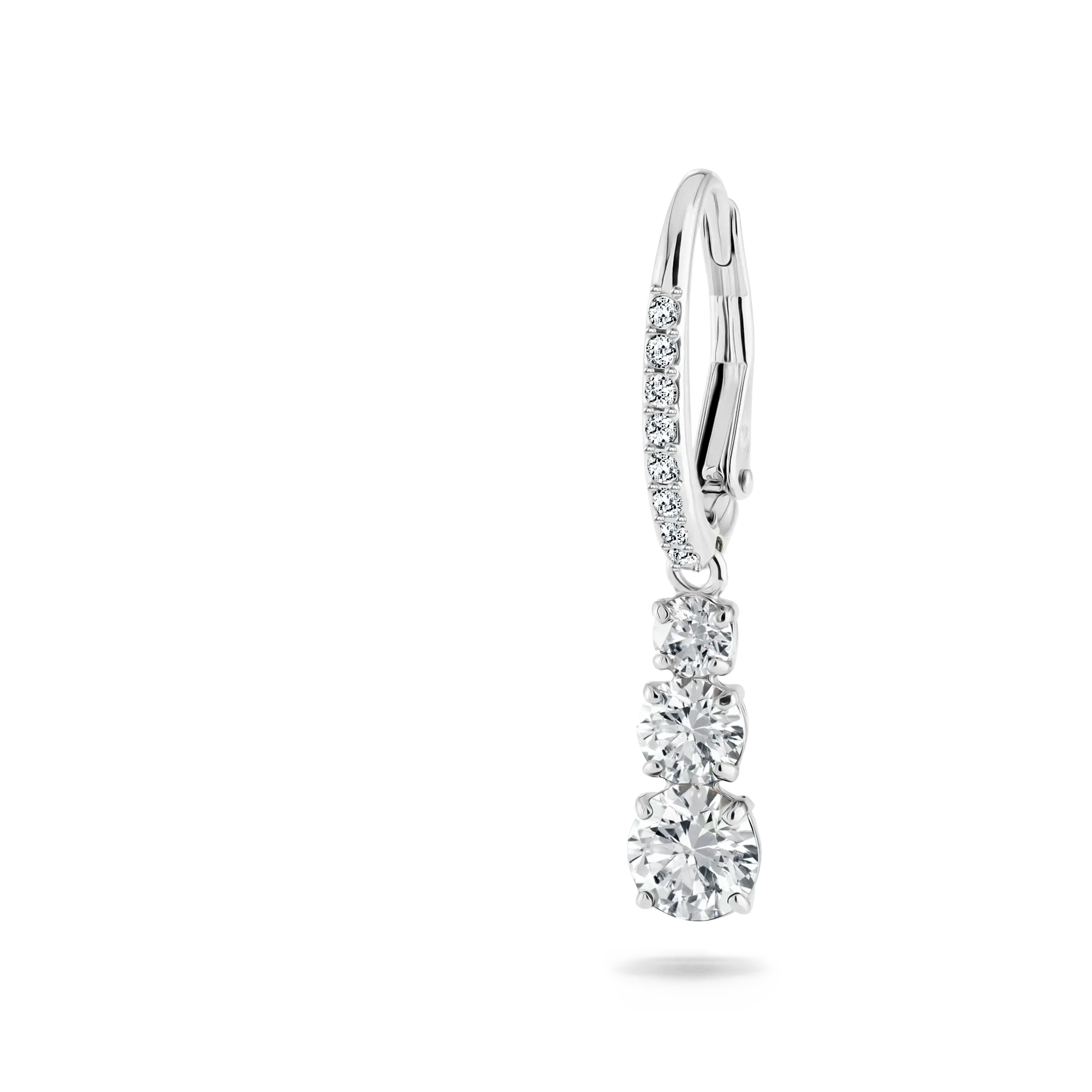 By its very nature eternal love must have a past,a present,and a future,and this pair of stunning pierced earrings has been conceived with that romantic concept in mind. A trio of clear crystals are embellished with pavé and rhodium plating in this scintillating design. Timelessly elegant,they will be a treasured keepsake. A matching necklace and ring are available.