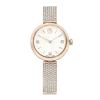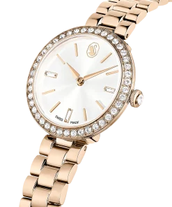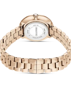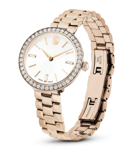 Blending Swarovski radiance with contemporary design,this Certa watch is the perfect fusion of artistry and functionality. The 30mm stainless steel case has a warm champagne gold-tone finish and a bezel set with a shimmering pavé of 42 crystals. On the radiant sunray dial,there is an elegant swan logo at 12 o’clock,along with three index markers crafted from individual baguette-cut crystals. A single crystal is set within the crown,while the three-link metal bracelet provides a comfortable fit around the wrist. This Swiss made watch is water resistant to 50 meters and is an elegant choice to complement your everyday style.