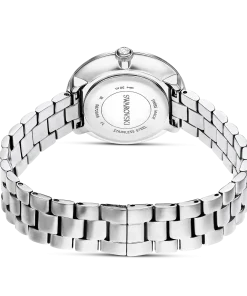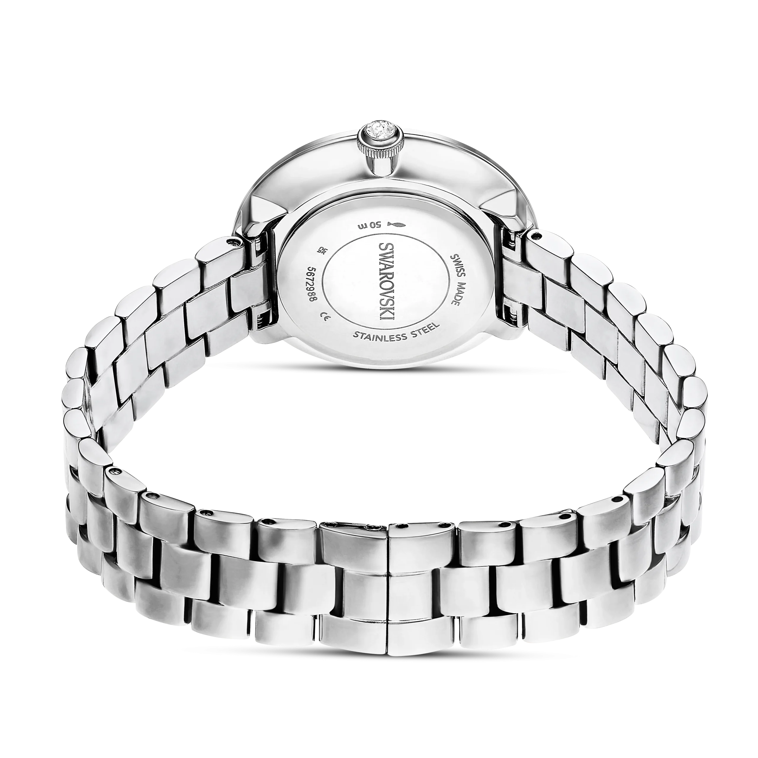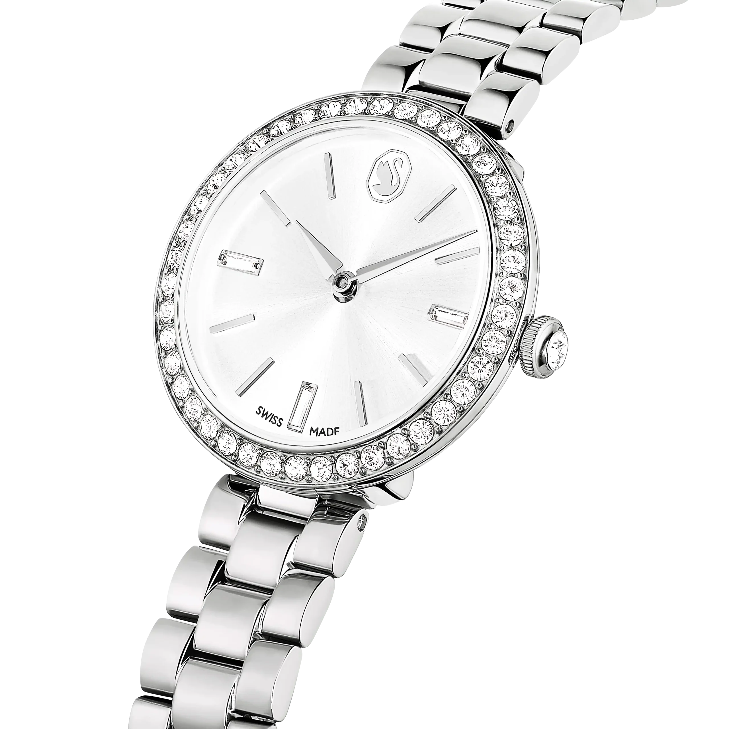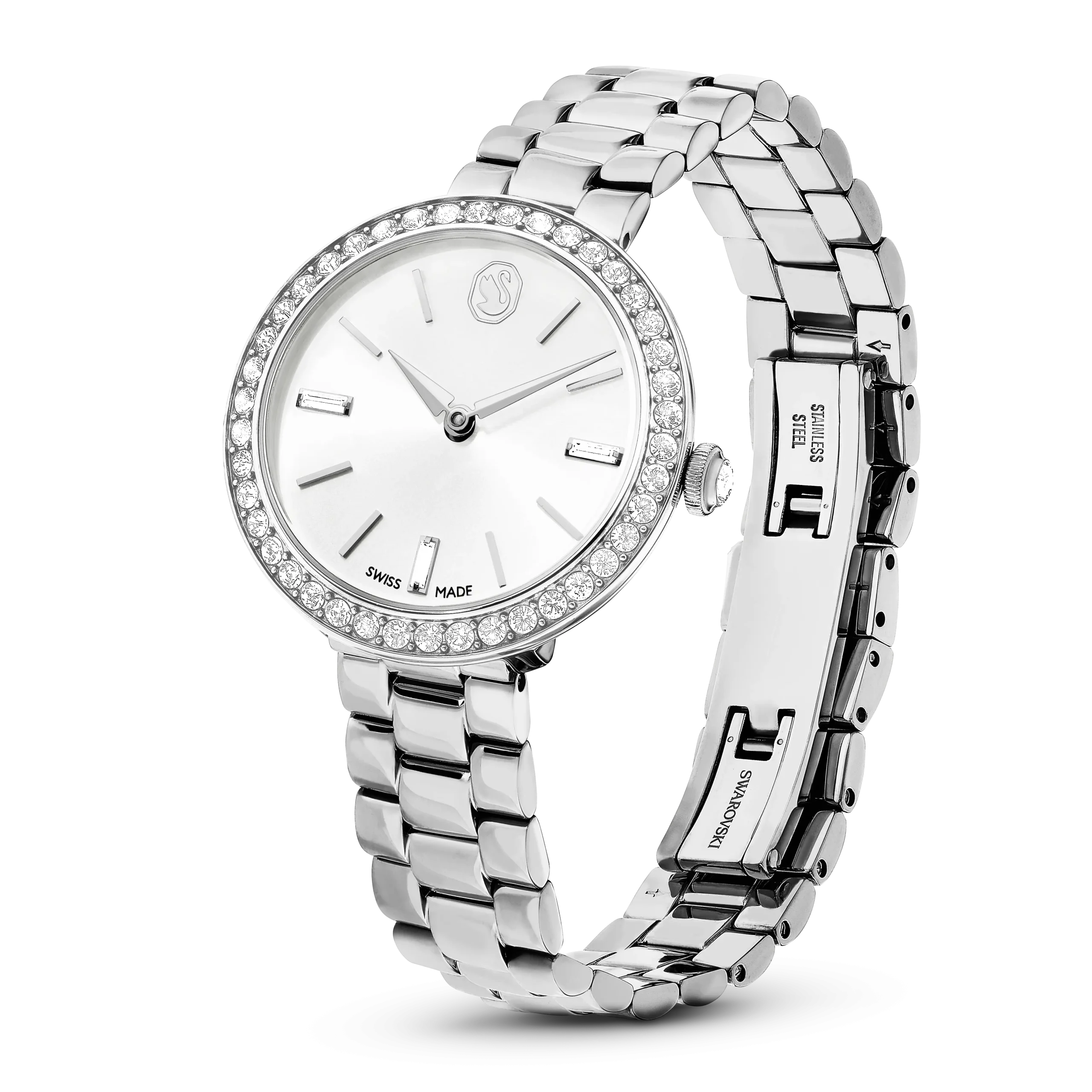 Blending Swarovski radiance with contemporary design,this Certa watch is the perfect fusion of artistry and functionality. The 30mm stainless steel case features a bezel set with a shimmering pavé of 42 crystals,while on the radiant sunray dial,there is an elegant swan logo at 12 o’clock and three index markers crafted from individual baguette-cut crystals. A single crystal is set within the crown,and the three-link metal bracelet provides a comfortable fit around the wrist. This Swiss made watch is water resistant to 50 meters and is a timeless choice to complement your everyday style.