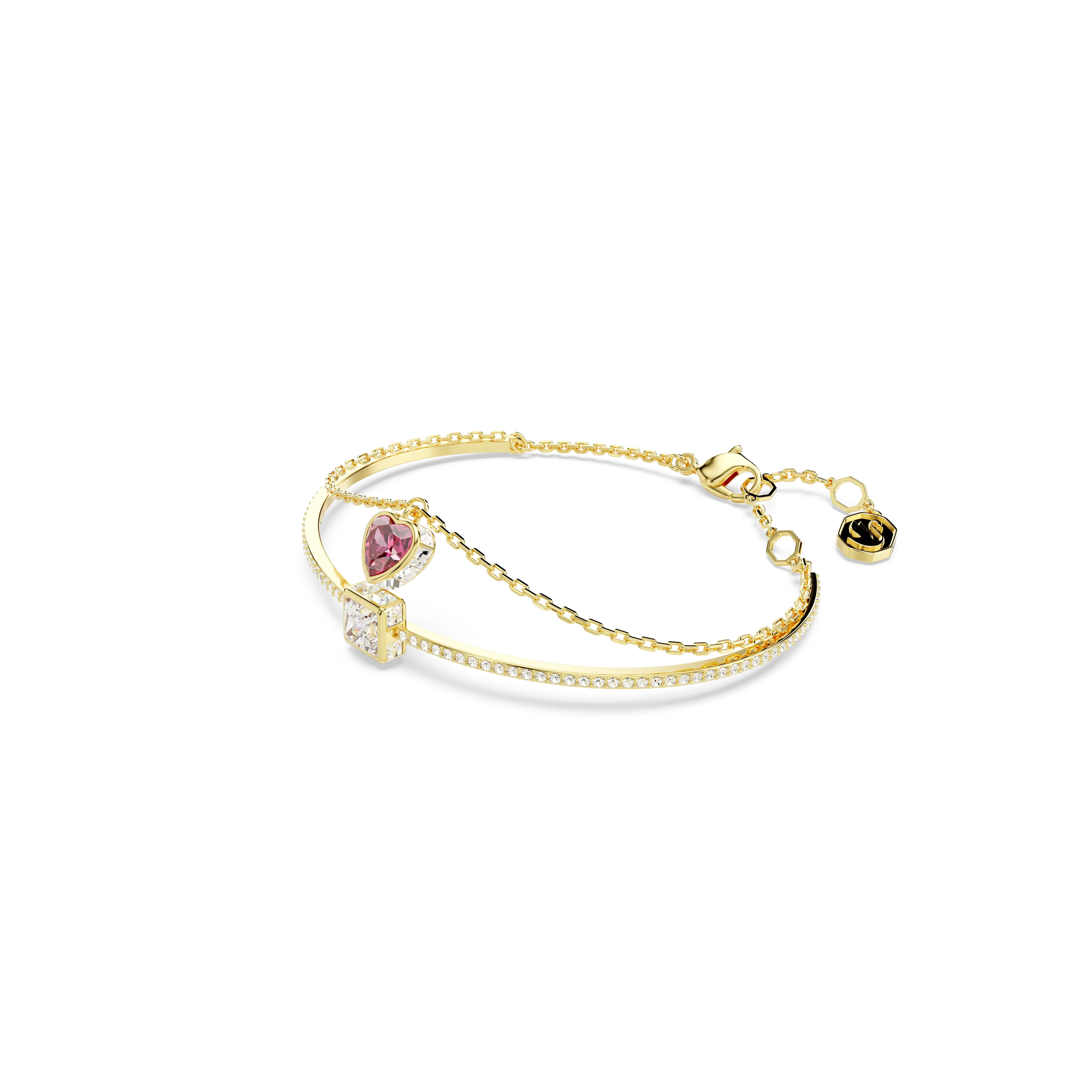 This captivating double bracelet is made with romance in mind. The gold-tone plated design features a rigid band with clear pavé and a square center stone in clear Swarovski Zirconia,while the chain is adorned with a heart-shaped center stone,which is made from red Swarovski Zirconia and enhanced with clear square crystals around the edges. Completed with a lobster closure,this bracelet is the perfect gift for someone you adore.