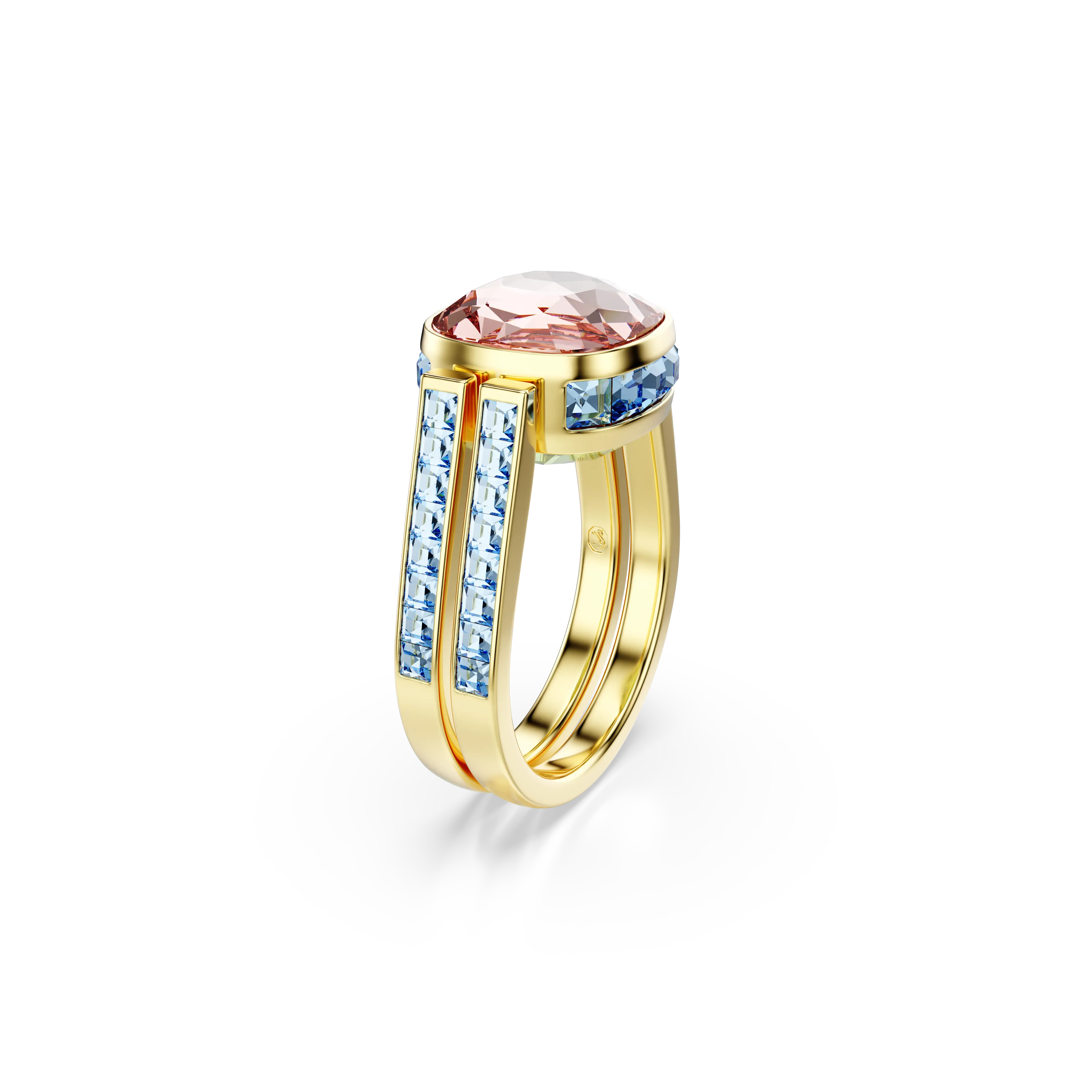 Flip the colors to suit your mood with this versatile Chroma Twist ring. The gold-tone plated shank features a green Swarovski ReCreated™ crystal at the center,which can be easily rotated for the pink crystal on the other side. Smaller Swarovski ReCreated™ crystals in blue are also featured around the design. Get playful with this joyful cocktail ring and face each day in the color you’re feeling. Chroma Twist jewelry contains at least 50% Swarovski ReCreated™ crystals,and it is our first collection designed with circularity in mind.