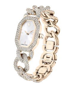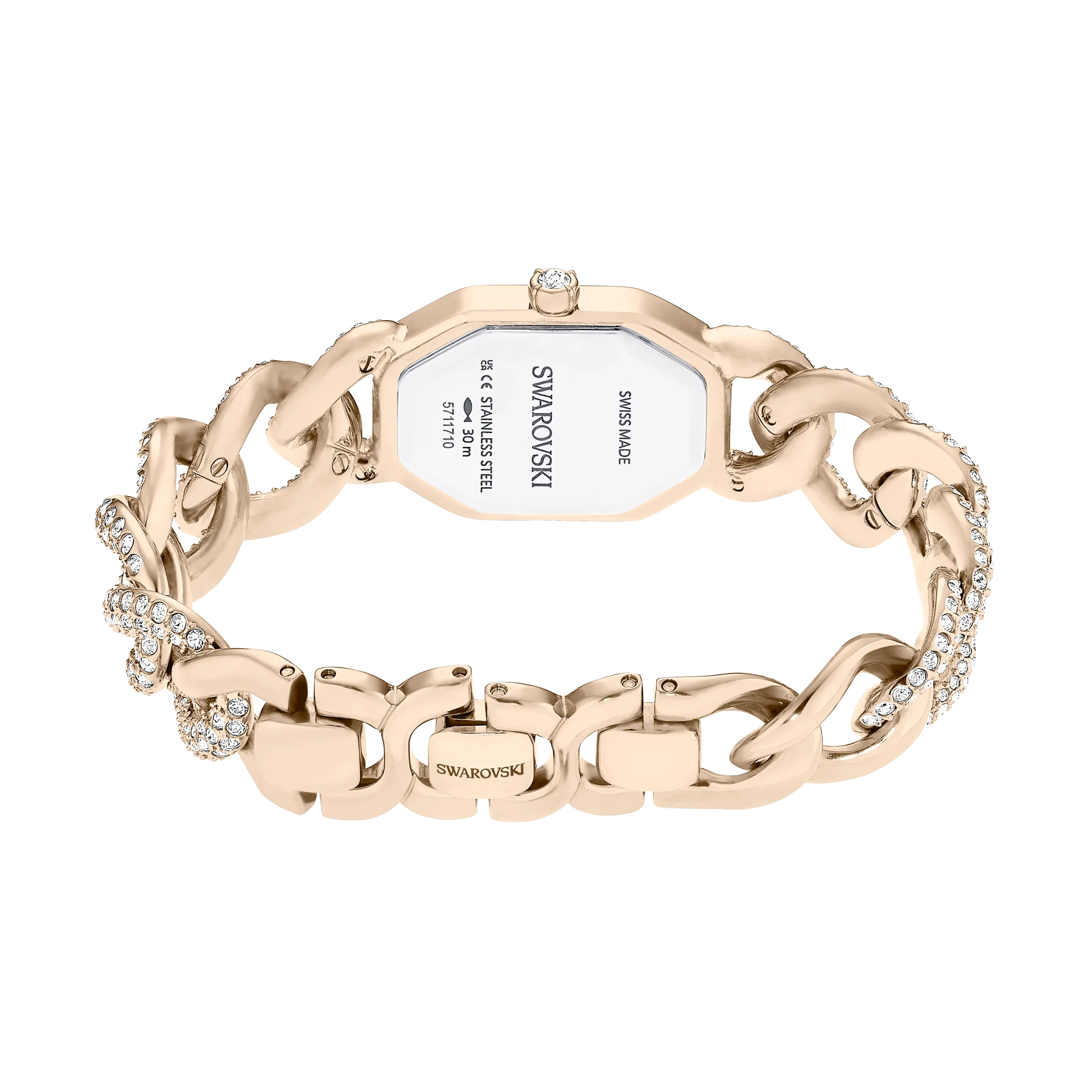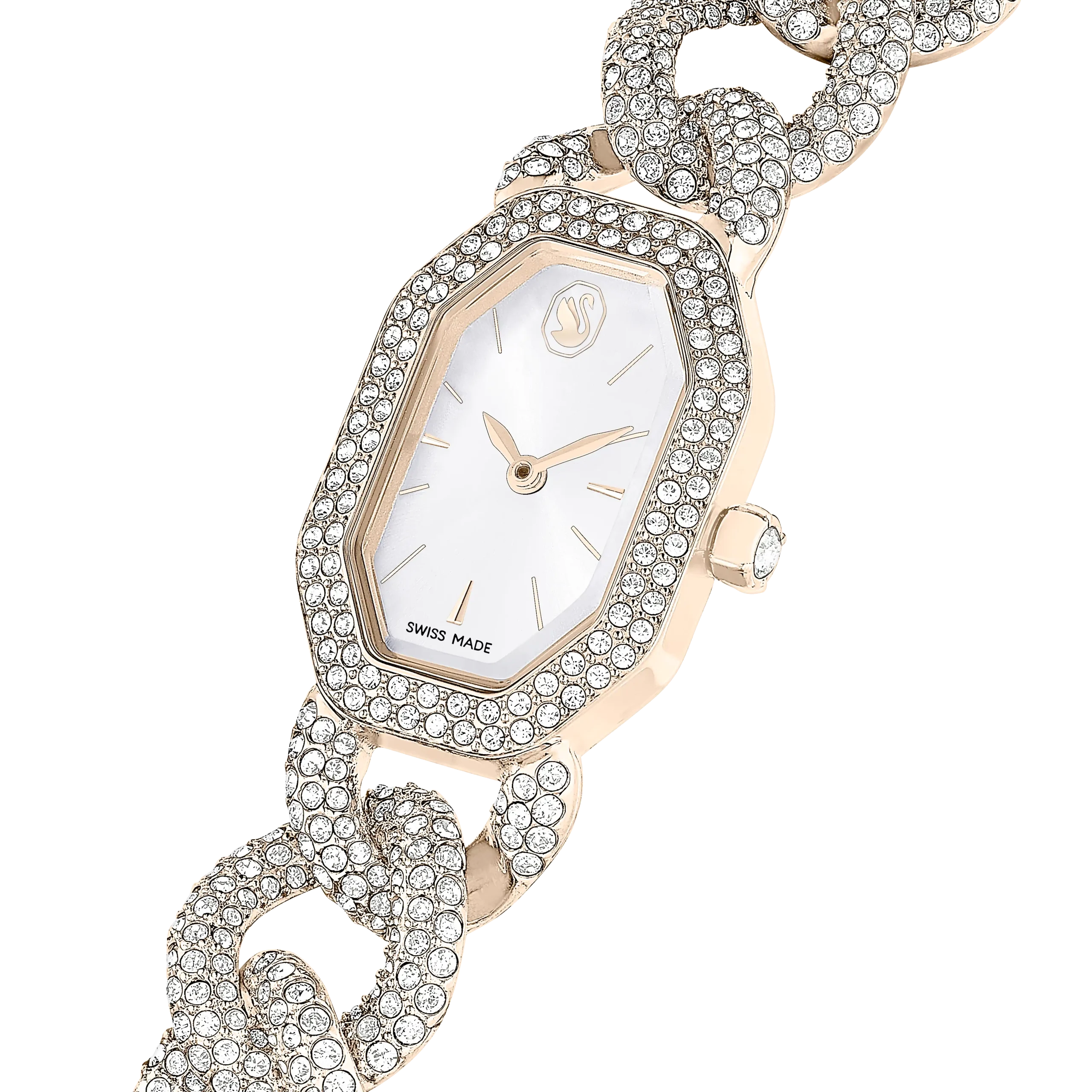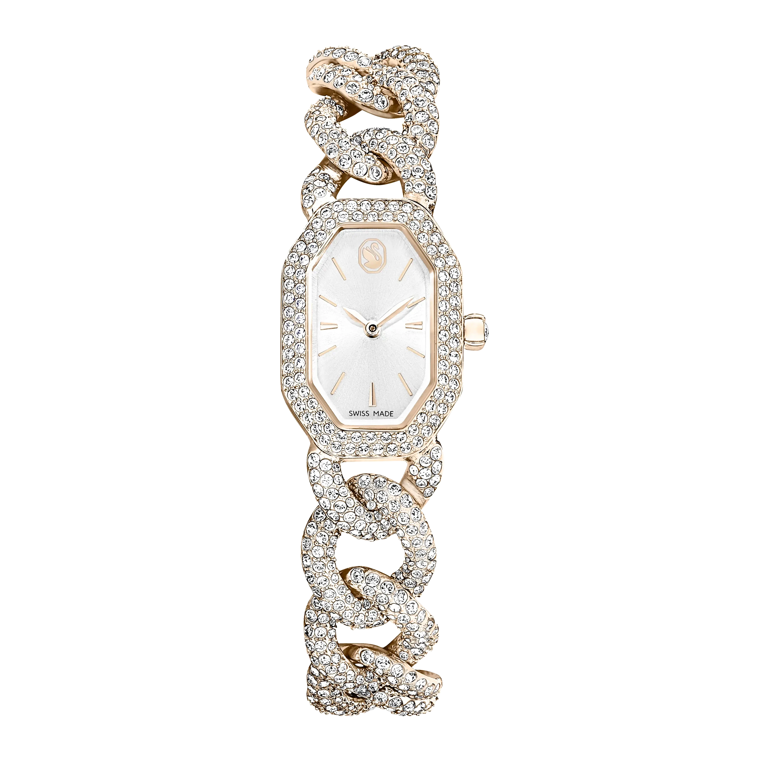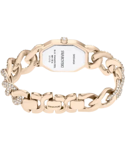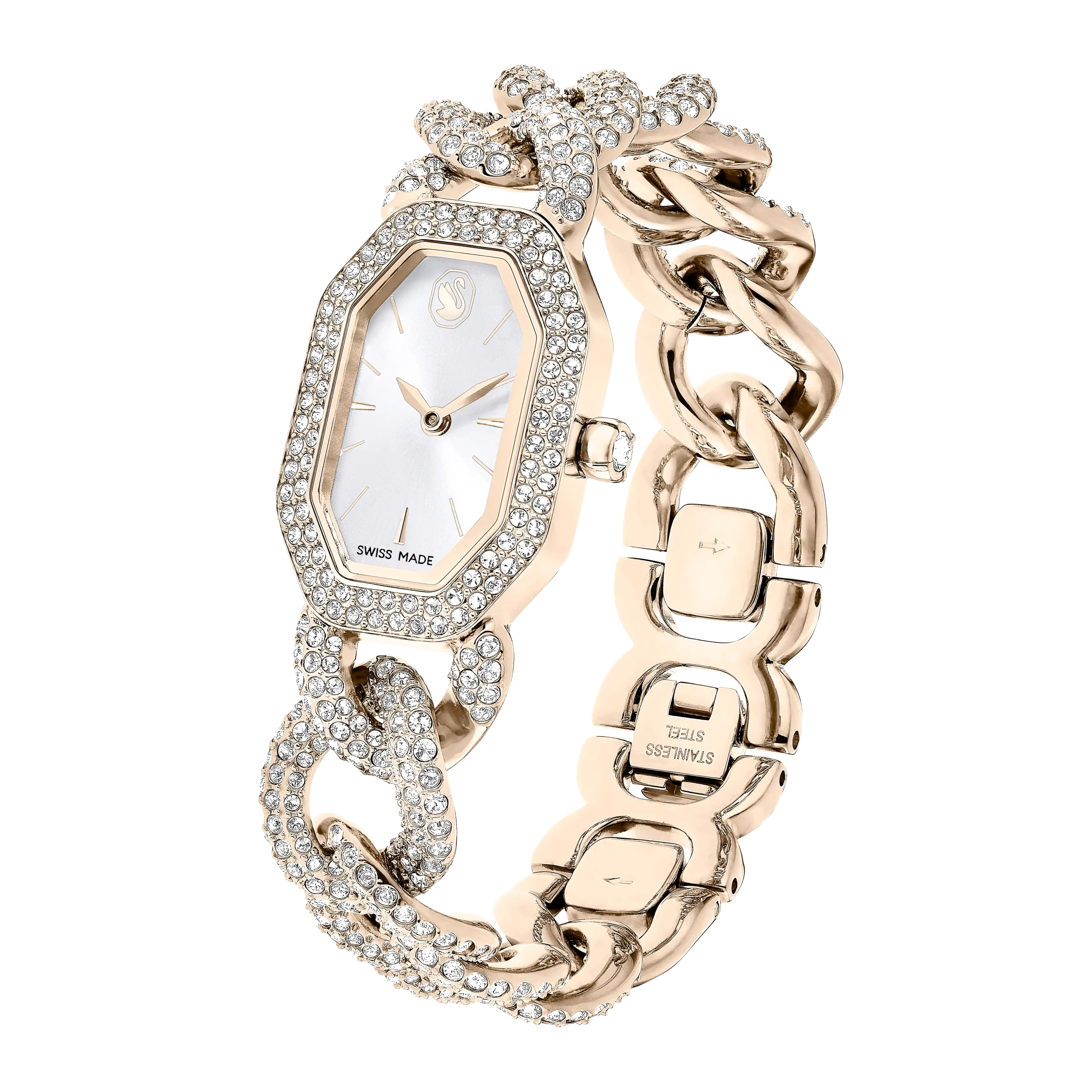 Highlighting Swarovski’s iconic octagon shape and set with 623 crystals,this dazzling watch wears like a piece of fine jewelry. The exquisite case measures 44mm in length with a champagne gold-tone finish and shimmering pavé on the bezel,alongside a sunray dial with an elegant swan logo at 12 o’clock. The watch is worn around the wrist on an adjustable gourmette chain embellished with 530 crystals,while a single crystal is also set within the crown. This Swiss made watch is water resistant to 30 meters and is a spectacular choice for everyday glamour and special occasion opulence.