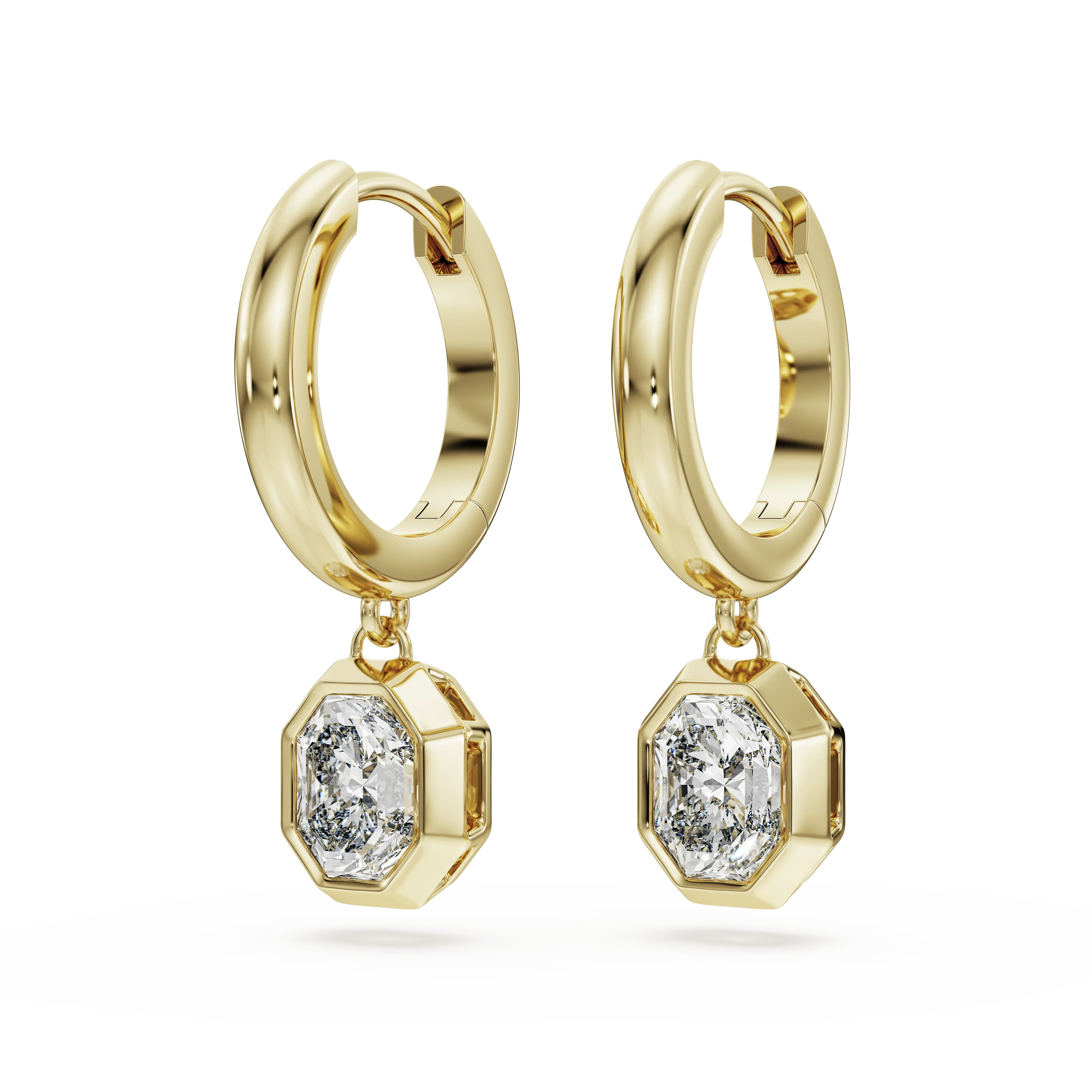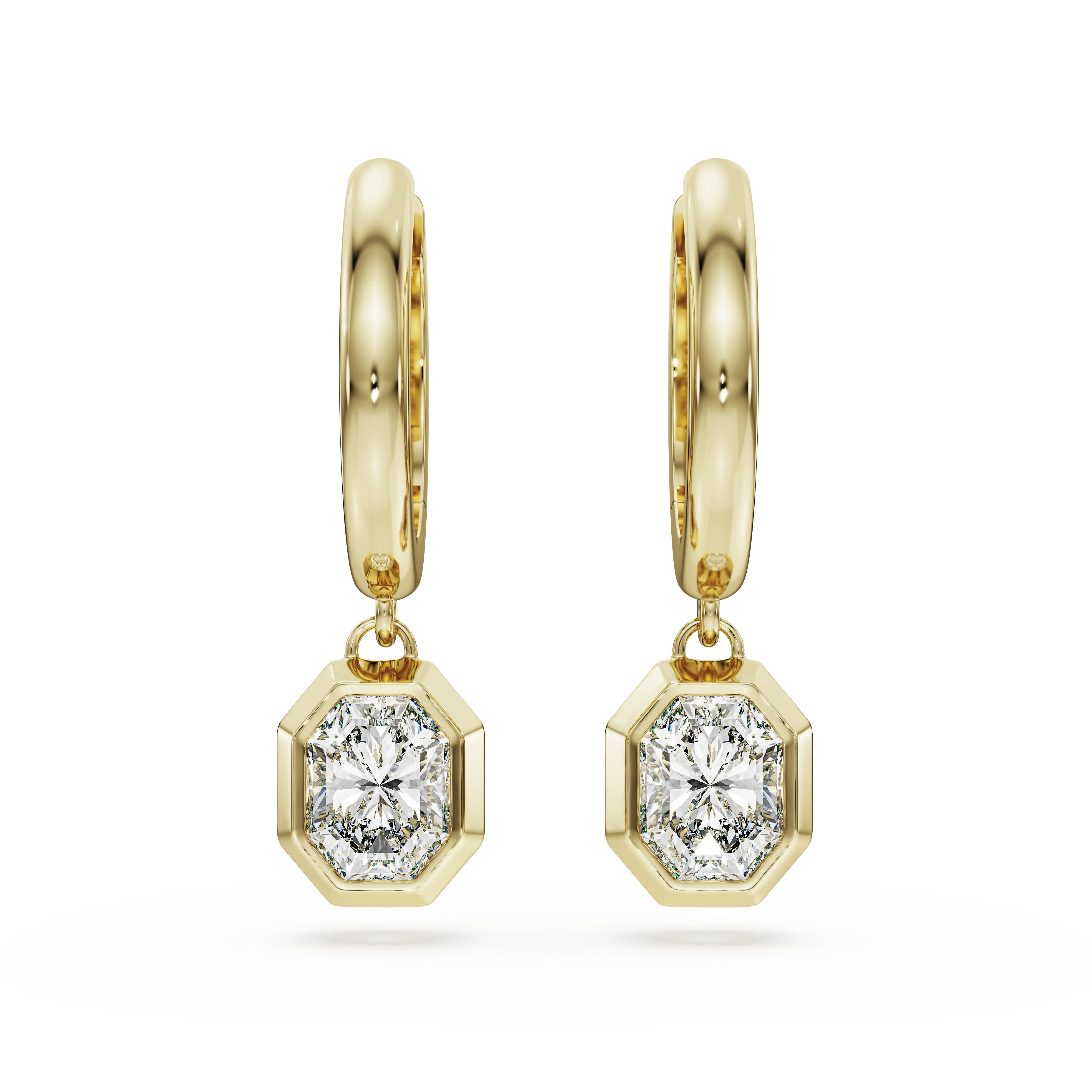 Give your look the ultimate glow with these stunning 14K yellow gold earrings. Each mini hoop connects to a dangling octagonal motif,which is crafted with a single laboratory grown diamond,totaling 1.00 carat,placed in a faceted bezel setting. Wear them alone to bring light into your style,or pair them with a matching pendant to coordinate your look. This jewelry is IGI (International Gemological Institute) certified and is part of the Eternity collection.