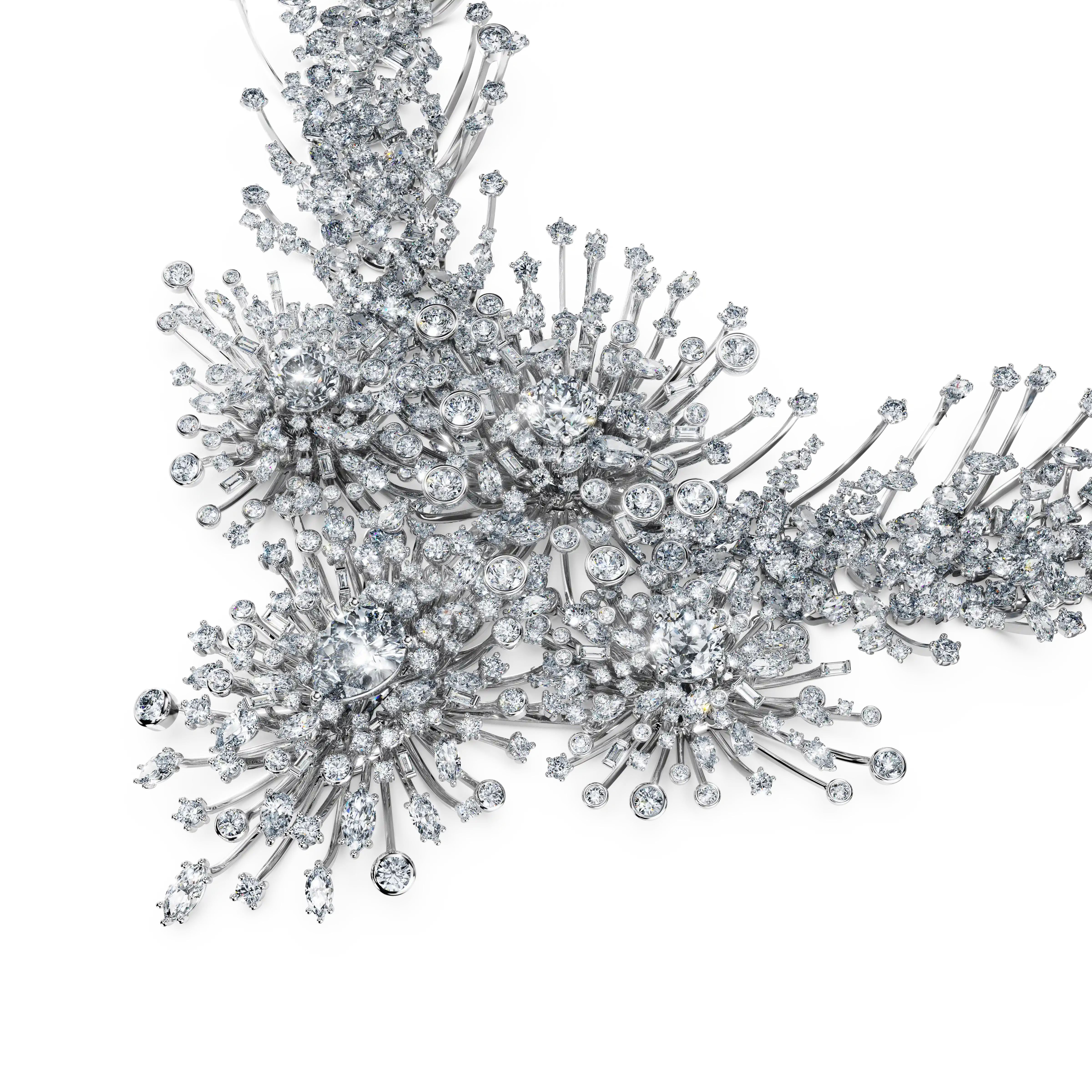 This incredible showpiece necklace provides the ultimate display of Swarovski savoir-faire,and shines bright with an abundance of artistic skill. The entire 18K white gold design features an explosion of laboratory grown diamonds,all presented in a variety of shapes and sizes,and each faceted for maximum brilliance. With each stone extending in different directions,the necklace delivers a star-like quality that shimmers from every angle. A dramatic piece that truly captures the wonders of the galaxy. This jewelry is part of the Galaxy collection created by Giovanna Engelbert. The laboratory grown diamonds in the Galaxy collection are graded and certified by IGI (International Gemological Institute) according to the 4Cs of diamond quality. This piece is made to order.