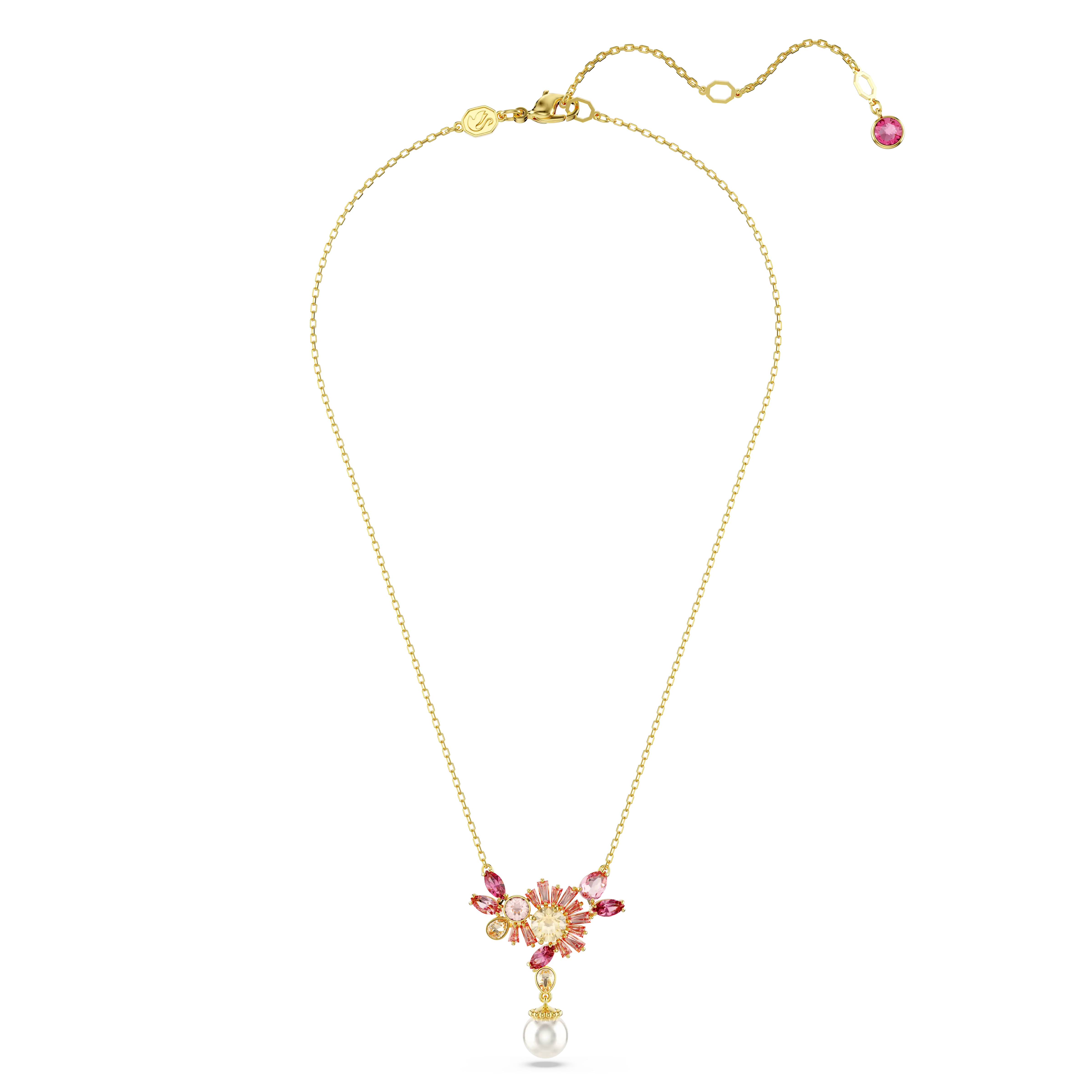 This joyful pendant is inspired by the iconic cherry blossoms of Japan. The gold-tone plated jewelry is worn on a delicate chain and features a diverse mix of fancy cut crystals and Swarovski Zirconia in vibrant shades of pink and champagne. A single white Crystal Pearl hangs beneath,adding effortless ethereal beauty. Wear this pendant alone to embrace nature-infused wonder,or pair with a matching piece from our exquisite Gema Sakura jewelry family.