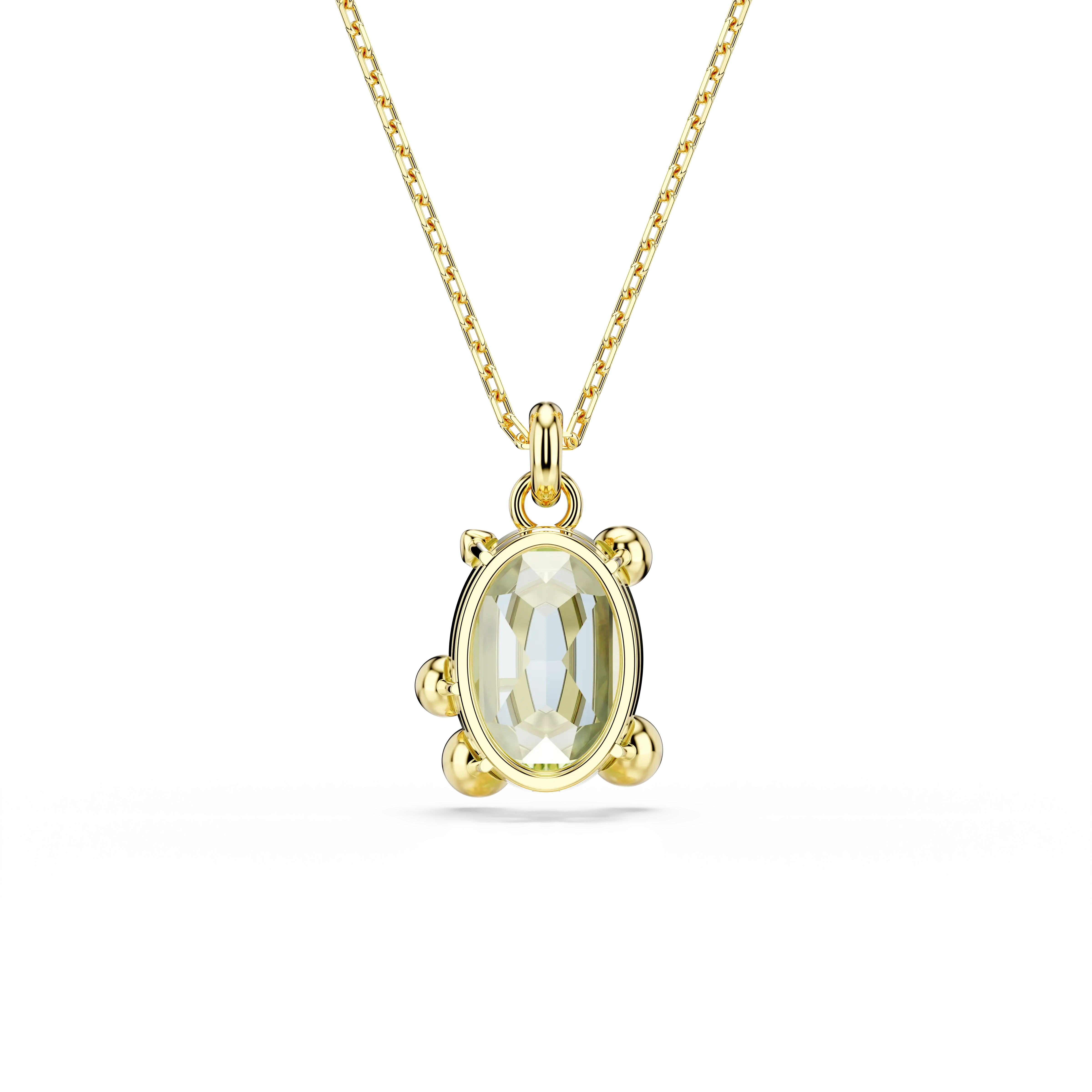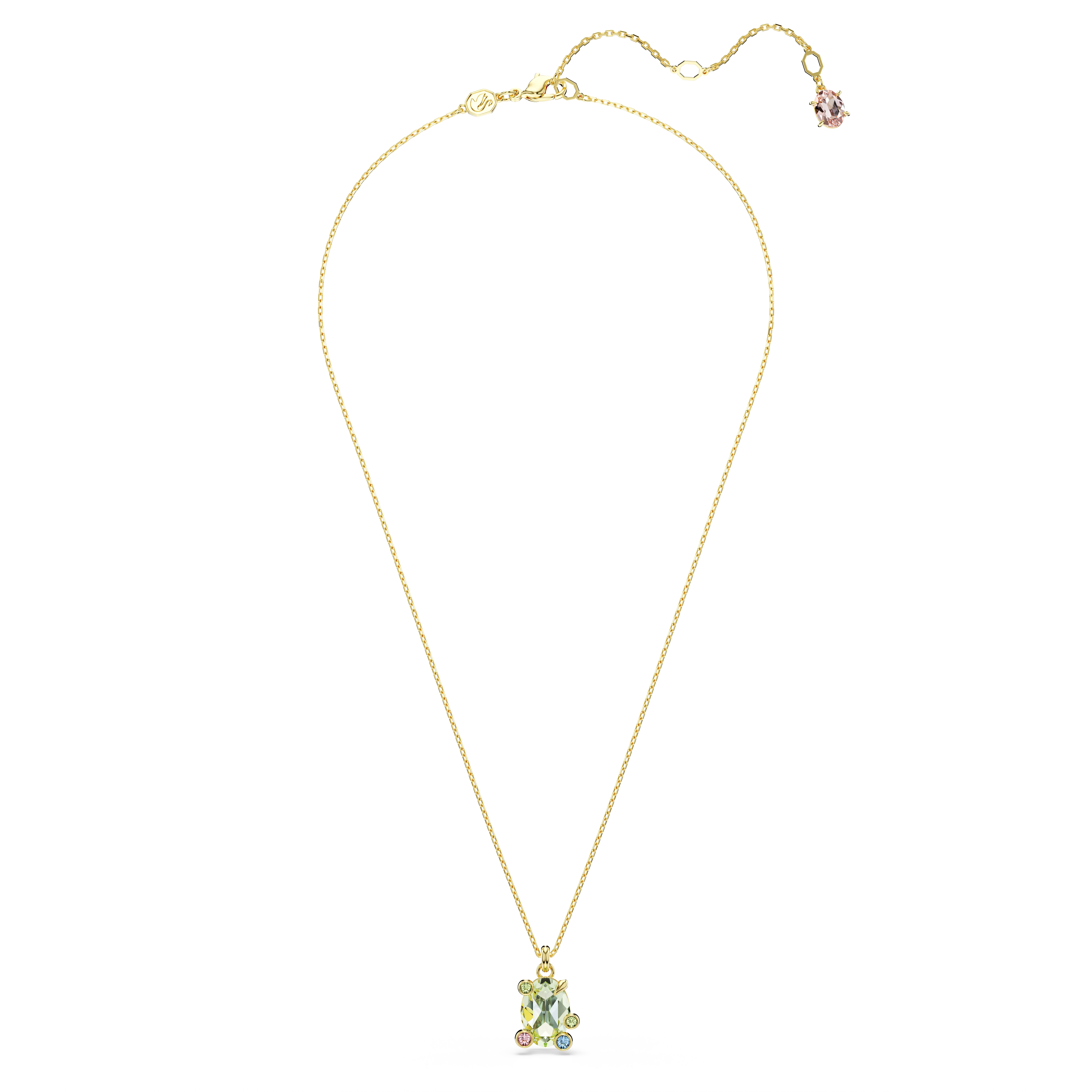 This effervescent Gema pendant will fill your everyday style with color. Suspended from a delicate gold-tone plated chain,the central motif features a large green crystal surrounded by smaller crystals in a joyful bubble prong setting. The expert faceting and various hues ensure this pendant catches the eye at all times. Pair it with a matching bracelet to maximize the energy-boosting effect.