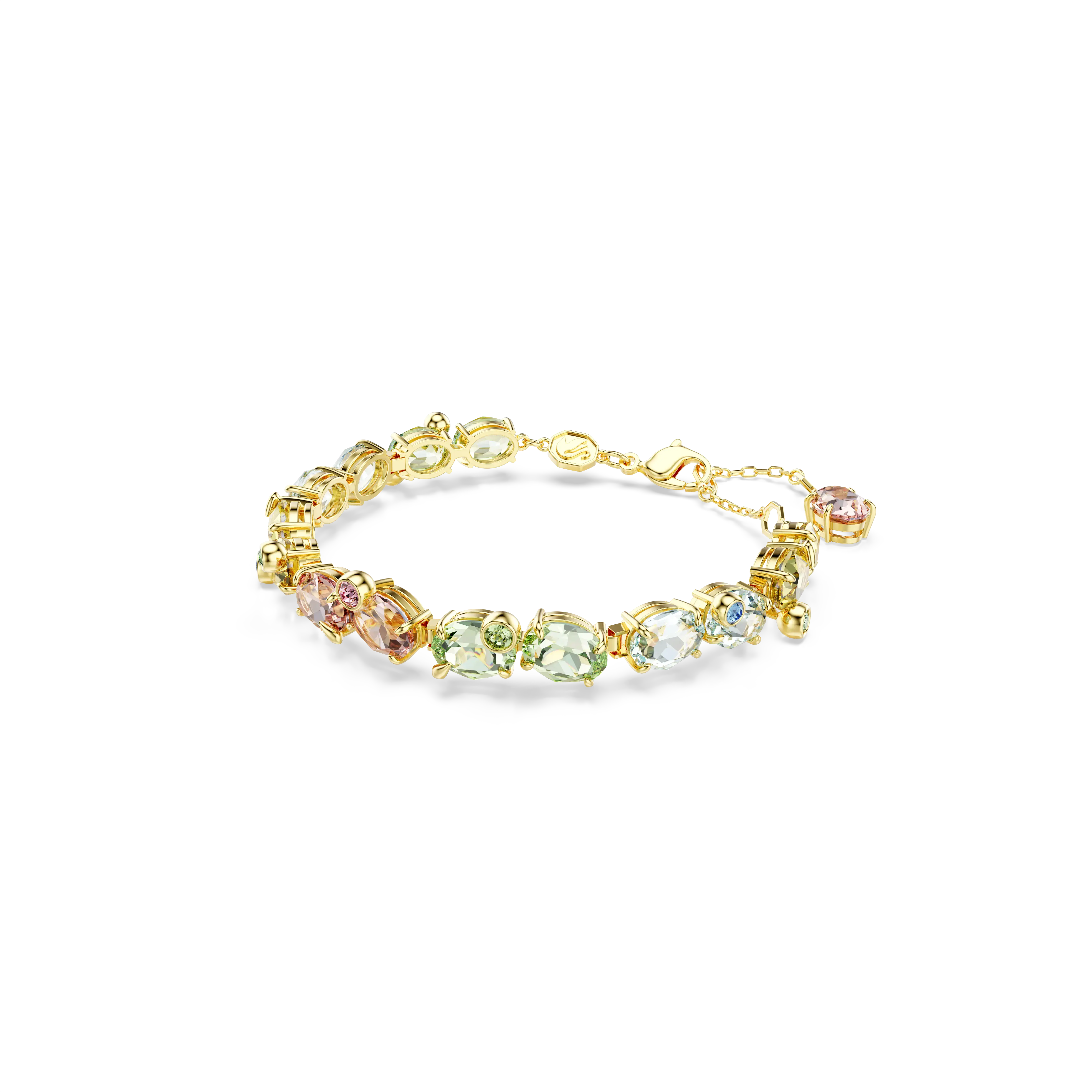 With a scintillating collision of colors,this bright Gema bracelet is perfect for playful self-expression. The gold-tone plated design features a row of large crystals in multiple vibrant hues,surrounded by smaller crystals in a joyful bubble prong setting. The expert faceting and vivid color combinations will instantly boost the energy and light within your style. Pair it with a matching pendant to boldly elevate any outfit.