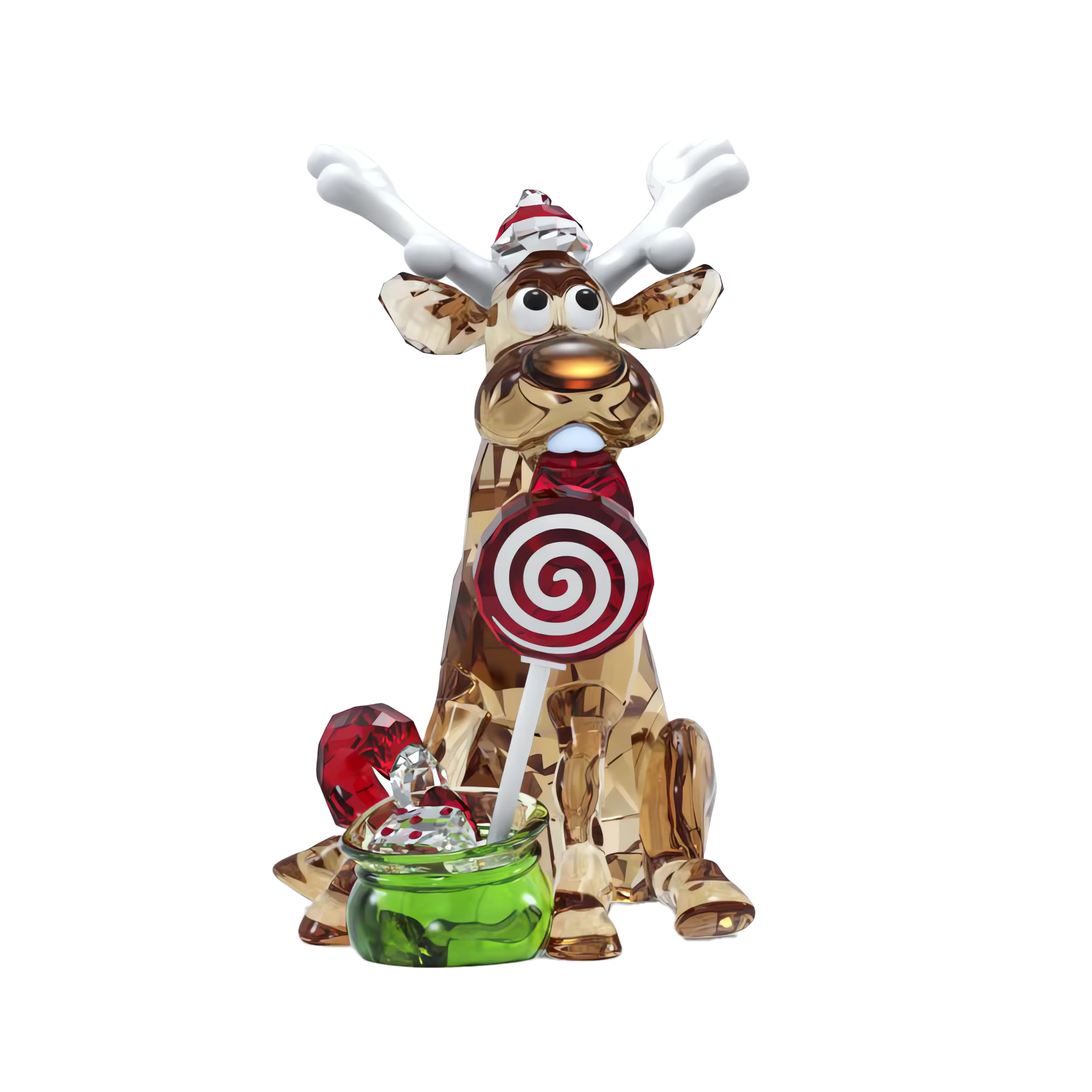 This delightful reindeer figurine will bring a touch of festive magic to your home. The playful design is crafted with 690 facets and features refined details,such as a green bag of candy and a mini Santa hat. White lacquered accents provide a sleek finish,while the reindeer’s cute expression will always raise a smile. A perfect collectible to celebrate the festive season. Decoration object. Not a toy. Not suitable for children under 15.