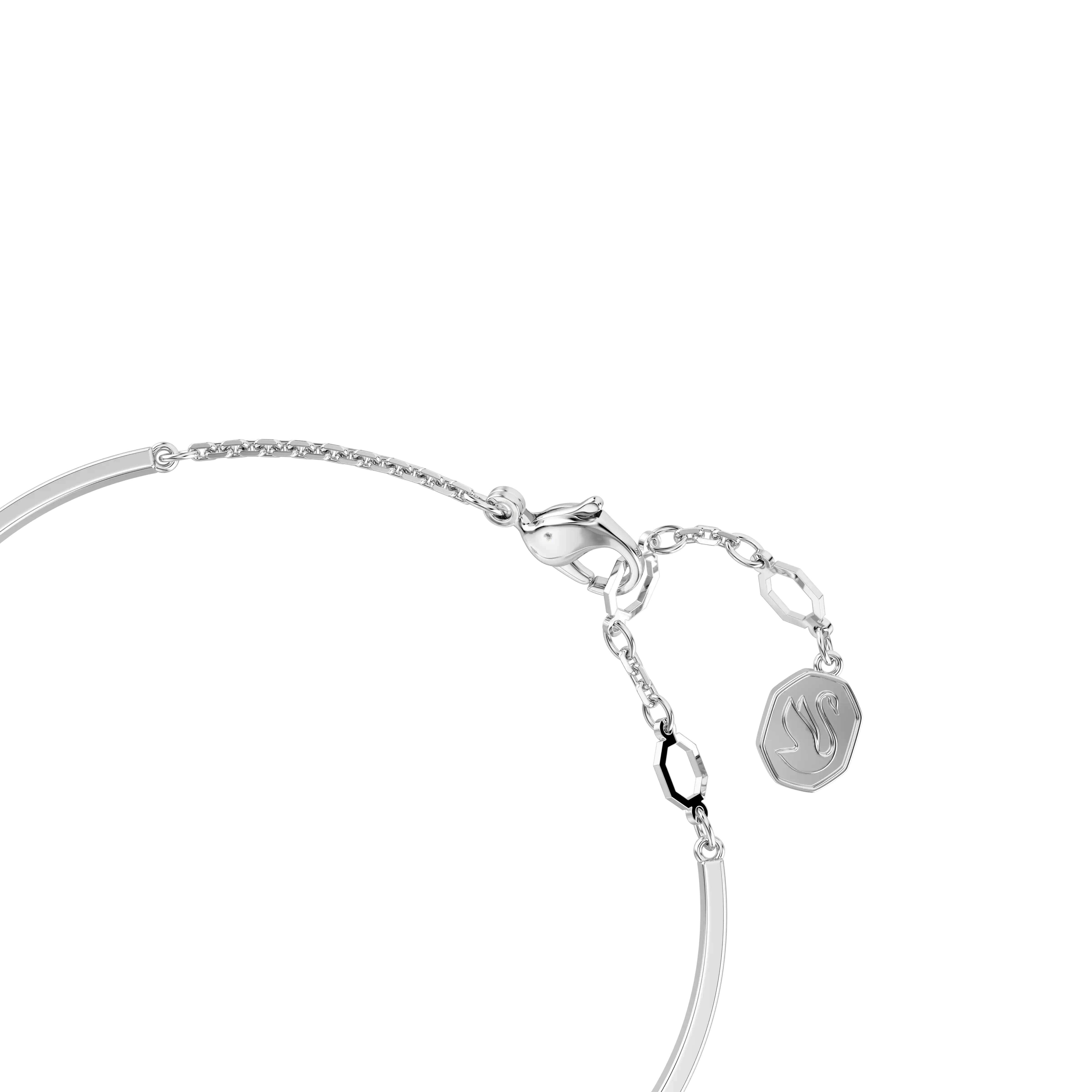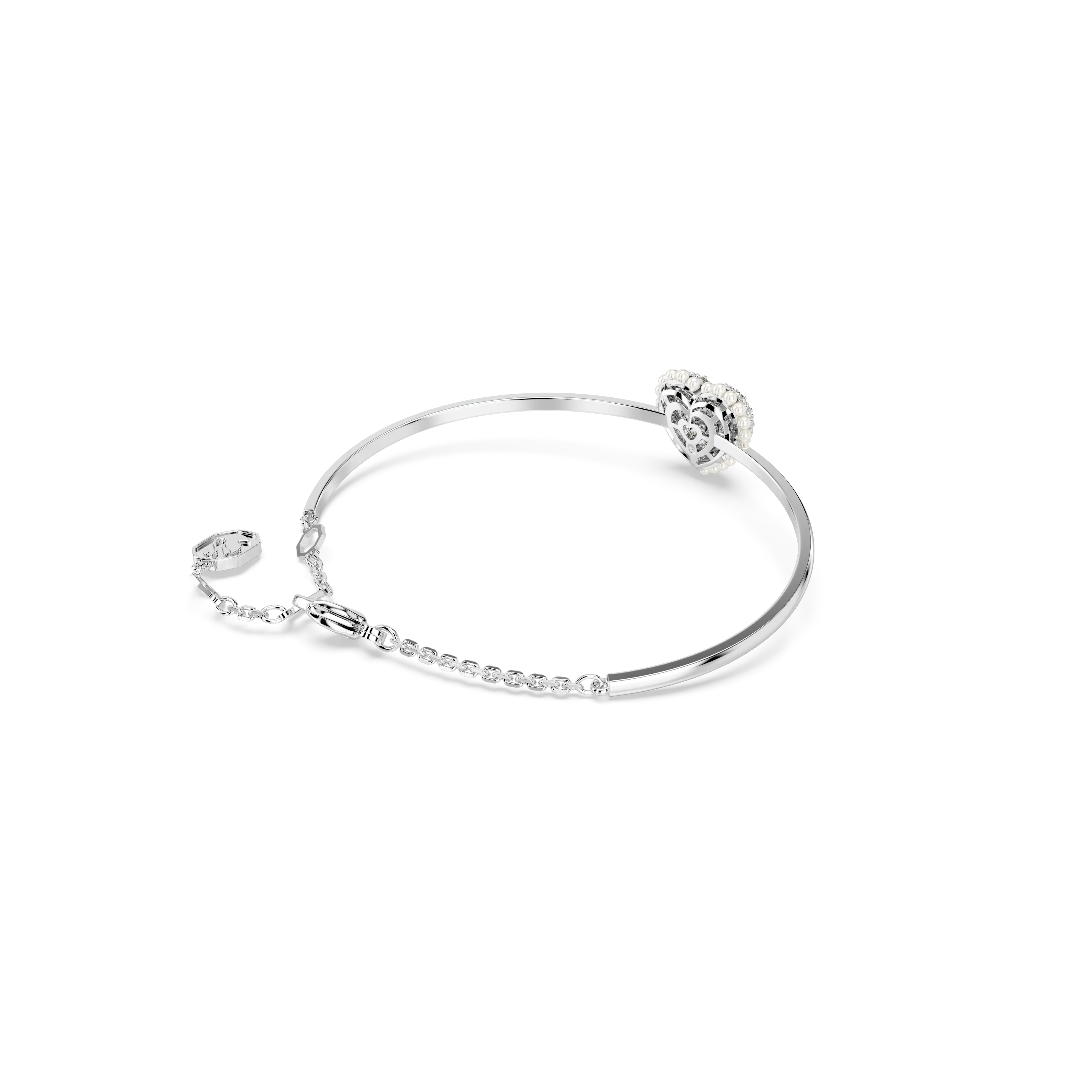 This rhodium-plated bangle is a subtle yet captivating expression of love. The heart-shaped motif has been created with a cage design for maximum volume. To enhance the domed effect,it is adorned with round clear Swarovski Zirconia,set in place using the dazzling chatonnage technique. Gift this as a special surprise to someone you adore.