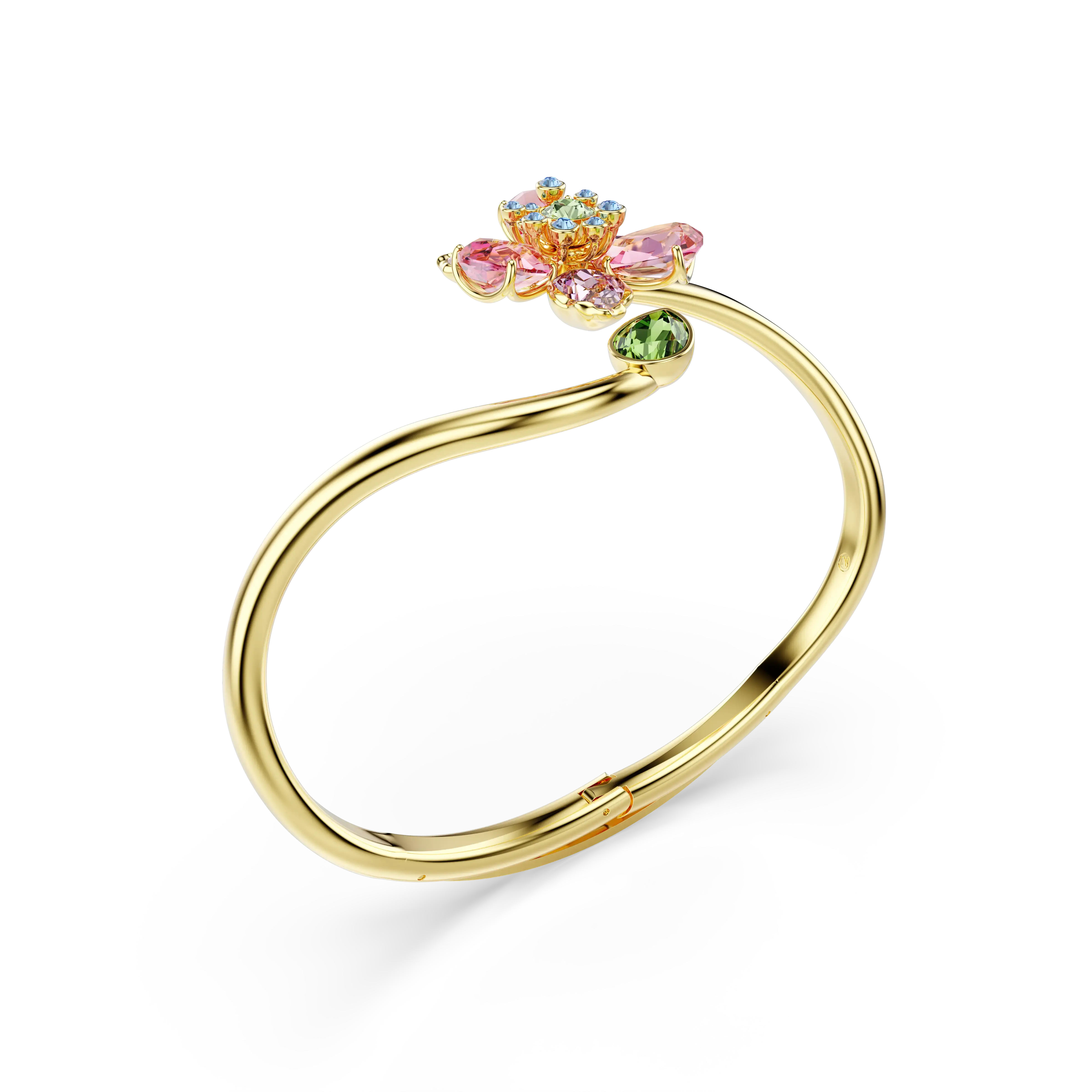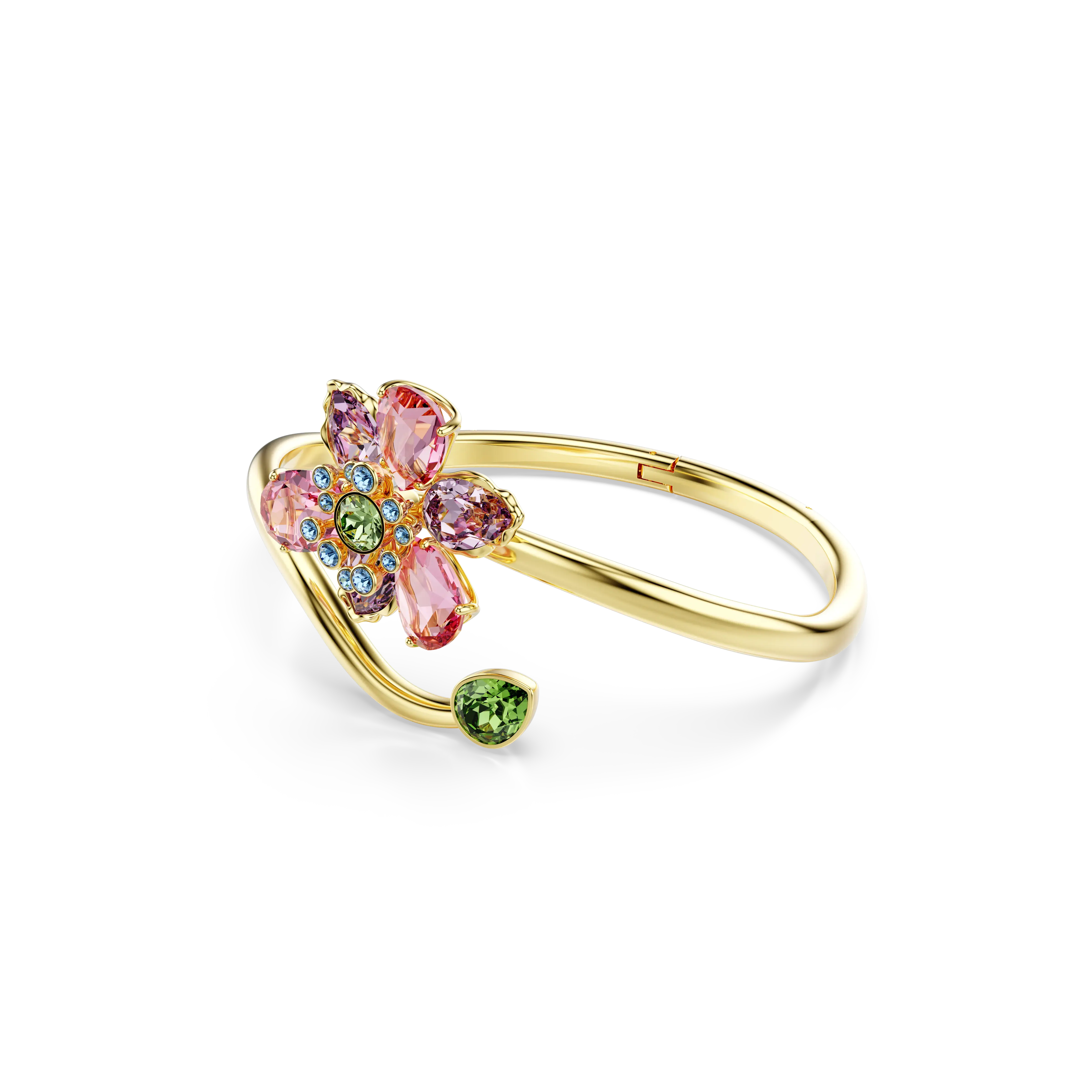 Bright,delicate,and beautiful. This magical Idyllia bangle surrounds the wrist with a spiraling gold-tone plated stem and features a central flower motif,which is expertly crafted with a variety of crystals in different shapes and colors. A Wonderclick closure at the bottom ensures an easy fit. Wear this bangle alongside other Idyllia pieces whenever you need more joy in your day.