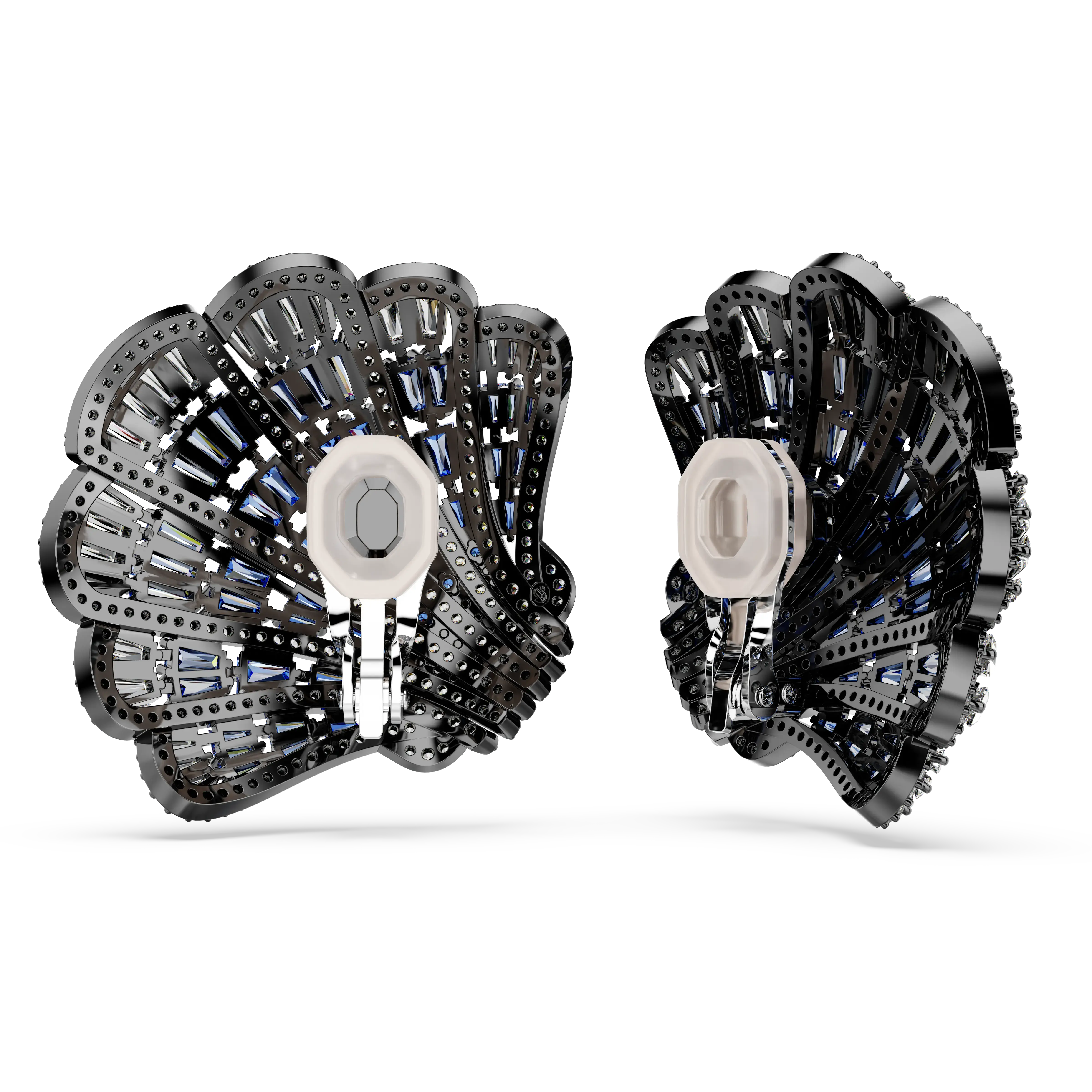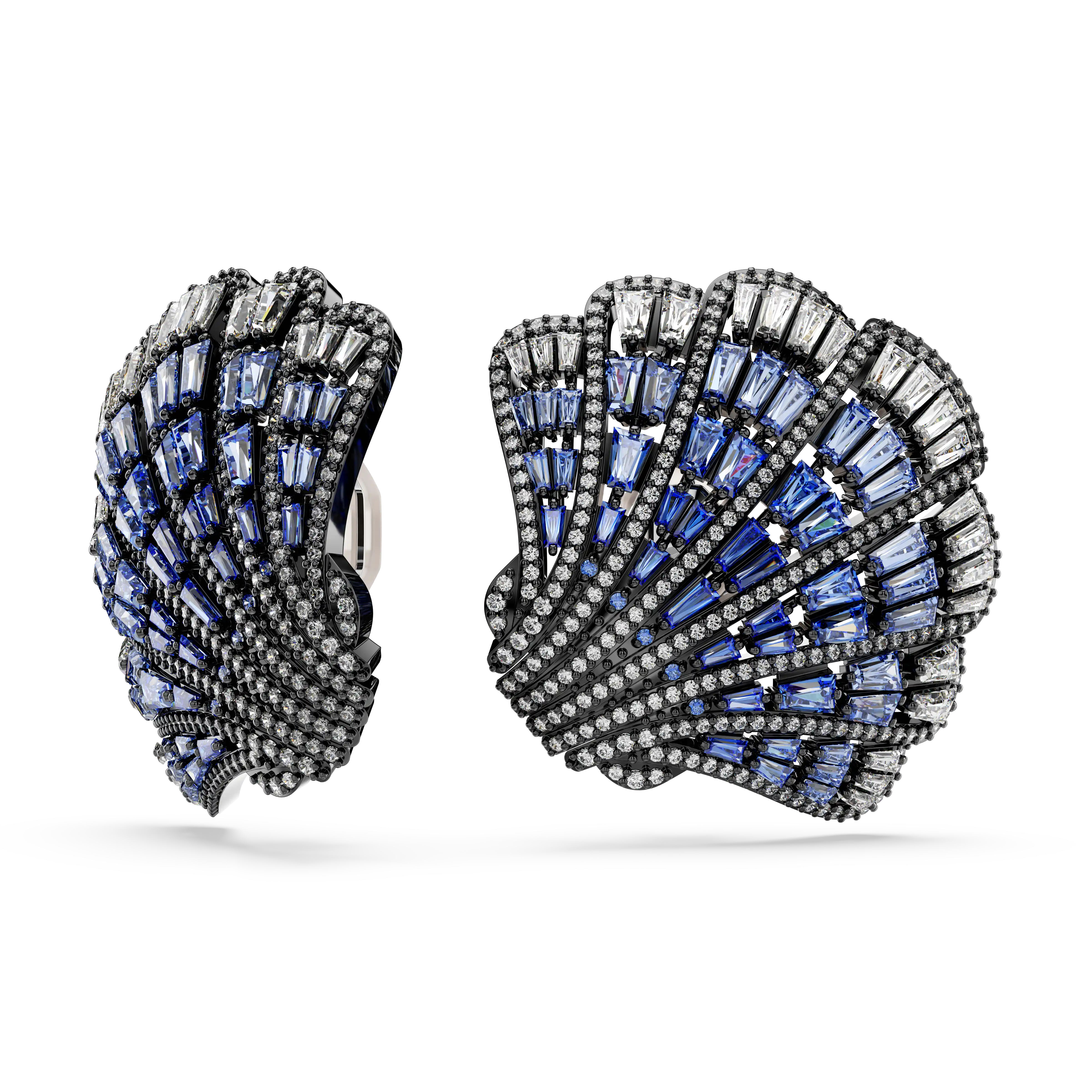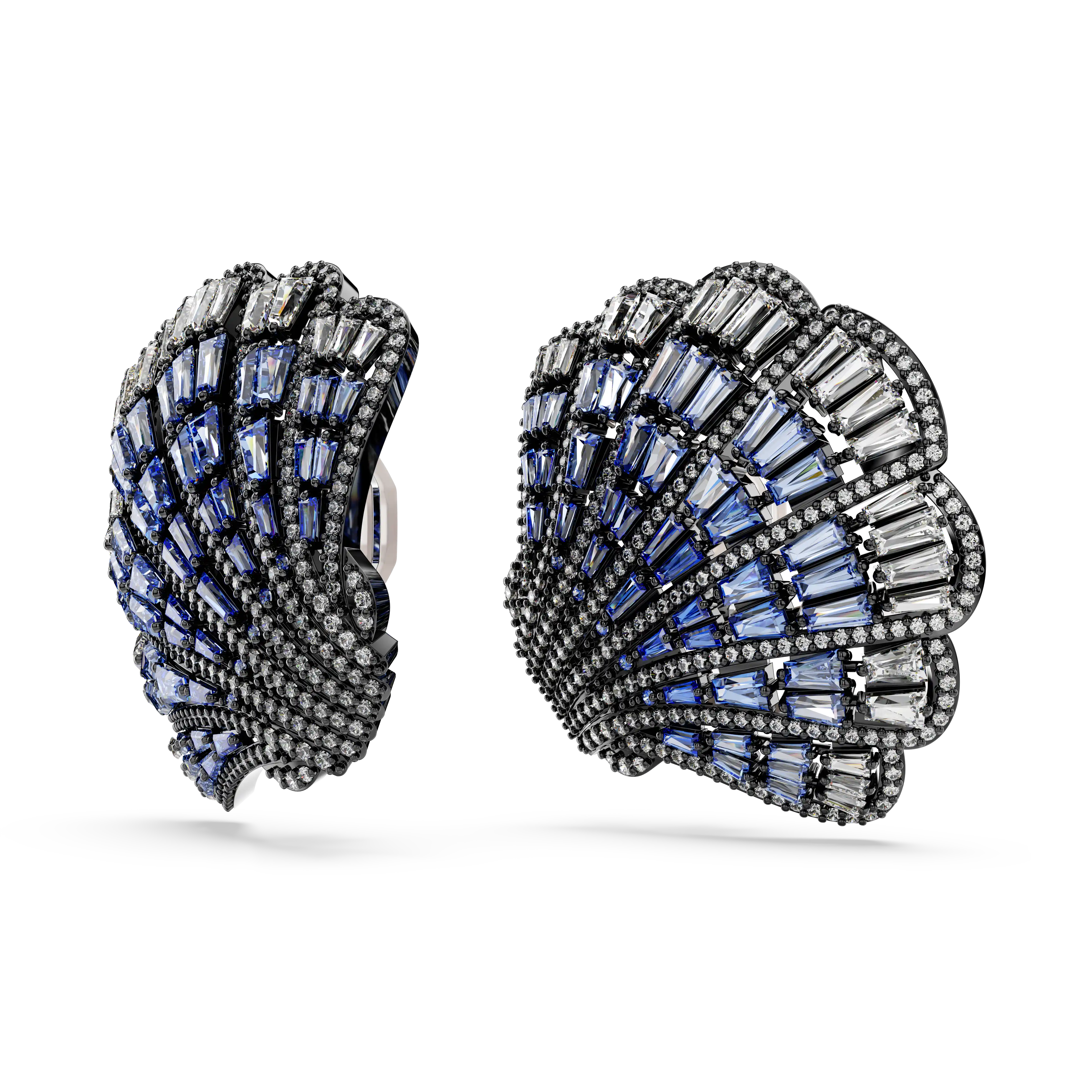 Inspired by the natural beauty of the ocean,these clip earrings are a showstopping addition to any outfit. Each shell design is ruthenium plated and embellished with an array of clear round crystals,along with a captivating gradient of Swarovski Zirconia in clear and blue tones. Large and brightly colored,this striking jewelry is a magical way to elevate your style.