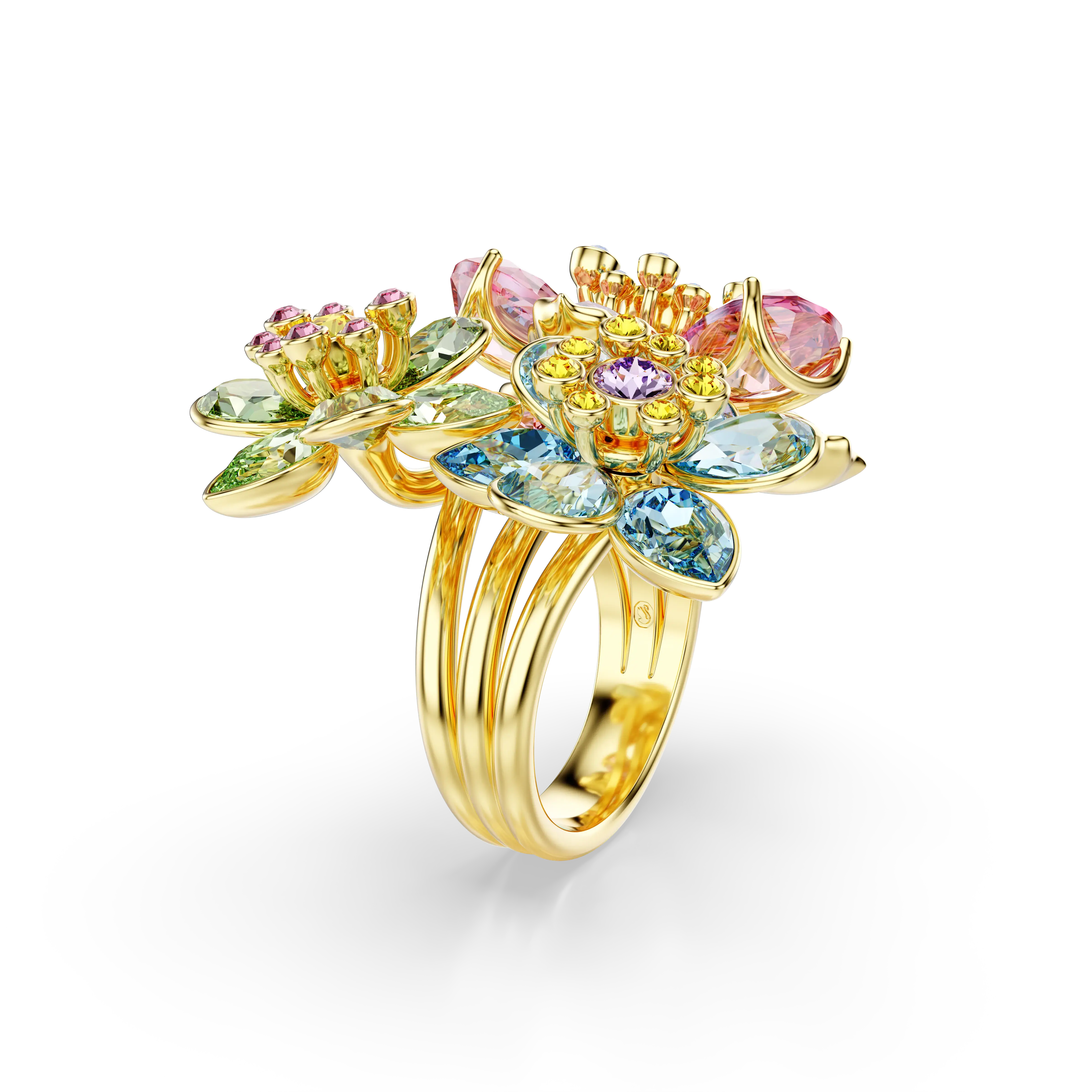 With this energizing motif ring,a feeling of joy is always within reach. The magical design is gold-tone plated and features a bouquet of three flowers in multicolored crystals. The different shapes and shades ensure there is wonder to be found in every detail. Wear this ring as a playful statement piece and exude happiness throughout the day.