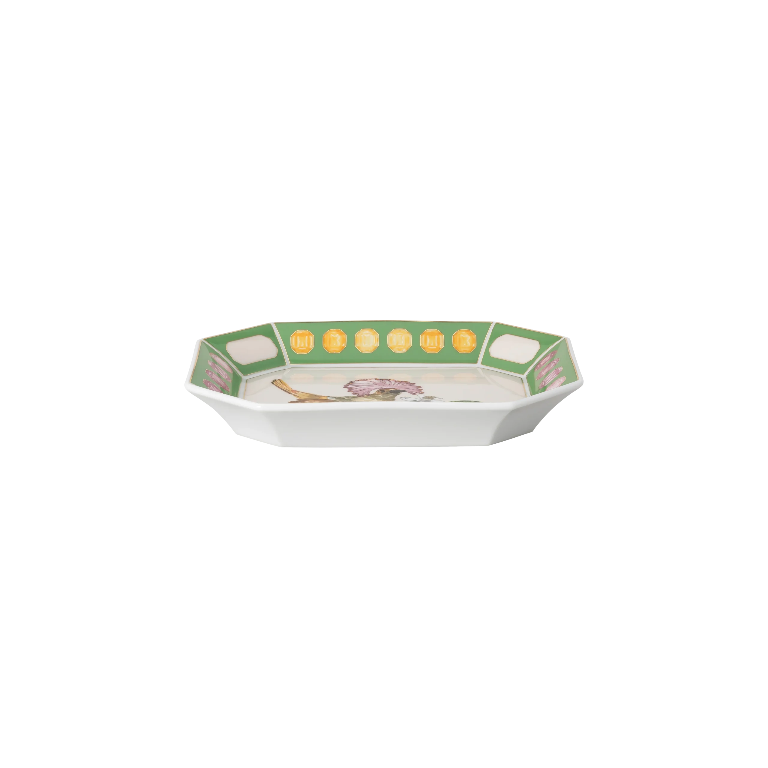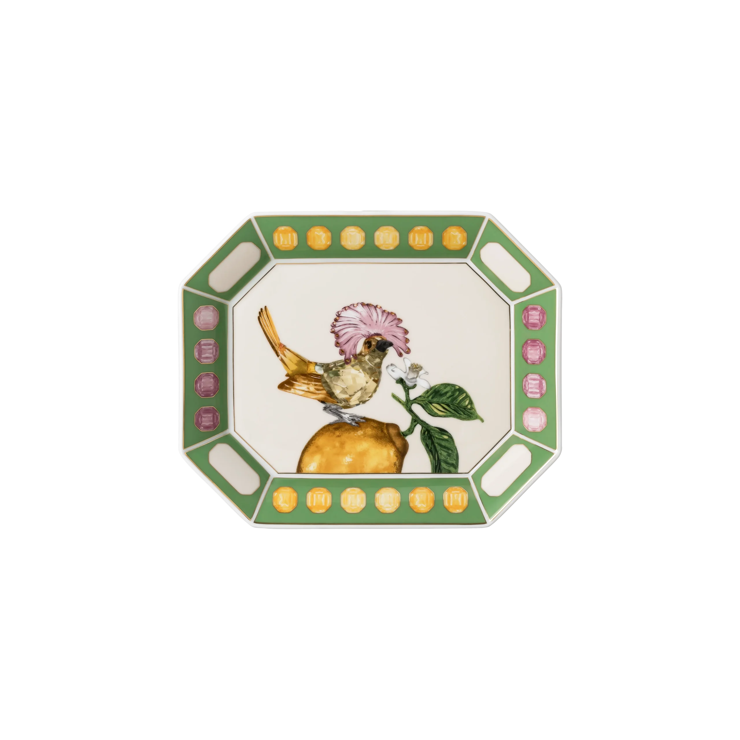 Master the art of table setting and home decor with this large Idyllia tray,featuring a majestic royal flycatcher perching on a lemon. The joyful motif is printed on the green and marshmallow porcelain using an exclusive technique that captures the essence and radiance of crystals. Created in partnership with porcelain brand Rosenthal,it is further decorated with fine gold-tone lines,giving you a beautiful way to elevate any space. This large tray is dishwasher safe,but not suitable for use in a microwave.