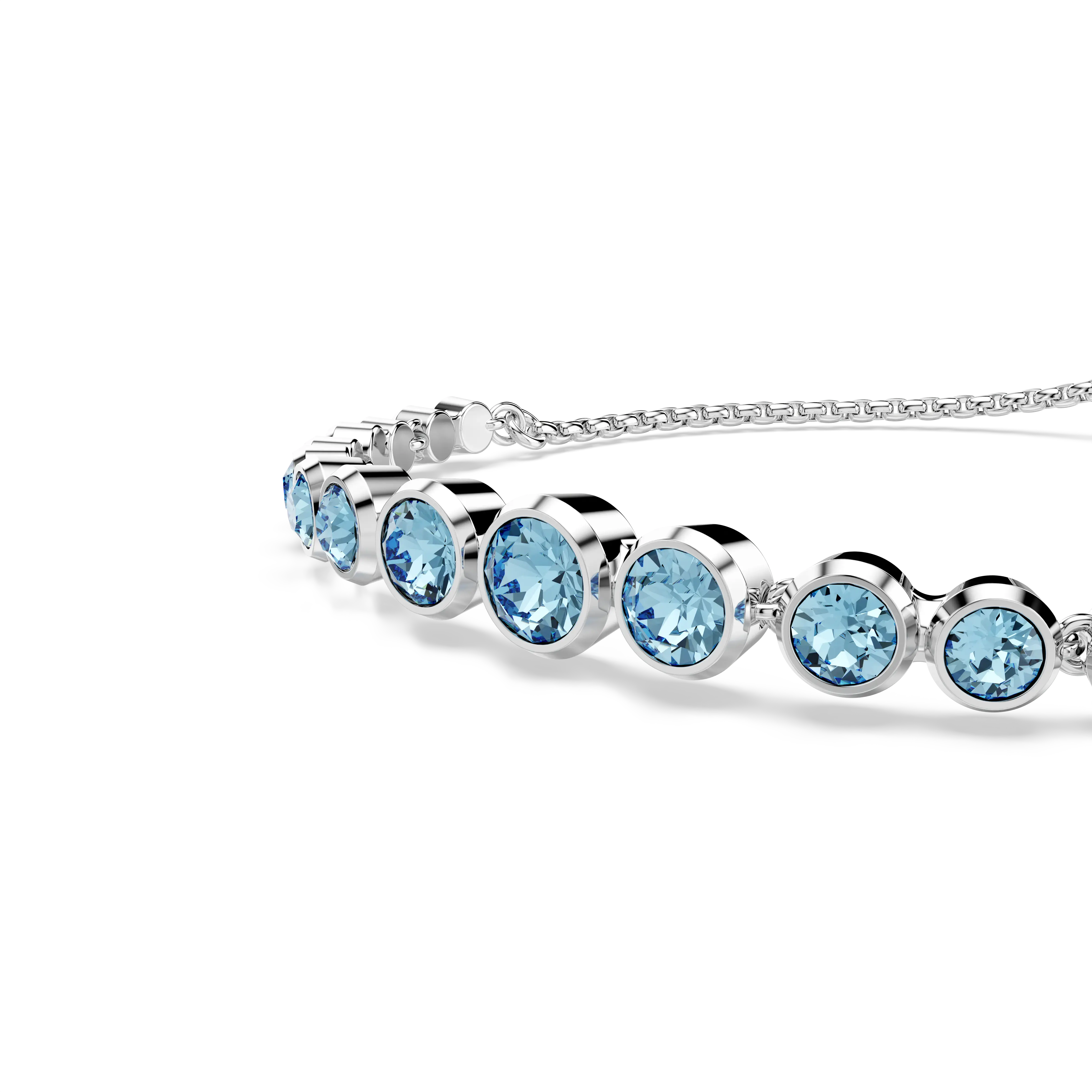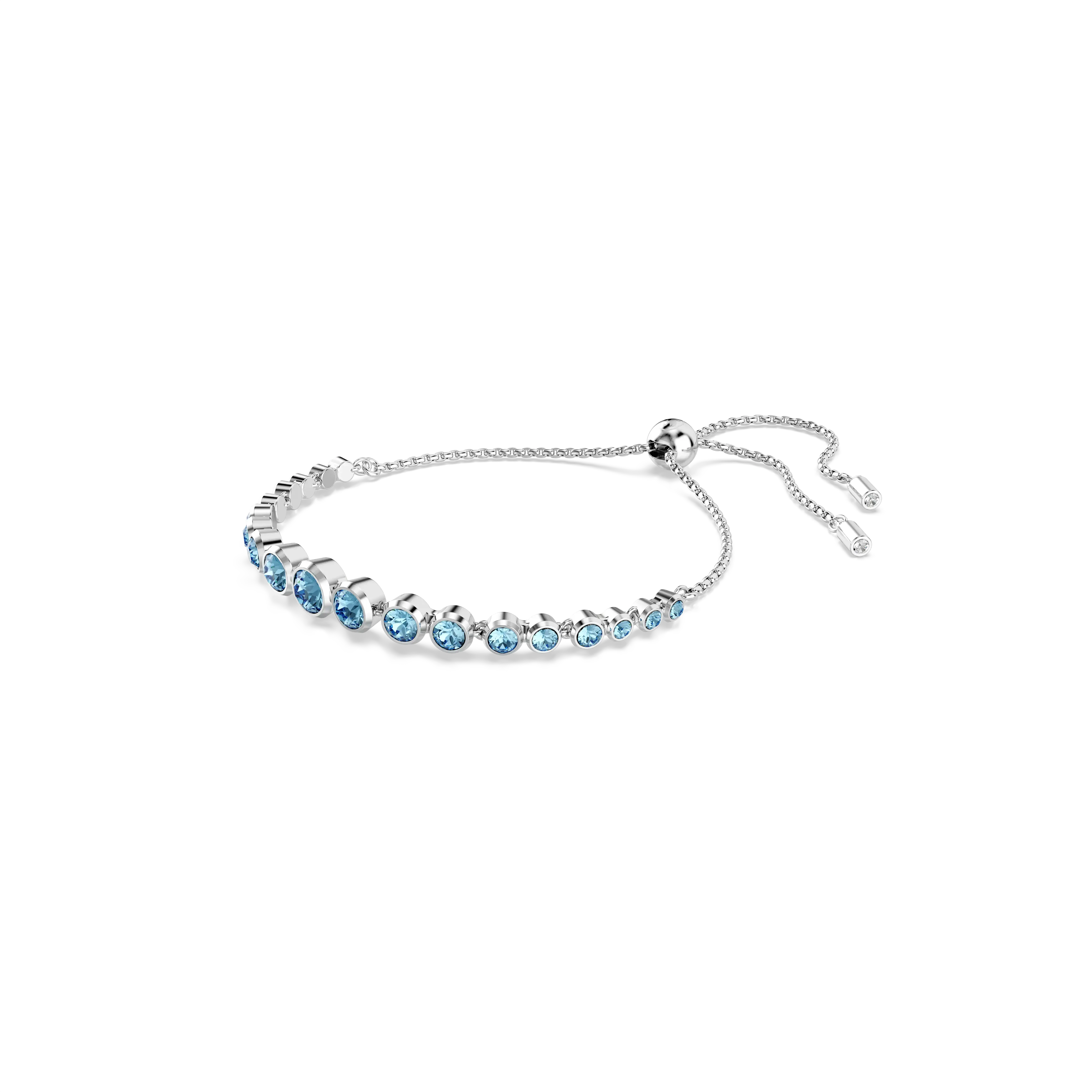 Made for everyday elegance,this rhodium plated bracelet exudes the simplicity of the Imber family. The design features a gradient of round-cut blue crystals,each placed in a modern bezel setting on a soft chain,with a sliding closure for easy wearability. Each delicate drop provides colorful sophistication for your wrist,giving you a go-to piece of jewelry that can be playfully stacked with other styles.