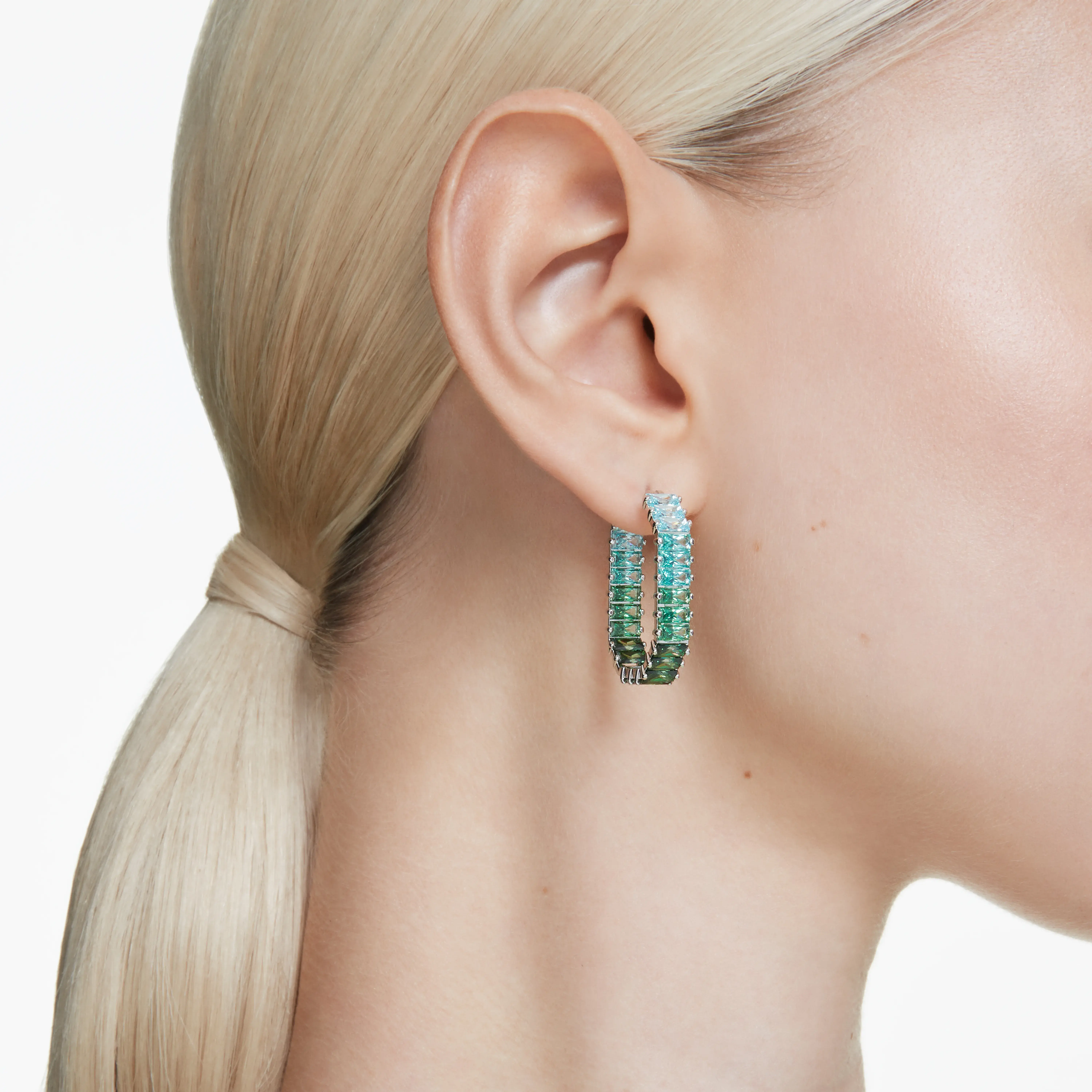 Matrix hoop earrings Baguette cut/Heart/Small/White/Rhodium plated