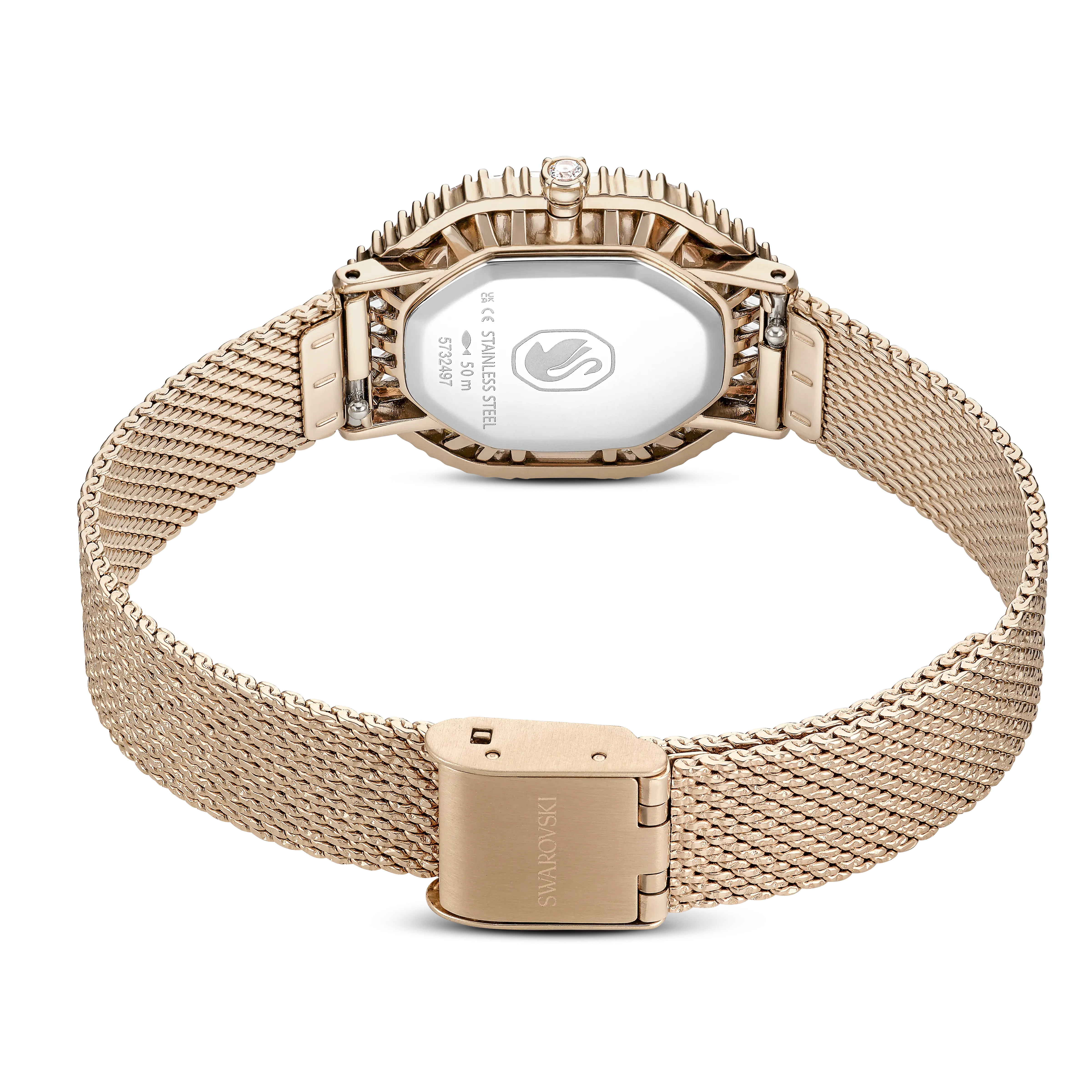 This innovative timepiece is a one-of-a-kind creation that combines signature design with mastery of light. Crafted with genuine savoir-faire,the watch is inspired by the Matrix jewelry family and features a 13 x 18 mm stainless steel case with a champagne gold-tone finish. The bezel is presented in the House’s signature octagon shape and is set with a stunning mix of 78 round and fancy cut crystals and Swarovski Zirconia. This provides a radiant frame for the minimalist sunray dial,which elegantly displays three crystal hour markers and a swan logo. A single crystal is also placed within the crown,while around the wrist,the luxury is heightened further by an adjustable mesh bracelet. This watch is water-resistant to 50m and symbolizes Swarovski’s modern luxury at its finest.