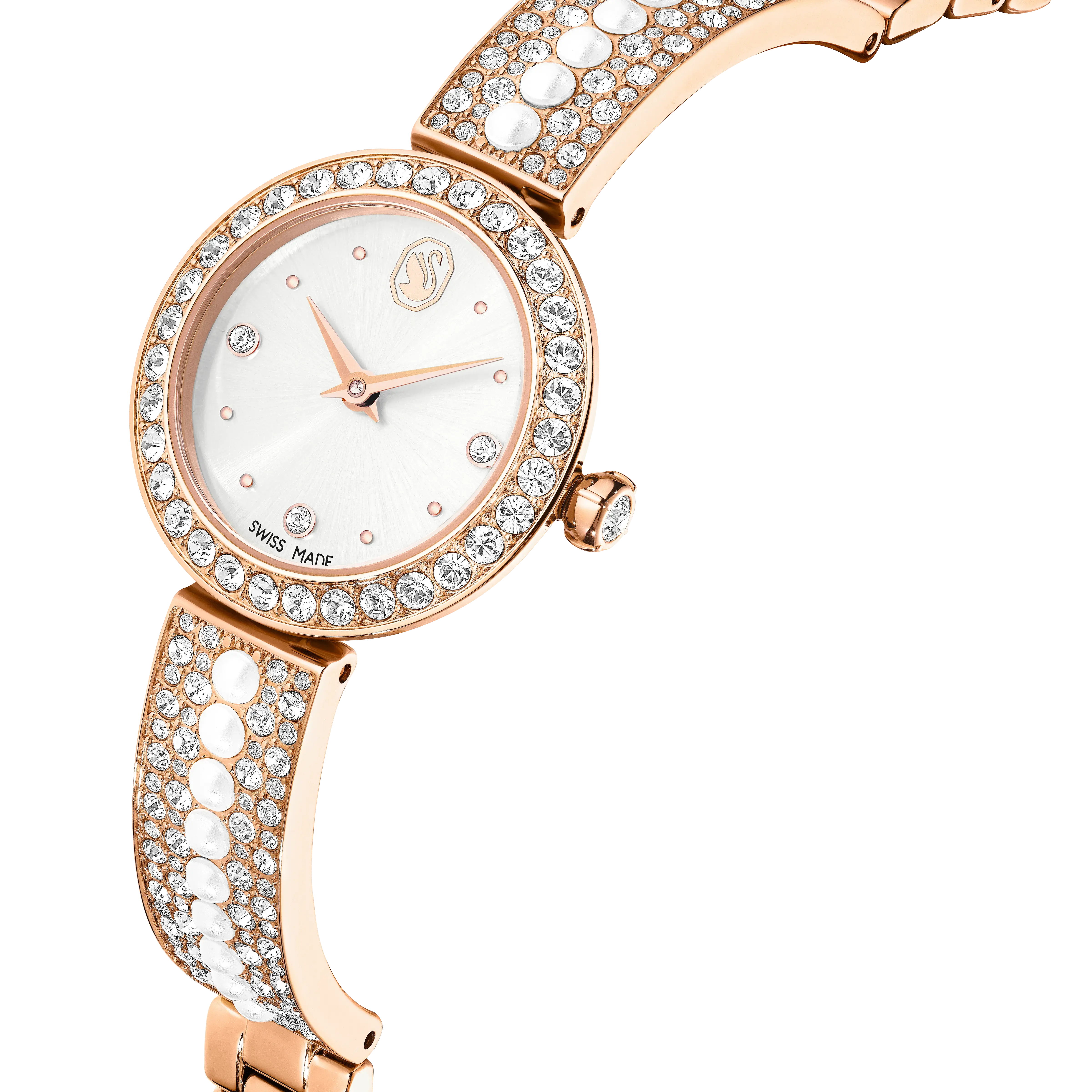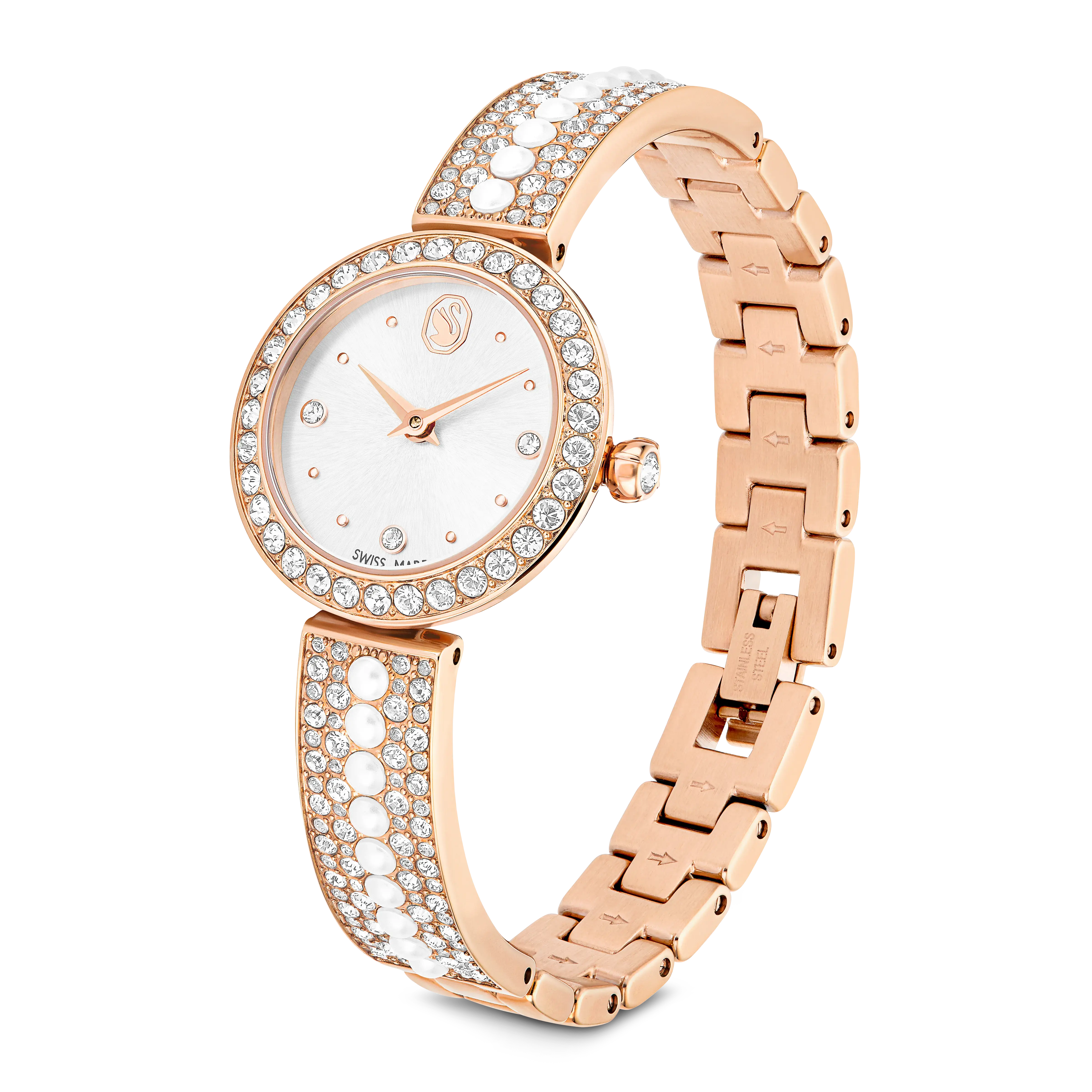 Like a radiant piece of jewelry around the wrist,this Matrix Pearl Bangle watch is the ultimate time-telling accessory. The 26mm stainless steel design is rose gold-tone finished and features 33 pavé crystals on the bezel. The sunray dial is further accented with crystals for the hour markers and includes a swan logo at 12 o’clock. For a truly stunning effect,the watch’s bracelet is exquisitely decorated with 152 clear pavé crystals and a central row of 18 Swarovski Crystal Pearls. This Swiss Made watch is water resistant to 50 meters and can be worn alongside jewelry from the Matrix family for a luxurious overall look.