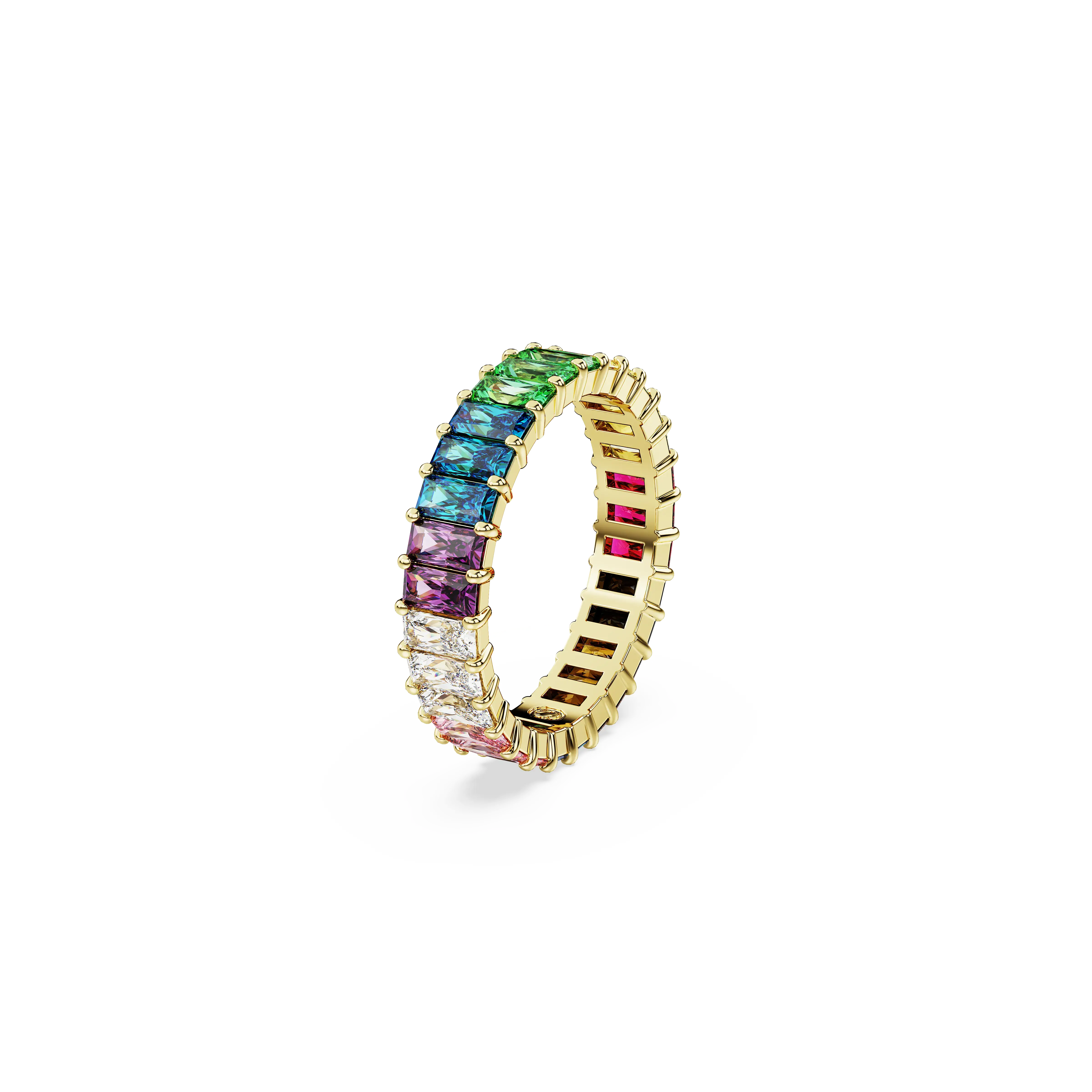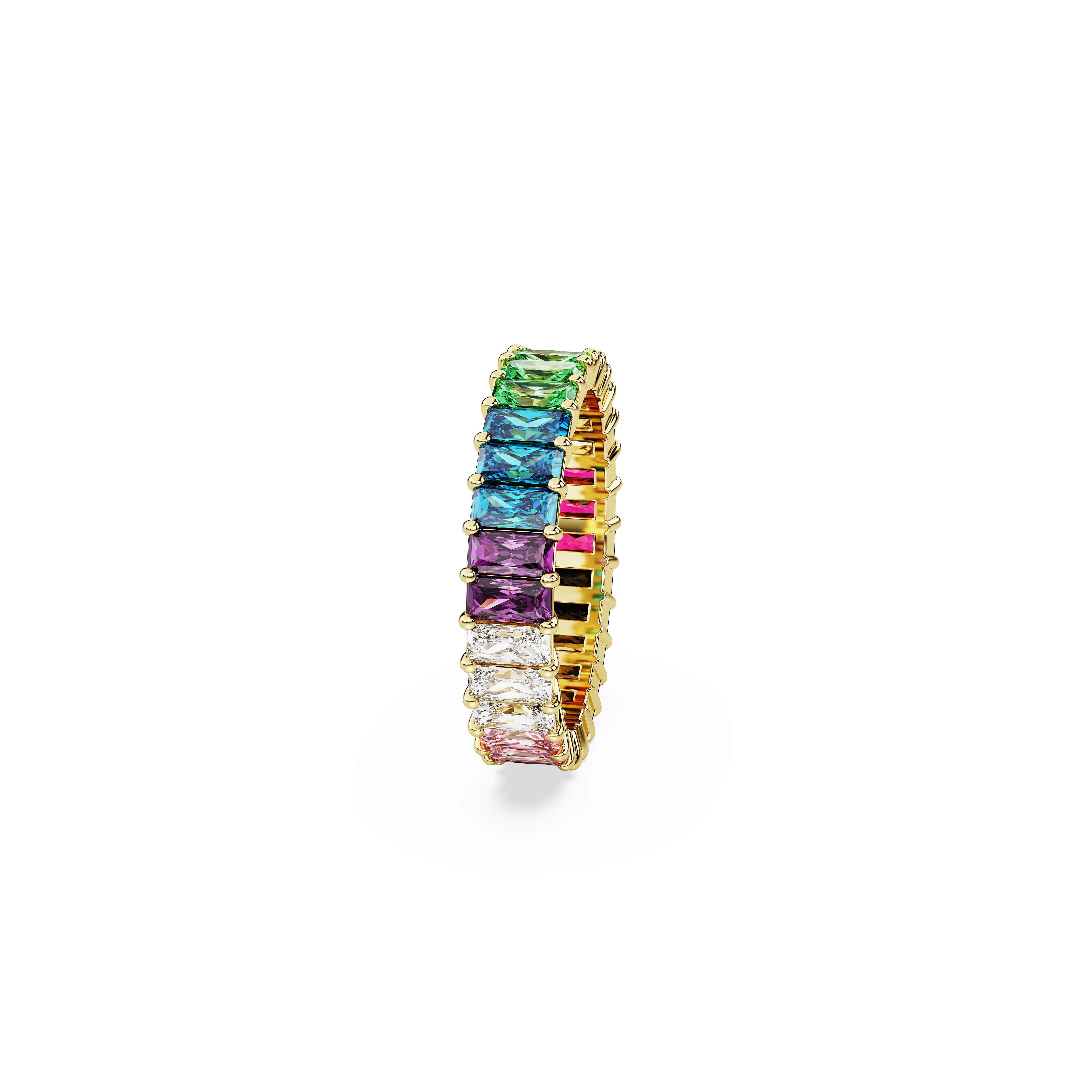 Featuring a vibrant array of rainbow colors,this Matrix ring is filled with joy and elegance. The gold-tone plated band delivers a full circle of baguette-cut stones,each placed in a refined prong setting. This jewelry is made for self-expression and pairs beautifully with our matching earrings.