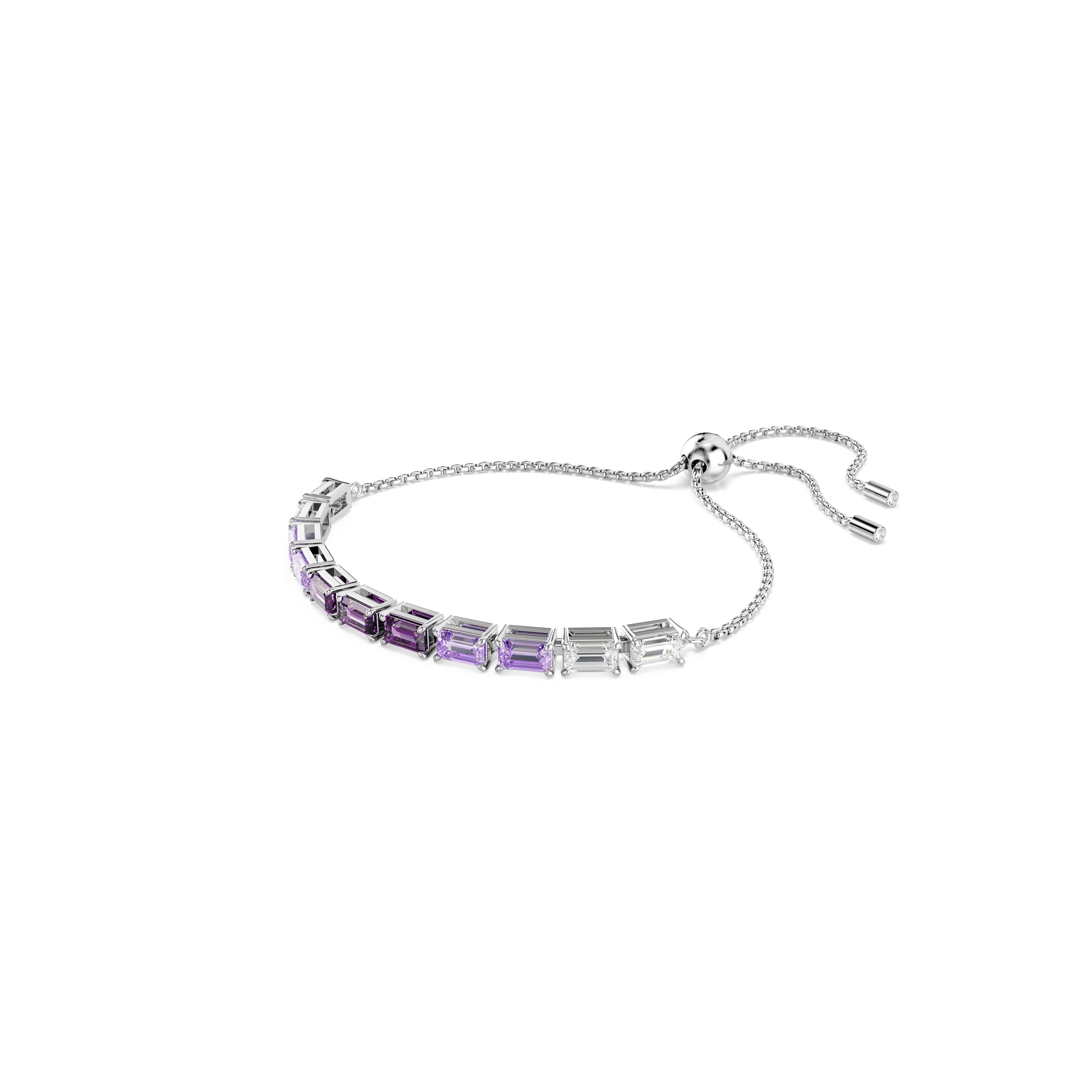 Swarovski’s flair for creativity shines through this bright and playful bracelet. Crafted with a sliding closure,the rhodium plated design is decorated with a row of octagon step-cut Swarovski Zirconia,each placed in a prong setting and presented in a gradient of color from clear to purple. Perfect for layering with other bracelets to tell your own style story.