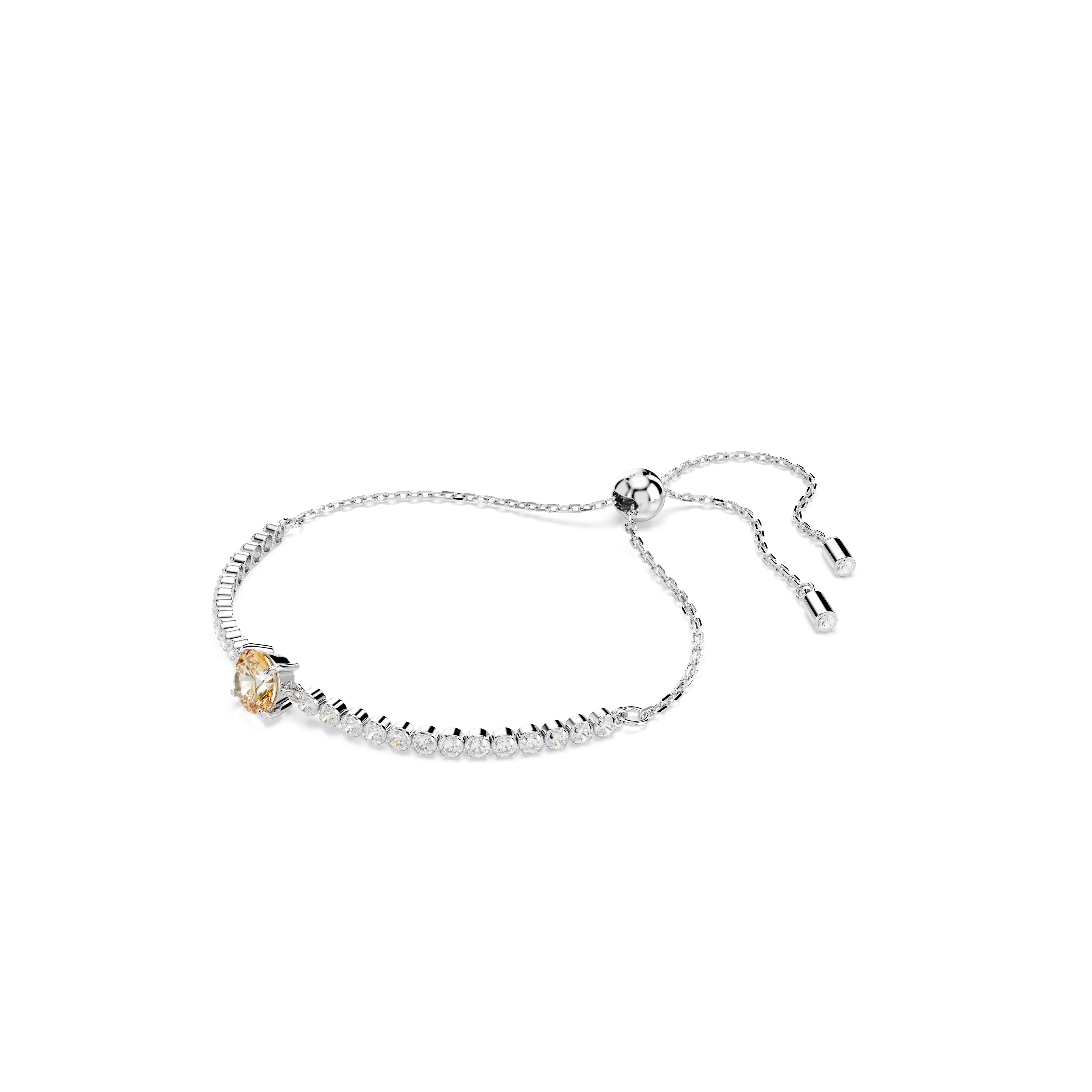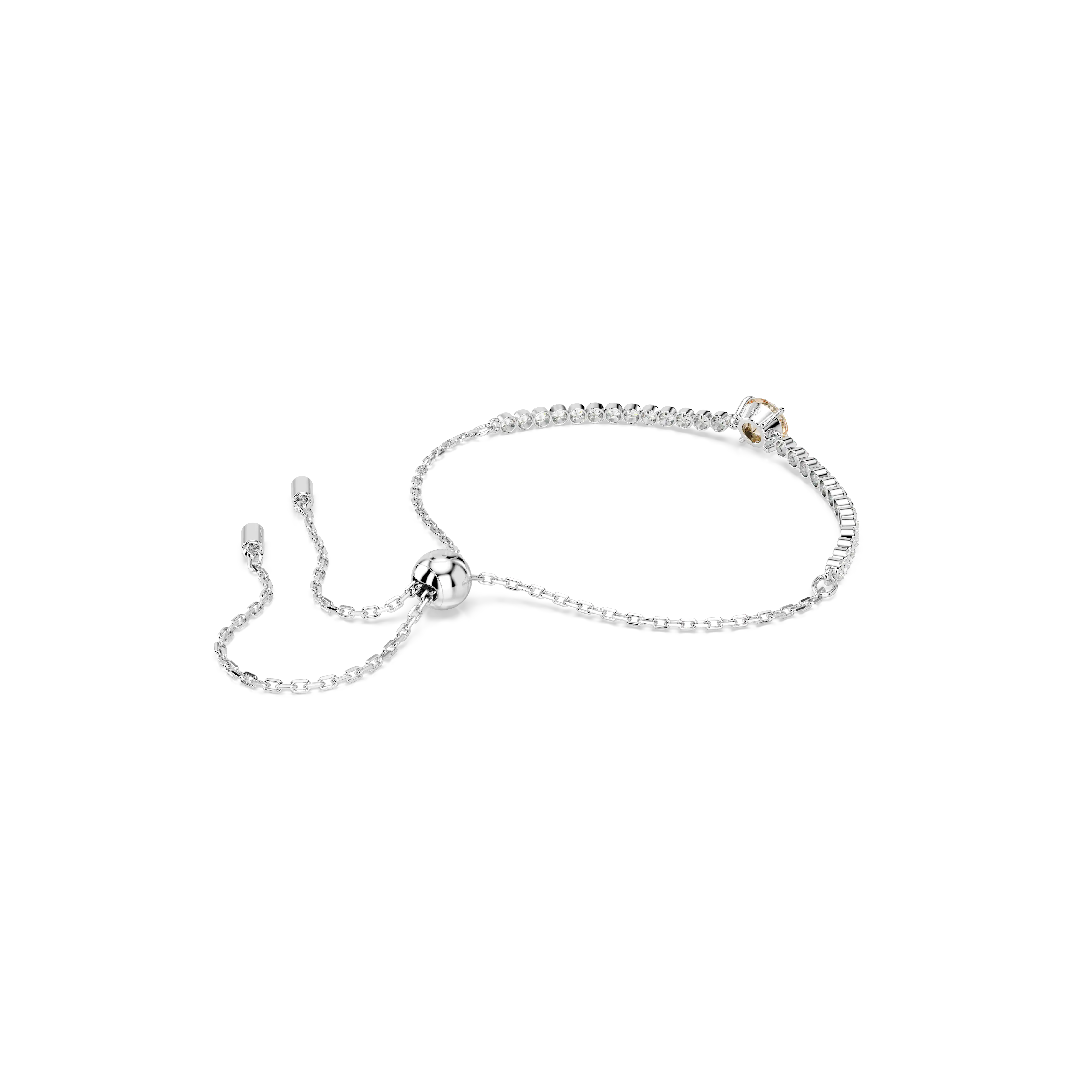 A fresh take on the classic tennis bracelet,this Matrix piece pairs clear Swarovski Zirconia with a glowing pop of color. Fastened with a sliding closure,the rhodium plated jewelry features a uniform row of clear Swarovski Zirconia accented with a round-cut champagne Swarovski Zirconia at the center. A joyfully radiant piece that will enhance any outfit.