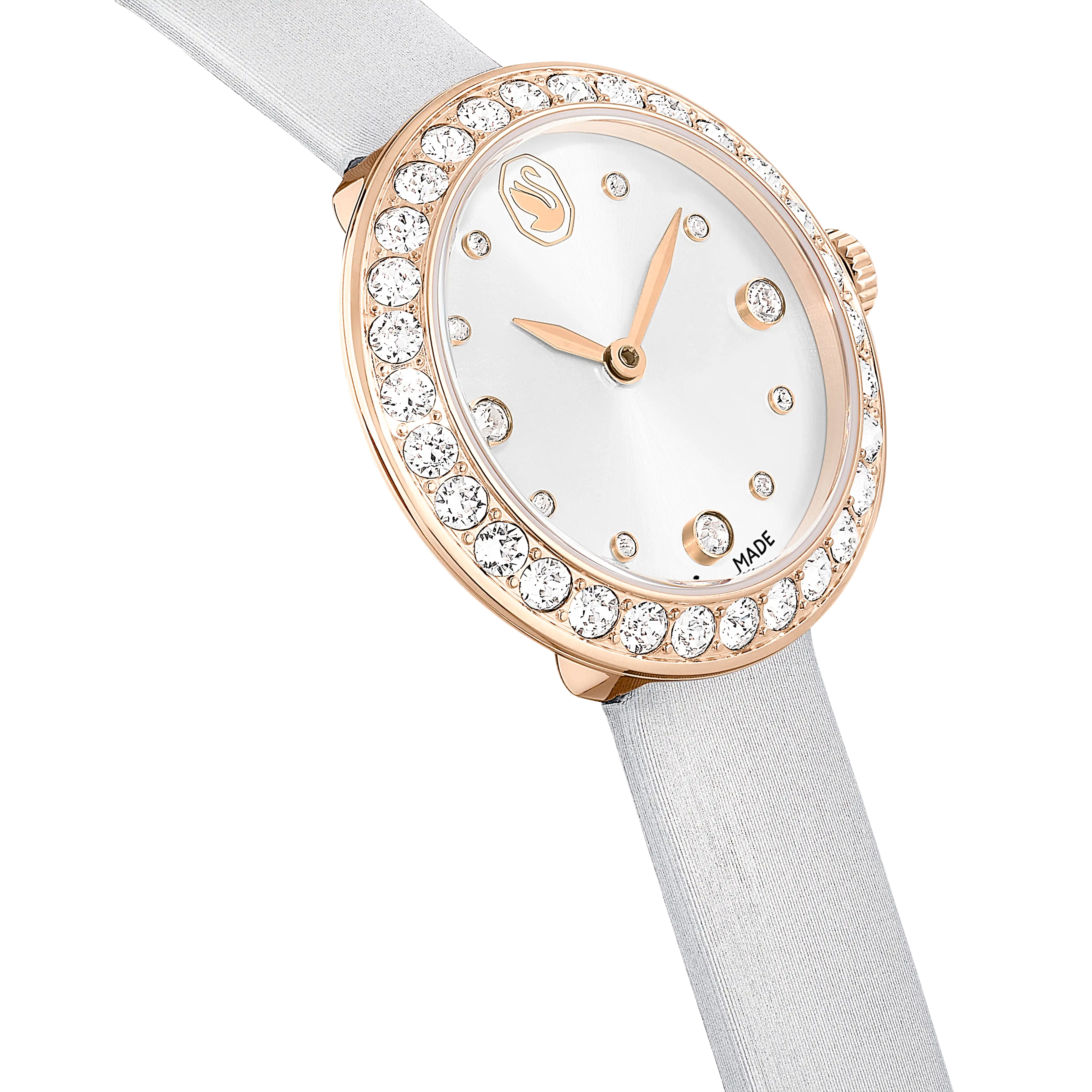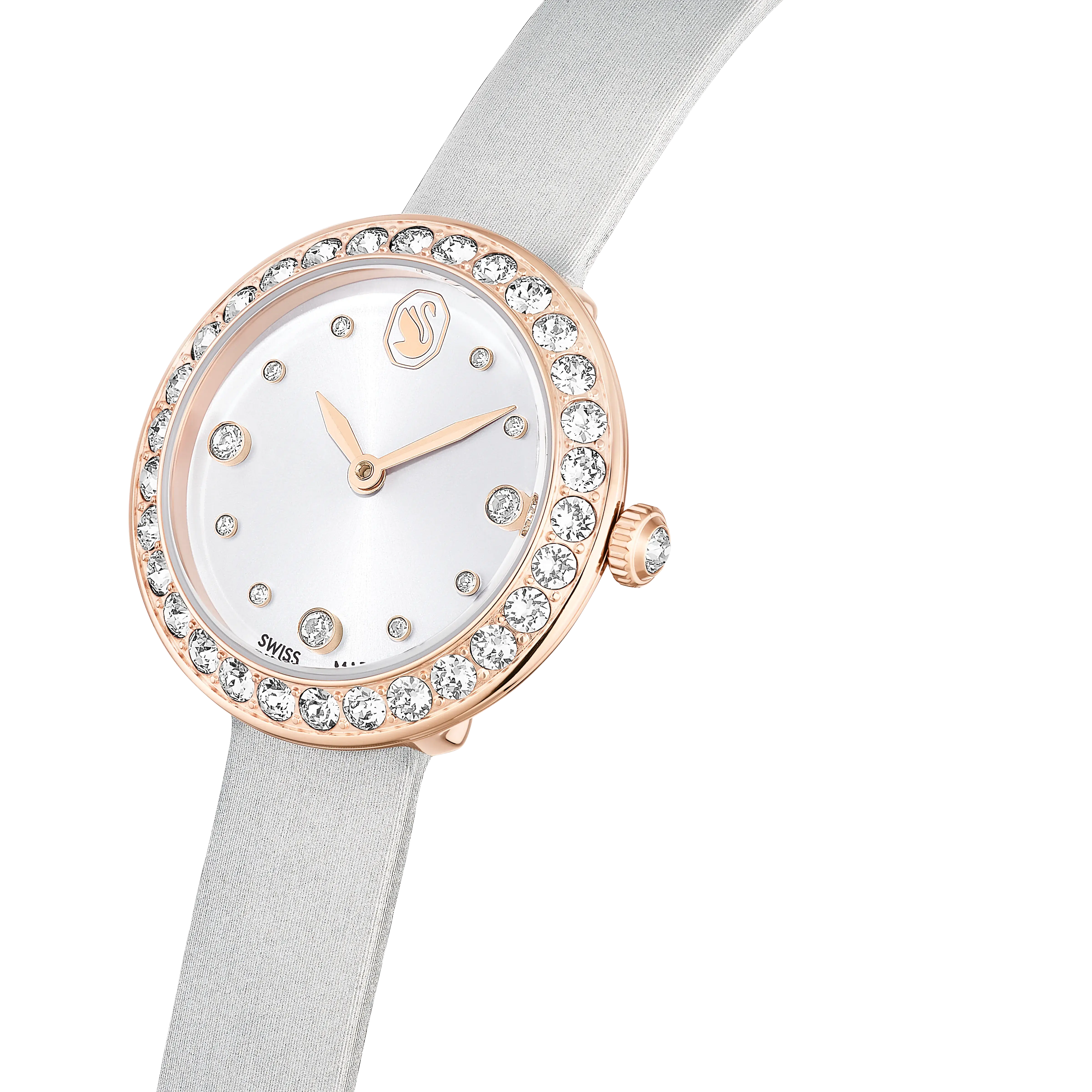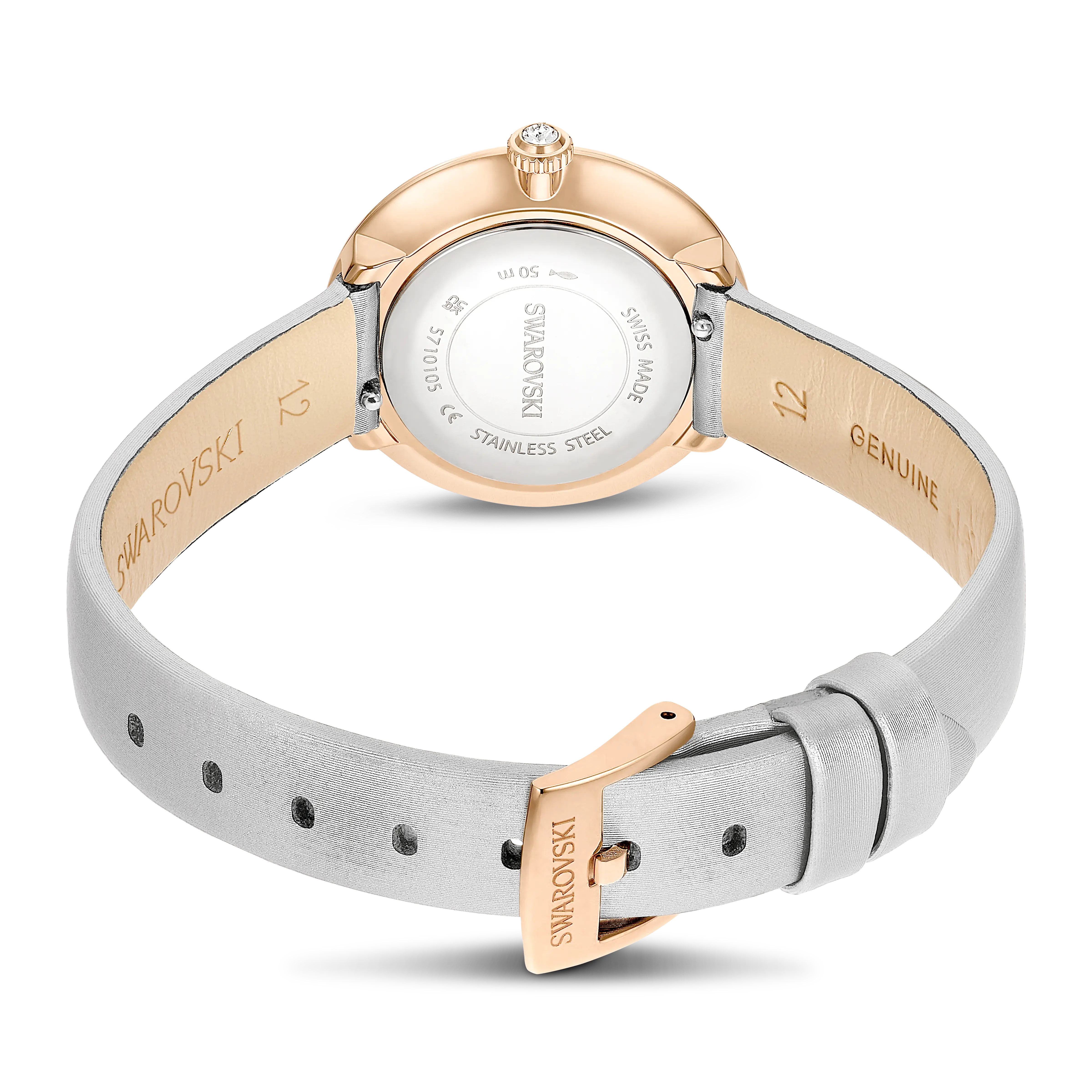 Echoing the iconic form of Swarovski’s Matrix Tennis jewelry,this watch makes its own elegant impression with crystals. The 30-mm stainless steel design has a rose gold-tone finish and features a pavé of 30 clear crystals on the bezel. The sunray dial is further accented with crystals for the hour markers and includes a swan logo at 12 o’clock. Around the wrist,comfort is provided by the gray leather strap,which includes satin finishing and a quick-release system. This Swiss made watch is water resistant to 50 meters and is completed with a single crystal placed in the crown. Wear it alongside jewelry from the Matrix Tennis family for a seamless overall look.