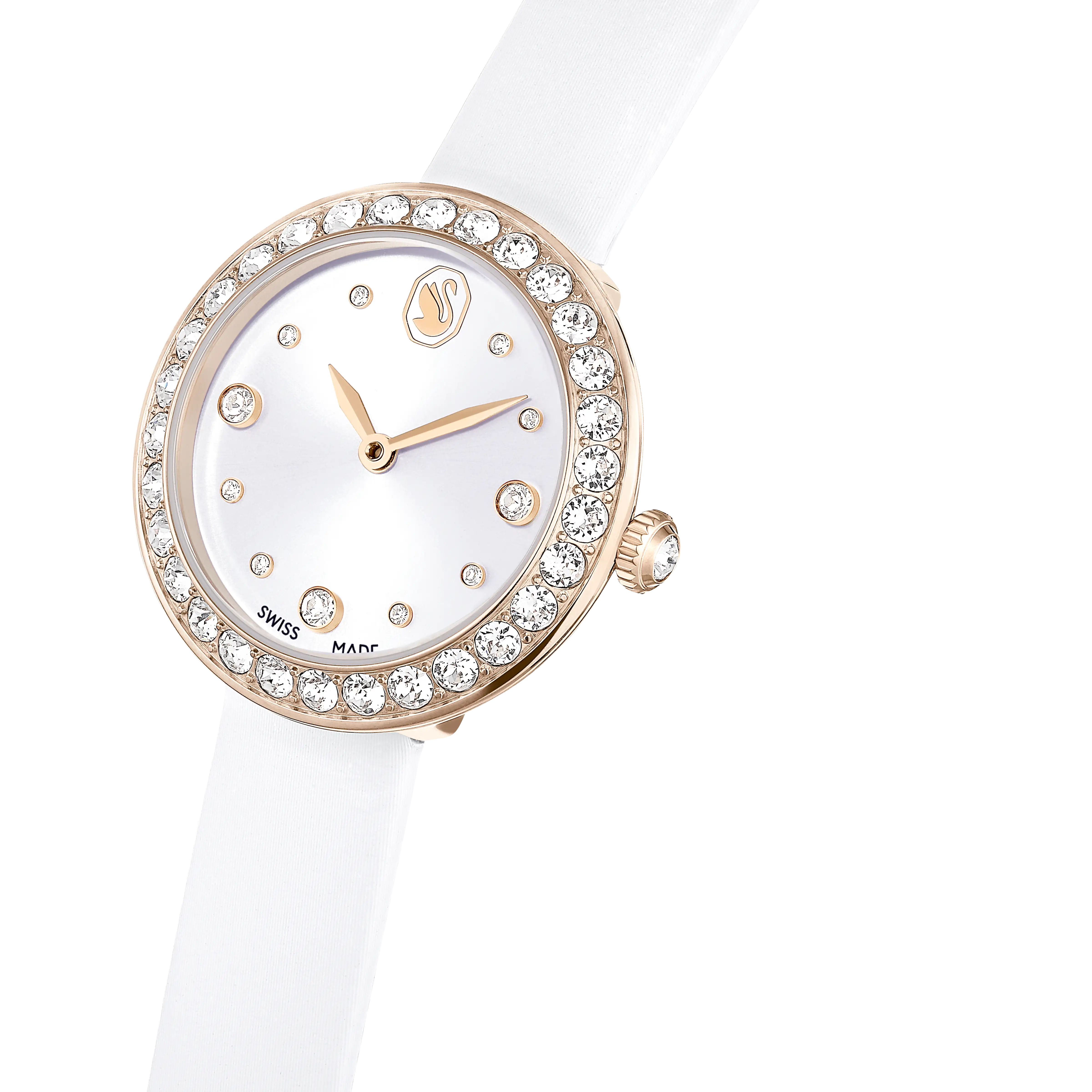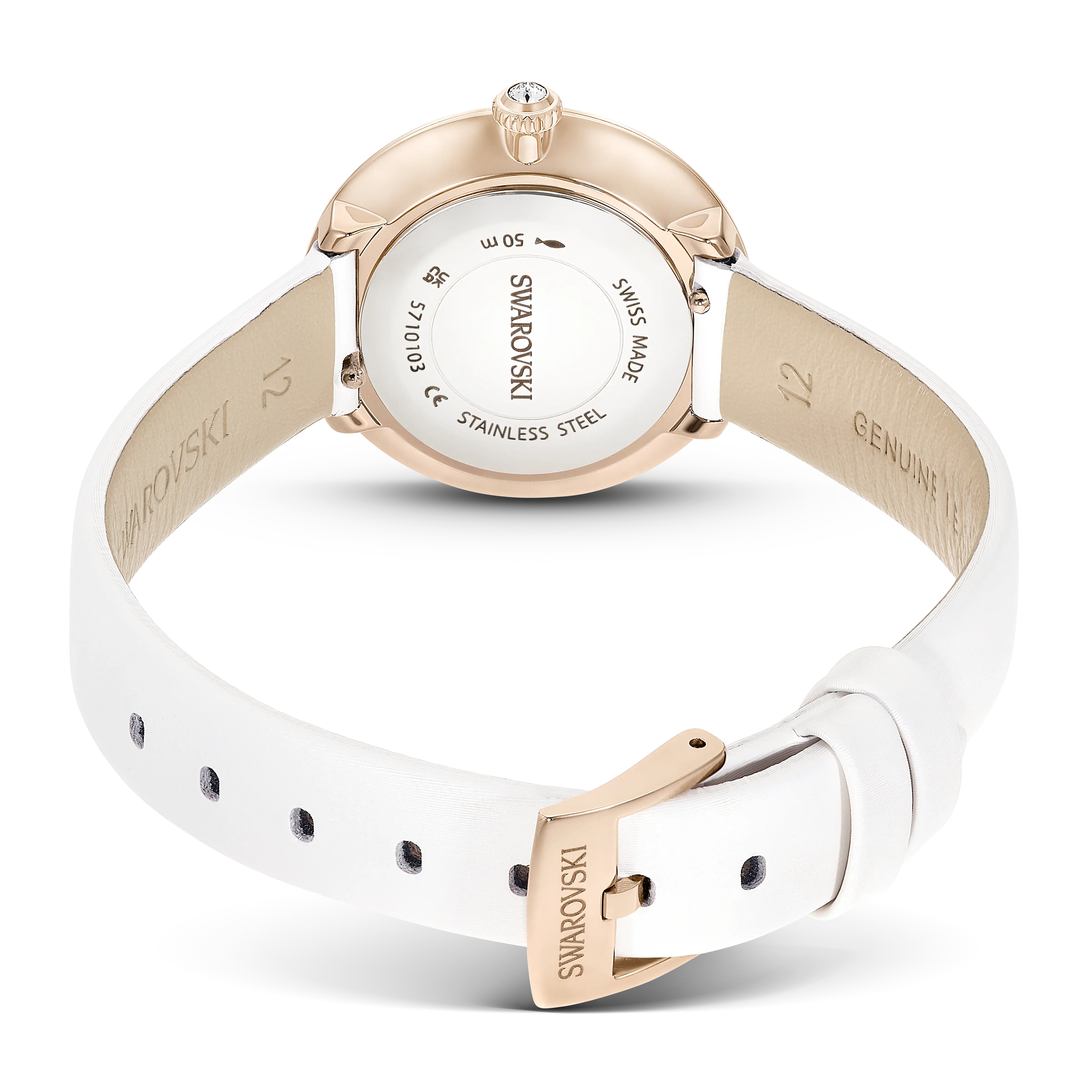 Echoing the iconic form of Swarovski’s Matrix Tennis jewelry,this watch makes its own elegant impression with crystals. The 30-mm stainless steel design has a champagne gold-tone finish and features a pavé of 30 clear crystals on the bezel. The sunray dial is further accented with crystals for the hour markers and includes a swan logo at 12 o’clock. Around the wrist,comfort is provided by the white leather strap,which includes satin finishing and a quick-release system. This Swiss made watch is water resistant to 50 meters and is completed with a single crystal placed in the crown. Wear it alongside jewelry from the Matrix Tennis family for a seamless overall look.