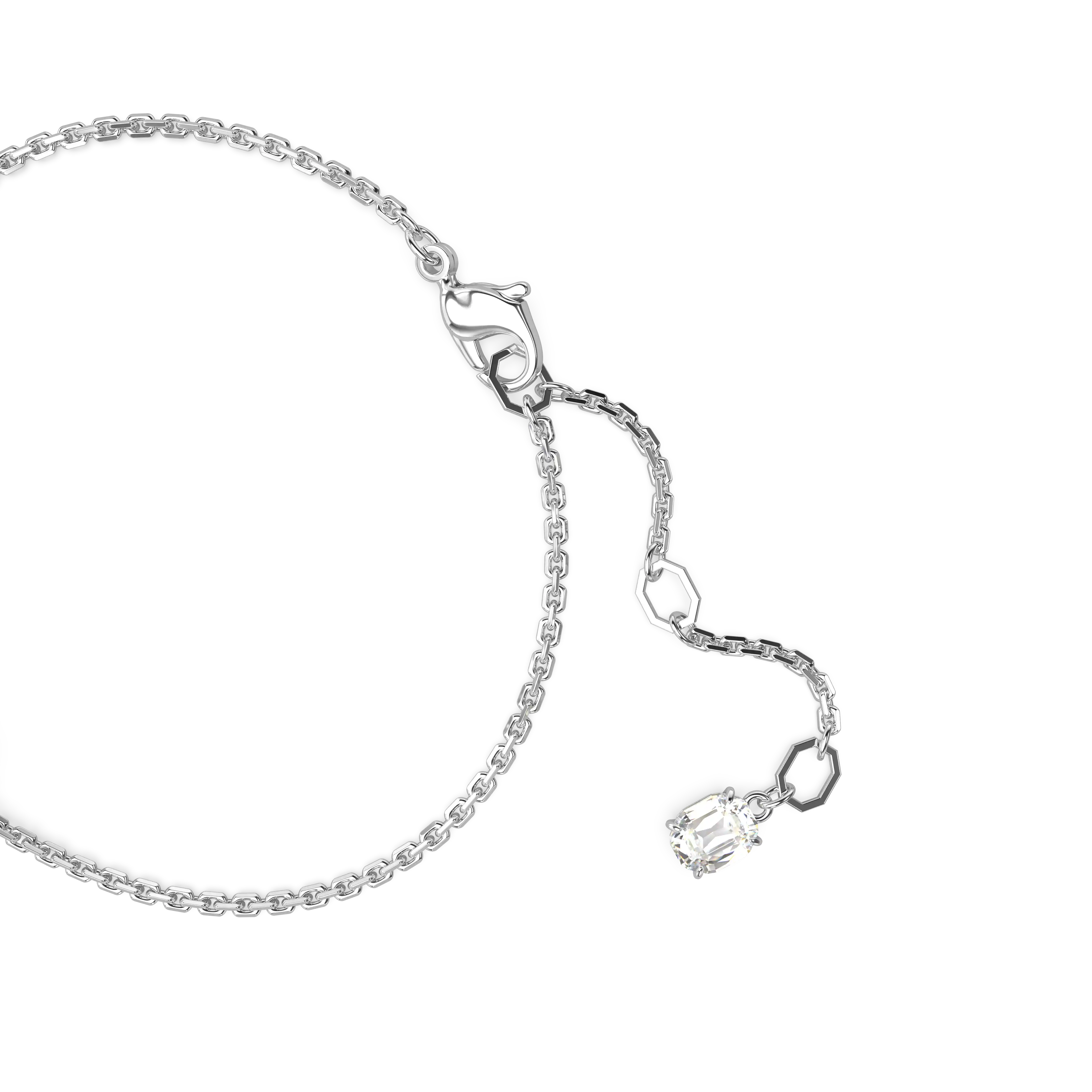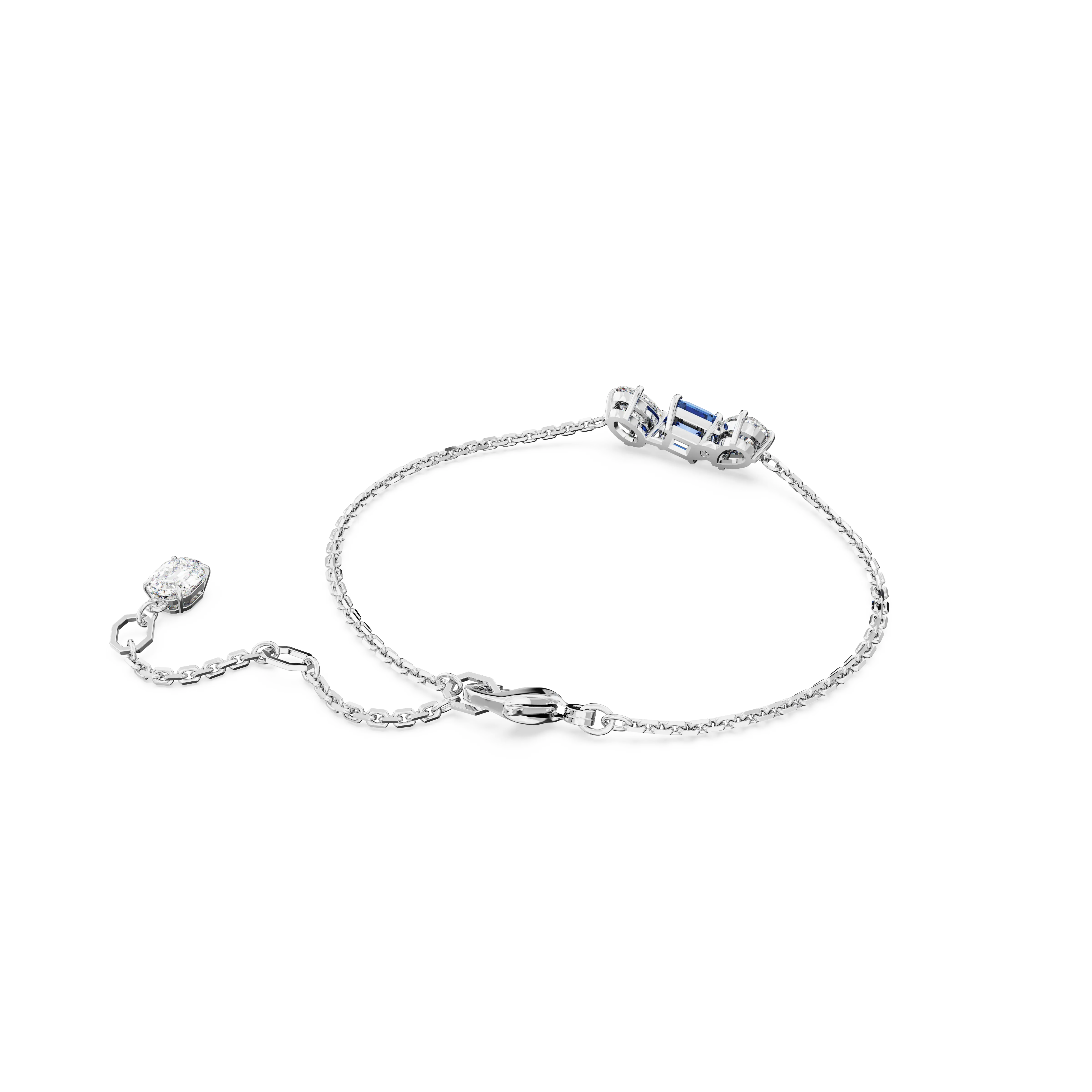 Accented with a vibrant flourish of color,this Mesmera bracelet is ready to impress. The rhodium plated design is worn on a delicate chain with a hanging elongation and features a trio of prong-set Swarovski Zirconia in varying shapes,including a central square stone in bright blue. A bold mix of cuts that would make a wondrous gift.