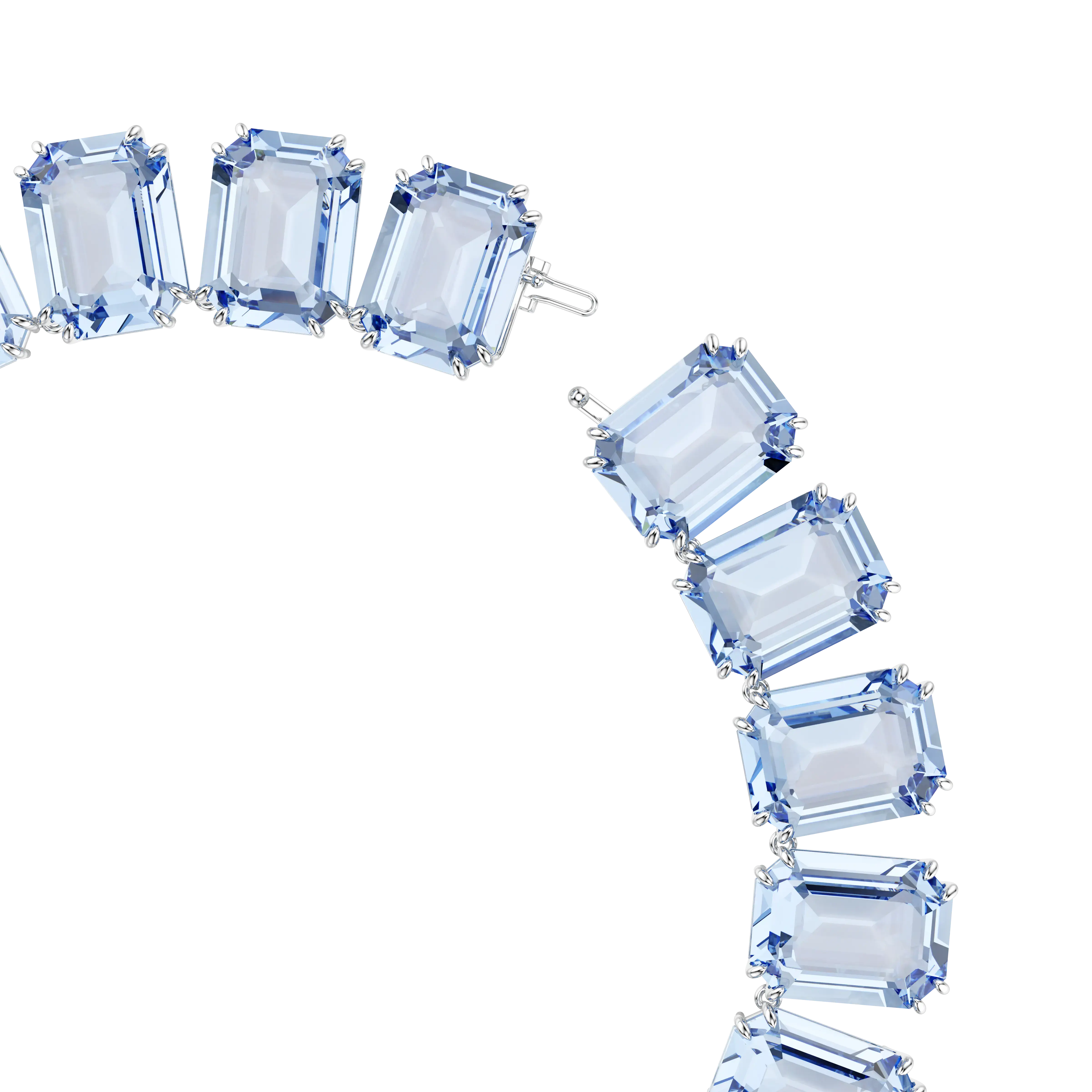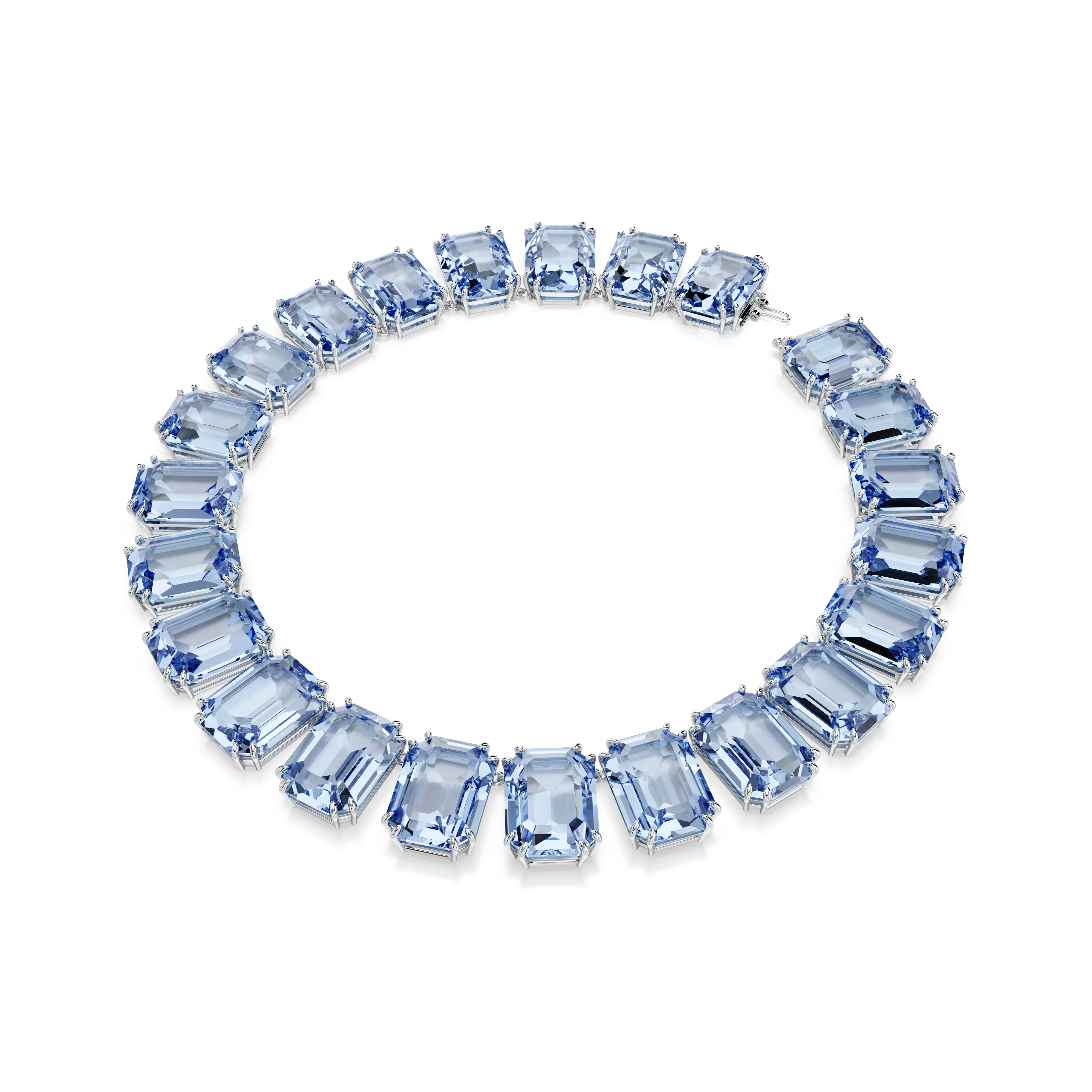 Discover your new wardrobe essential with this elegant necklace,designed with a row of periwinkle blue octagon cut crystals,cradled in rhodium plated prong settings. Finished with a hidden closure for a seamless effect,a simple white T-shirt and pair of blue jeans take on a new life,once you add this necklace as a finishing touch. This necklace is part of the Millenia family,designed by Creative Director Giovanna Engelbert for Collection I. How to close and open it: place the rounded baton into the widest point of the opposite hole and slide it down to the lowest point. Once in place,lower the D-ring security catch on top to secure the fastening. To open,lift up the D-ring security catch and slide the baton towards the widest point to release.