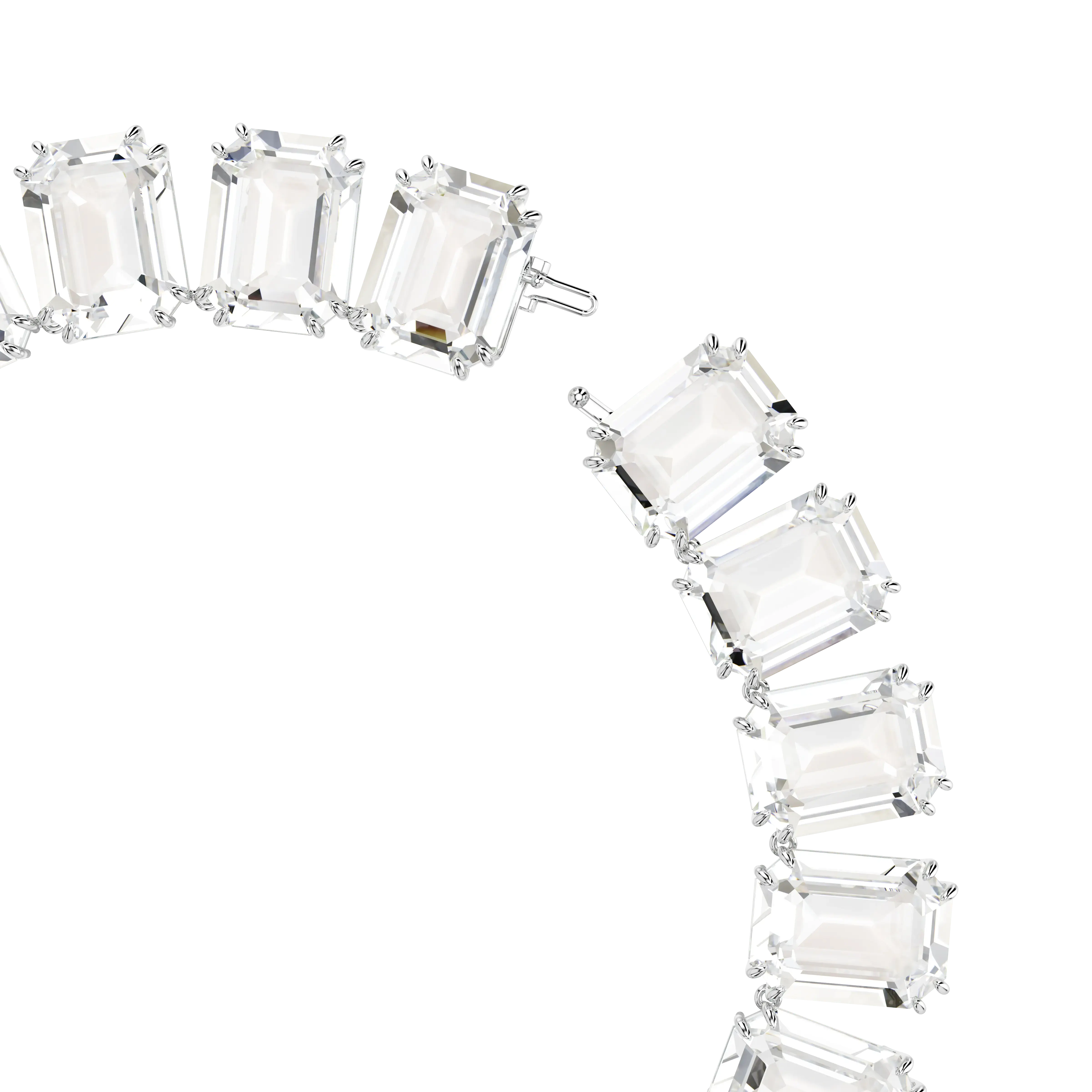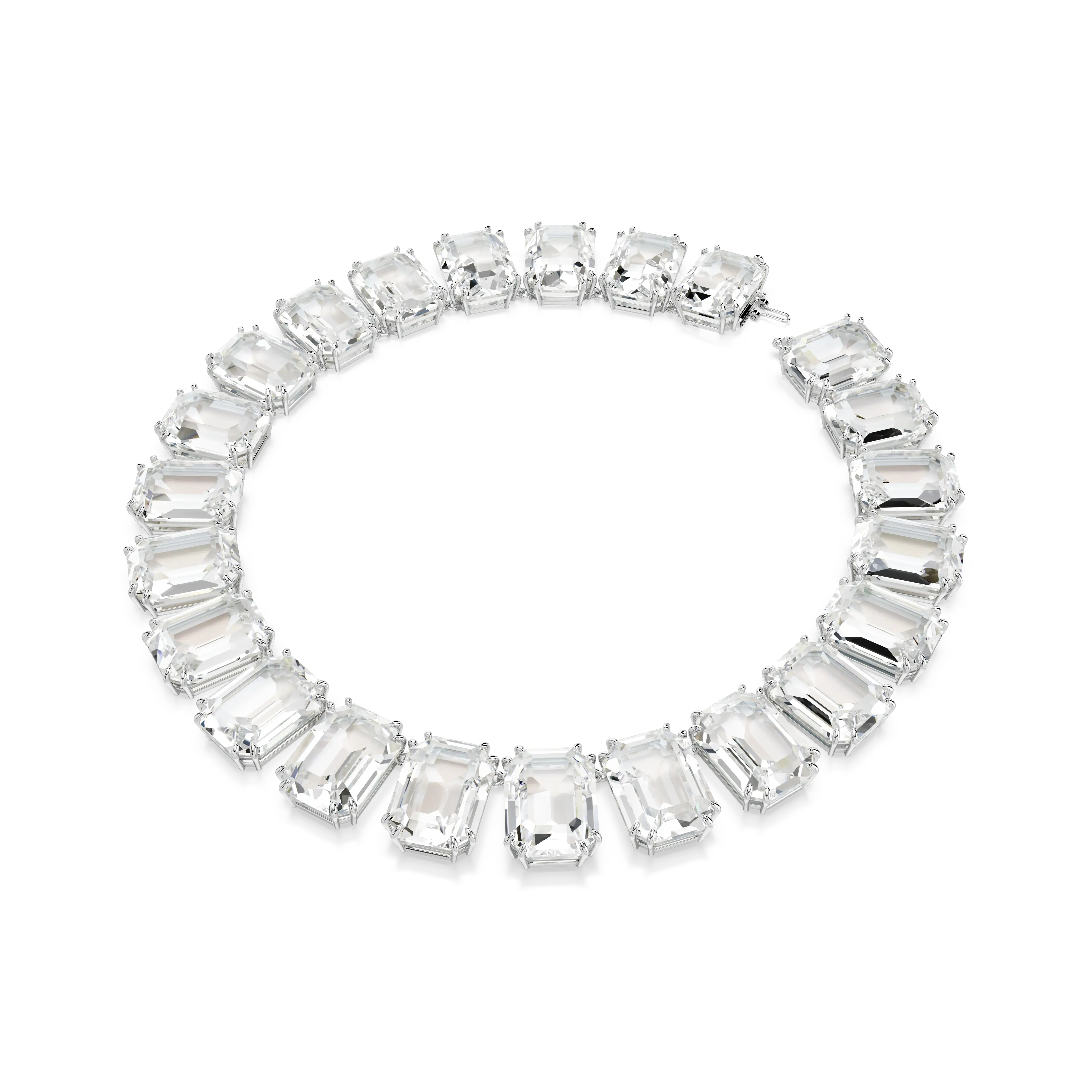 An elegant wardrobe essential,this clear crystal necklace is perfectly crafted with uniform octagon cut crystals on a silver tone plated prong setting and finished with a hidden fastening. Team with coordinating earrings from the Millenia family and a black dress for evening,or wear solo with a simple white t-shirt for daytime adornment with an ultramodern twist. This necklace is part of the Millenia family,designed by Creative Director Giovanna Engelbert for Collection I. How to close and open it: place the rounded baton into the widest point of the opposite hole and slide it down to the lowest point. Once in place,lower the D-ring security catch on top to secure the fastening. To open,lift up the D-ring security catch and slide the baton towards the widest point to release.