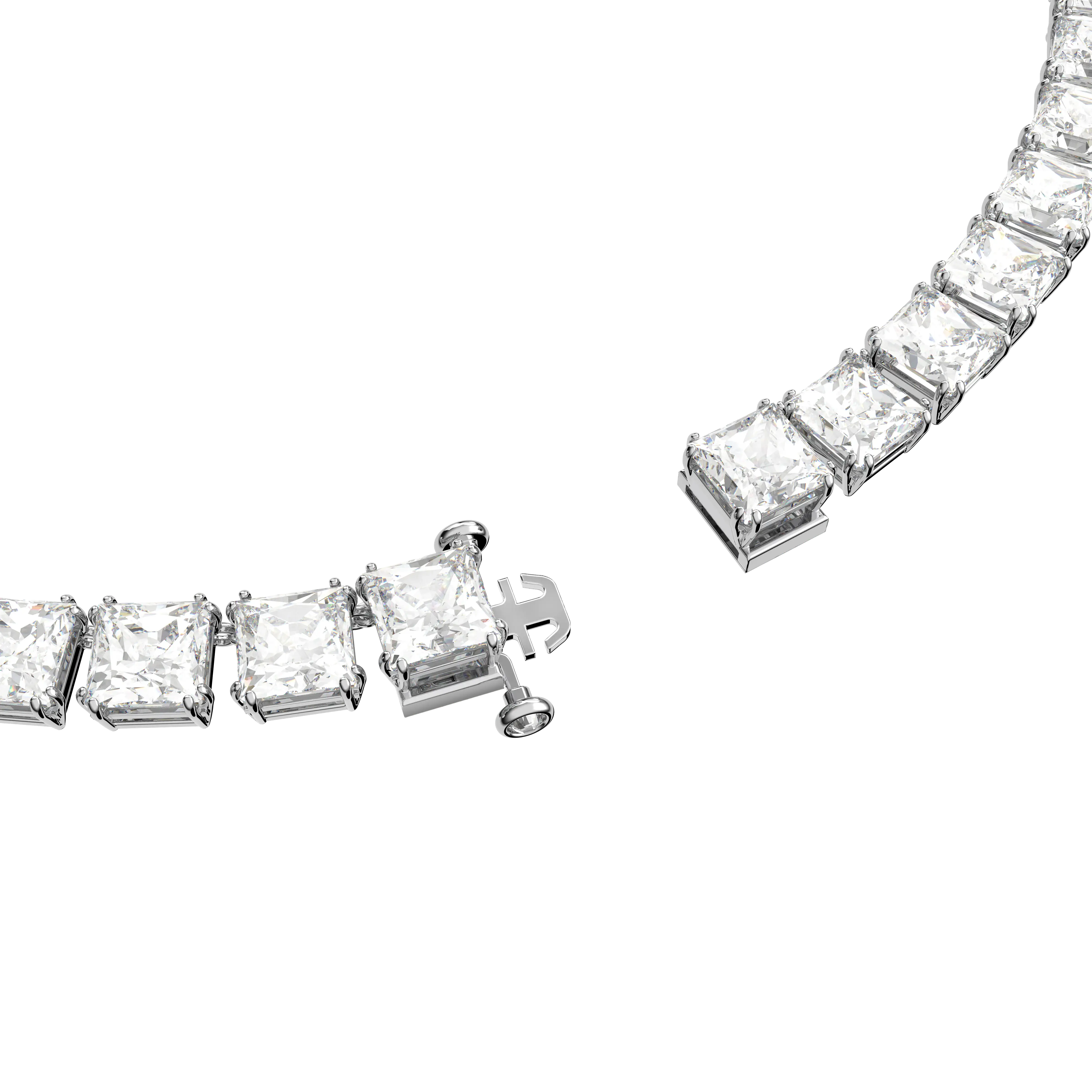 This quietly glittering Tennis necklace will never go out of style,day or night. Elegant and refined,it features square cut clear stones encased in sleek rhodium plated settings. Wear it to elevate a simple white T-shirt and jeans,or with evening pieces for an effortless touch of glamor. This Tennis necklace is part of the Matrix family,designed by Creative Director Giovanna Engelbert for Collection I. How to close and open it: slide the hooks into the corresponding holes at the base of the end stone and push to click into place. Fasten the security chain using the small lever clasp. To open,unfasten the security chain and press the buttons on either side of the stone at the same time to release the hooks.