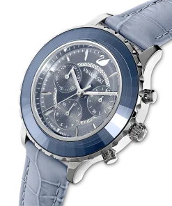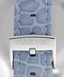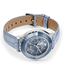 The Octea Lux Chrono is a landmark design in watchmaking and crystal craftsmanship,and this on-trend colorway sparkles with brilliant intensity. The stainless steel case provides a sporty backdrop to Swarovski’s exclusive crystal bezel,which gleams in dazzling denim blue. A matching dial and crocodile-embossed Italian calf-skin leather strap complete the cohesive look. Featuring three dial counters and the Swarovski swan at 12 o’clock,this modern chronograph matches luxury with precision. Made in Switzerland,it is water-resistant to 50m. Swiss Made.