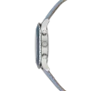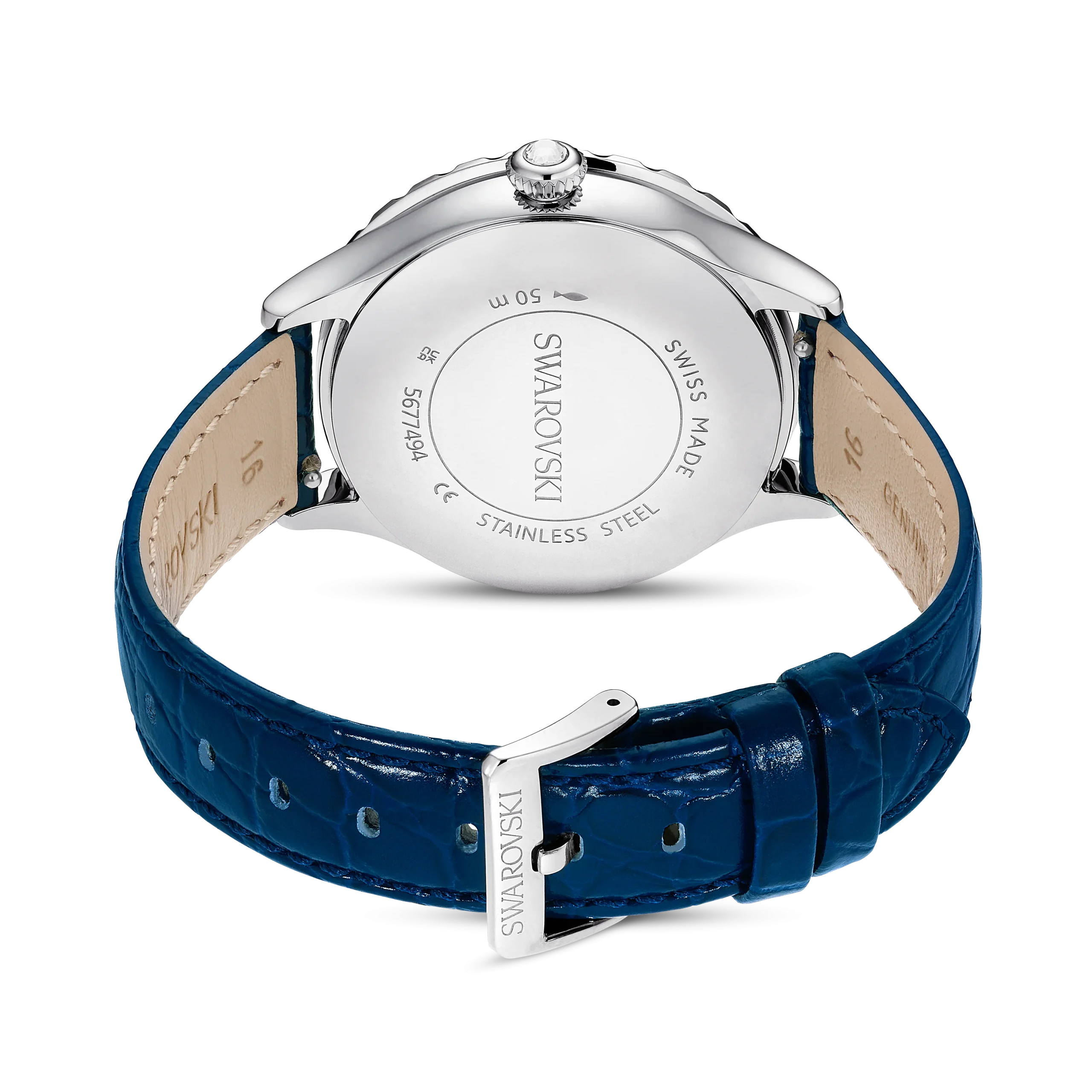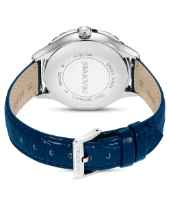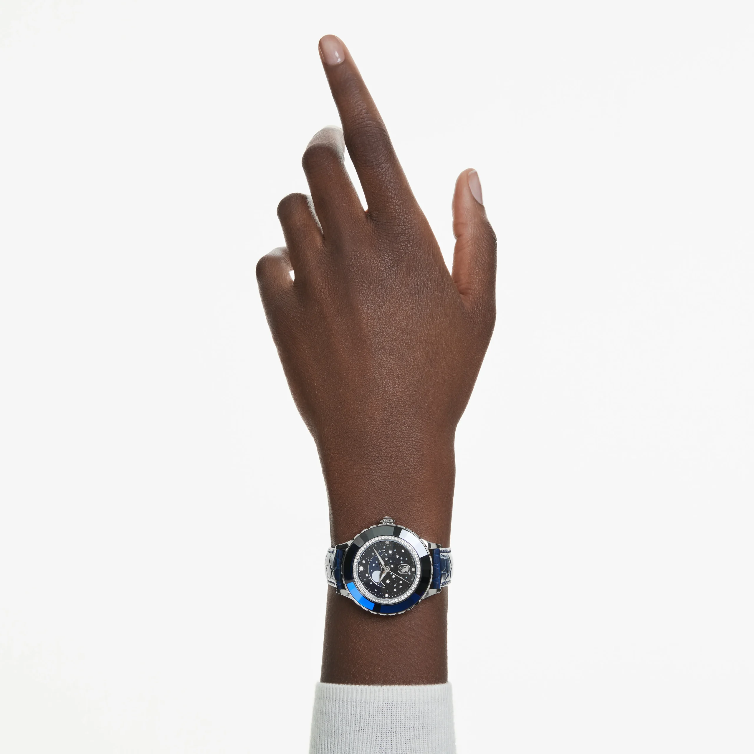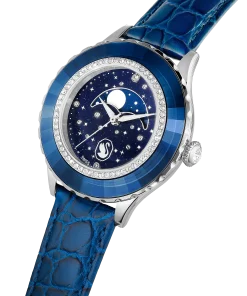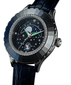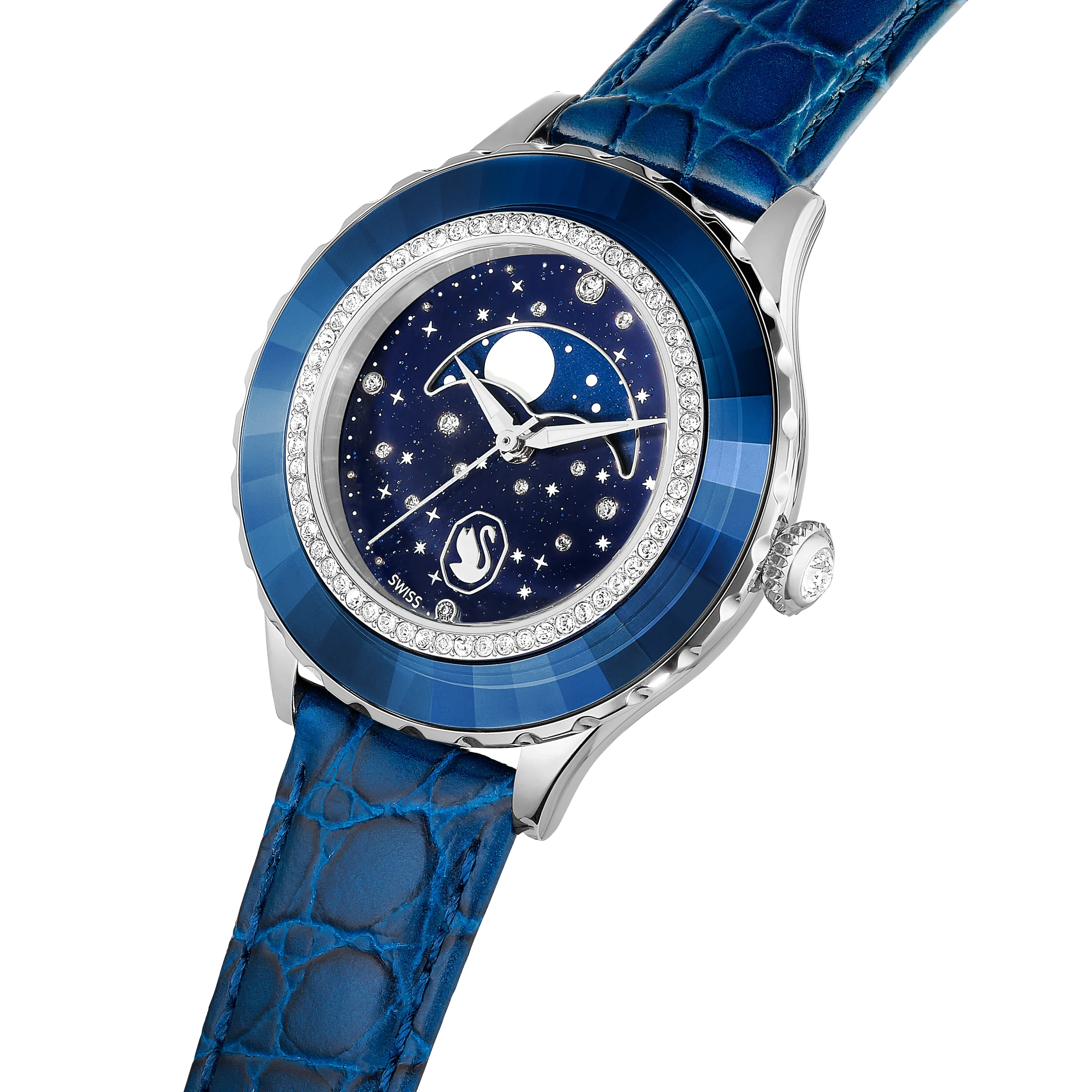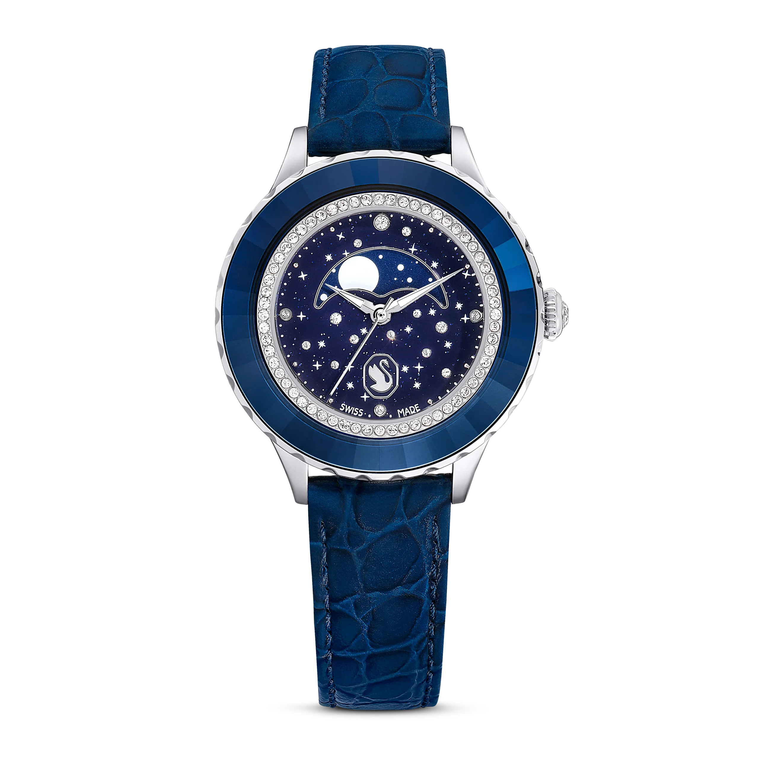 In tribute to the 55th anniversary of the first moon landing,this Octea Moon watch exquisitely links the passage of time with the lunar cycle. The 37mm stainless steel case is mounted with a faceted bezel in blue crystal,along with an inner ring of shimmering pavé. This frames the dark blue dial,which is majestically decorated with 11 round-cut crystals to represent a star-filled cosmos. Four more crystals serve as quarter-hour index markers. The captivating moon phase function sits just above the Luminova hands,while an elegant swan logo is positioned at 6 o’clock. Around the wrist,this watch is worn on an Italian calfskin leather strap,which is embossed with a crocodile pattern and enhanced with a quick-release system. This Swiss made timepiece is water resistant to 50 meters and is a spectacular statement piece with intergalactic appeal.