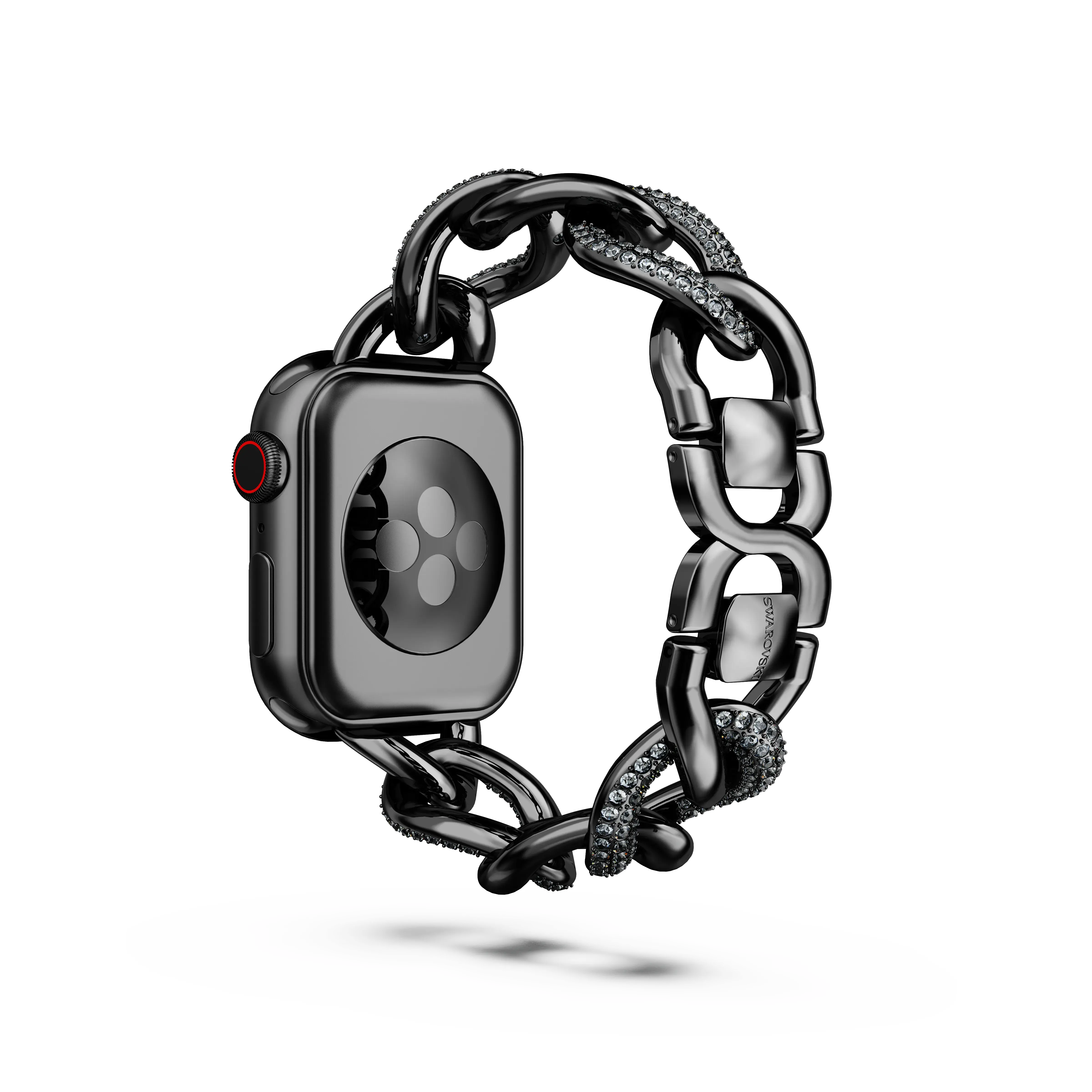 Keep time in style with this striking strap striking strap crafted for compatibility with Apple Watch®. The eye-catching design features a chain of PVD black tone,with every second link adorned in silver night crystals . Style with your Swarovski jewelry. This strap suits Apple Watches® sized 40mm or 41mm,including Series 4 – 9 and SE. Apple Watch® is a trademark of Apple Inc. This product is delivered with a standard size bracelet and two additional links,enabling it to be made longer or shorter with the help of our instore staff.