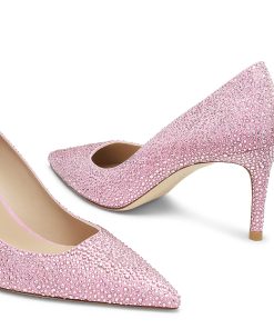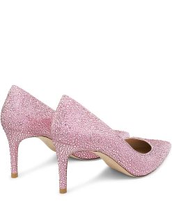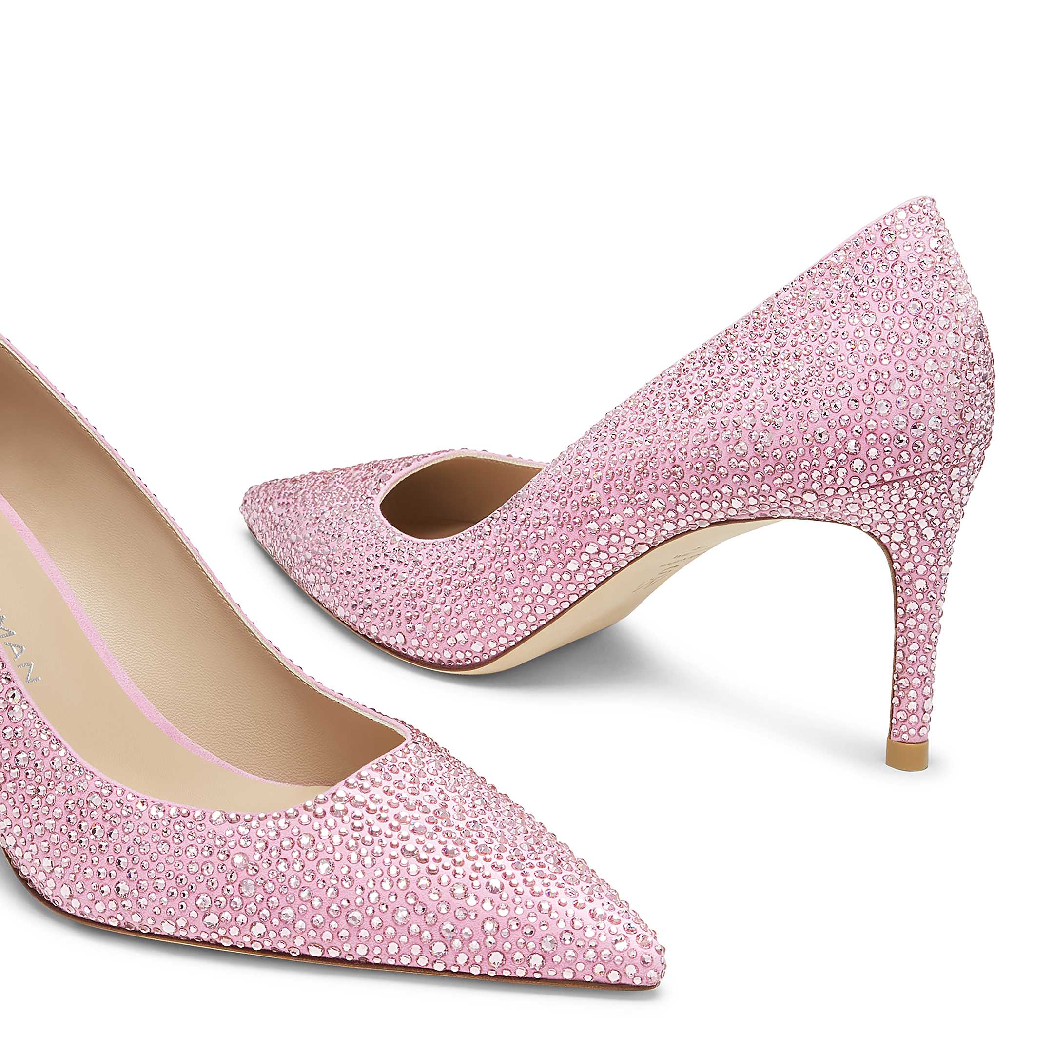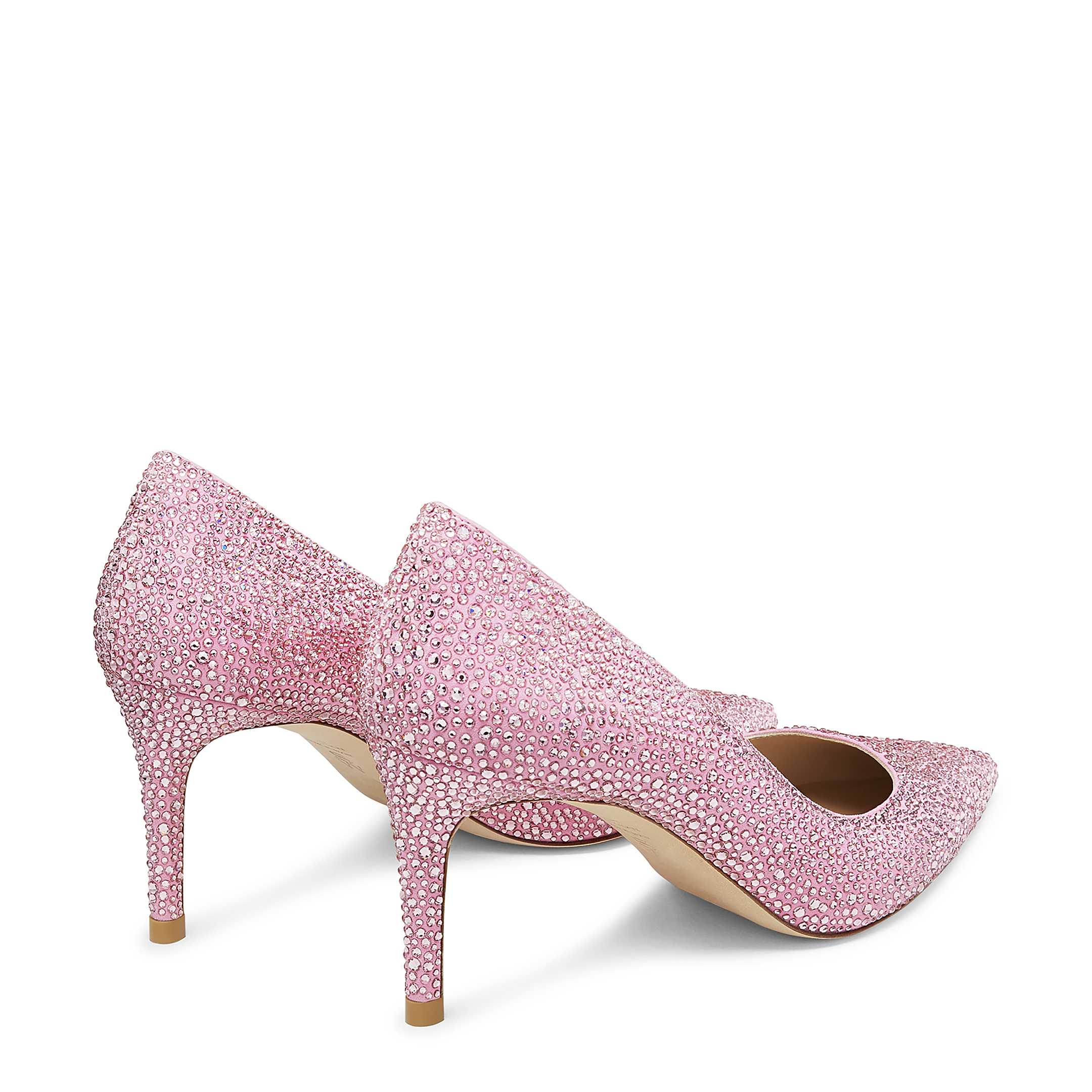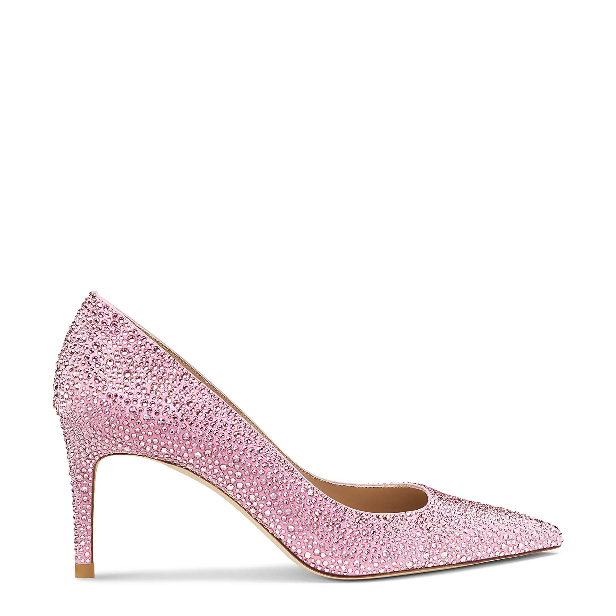 This limited-edition STUART POWER SHINE pump,created in collaboration with the Swarovski Creators Lab,delivers a high-shine,high-glam take on the new icon,the STUART POWER 75 pump. Meticulously crafted by expert artisans in Spain,each pair is adorned with over 6,000 pink Swarovski pavé crystals. The silhouette features a modernized construction for maximum style and comfort,including a reworked 75mm stiletto heel set on a subtle angle for extra support. Make every step striking in this dazzling pump.