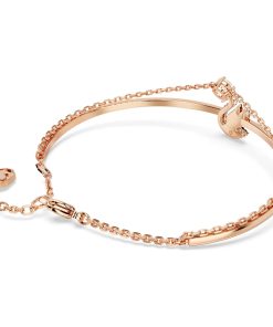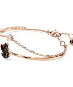 Adorn your wrist with the beauty of Swarovski’s signature emblem. This rose gold-tone plated jewelry features a rigid band with an elegant swan motif,expertly decorated with a pavé of jet black Swarovski ReCreated™ crystals. A secondary chain is also attached with a clear Swarovski Zirconia at the center. Intense yet radiant,this bangle is a perfect way to inject your style with intrigue.